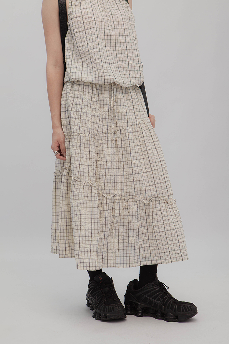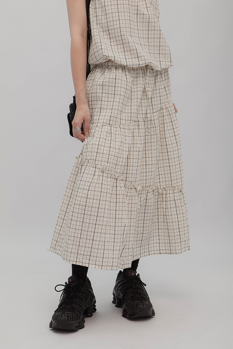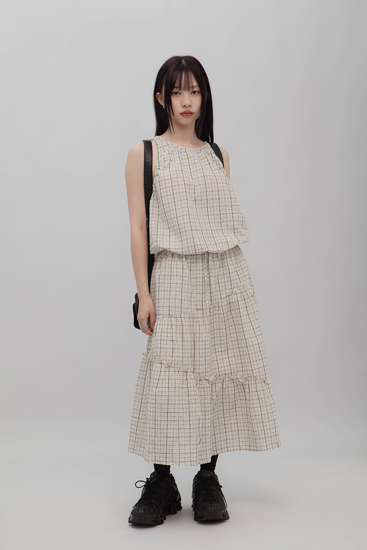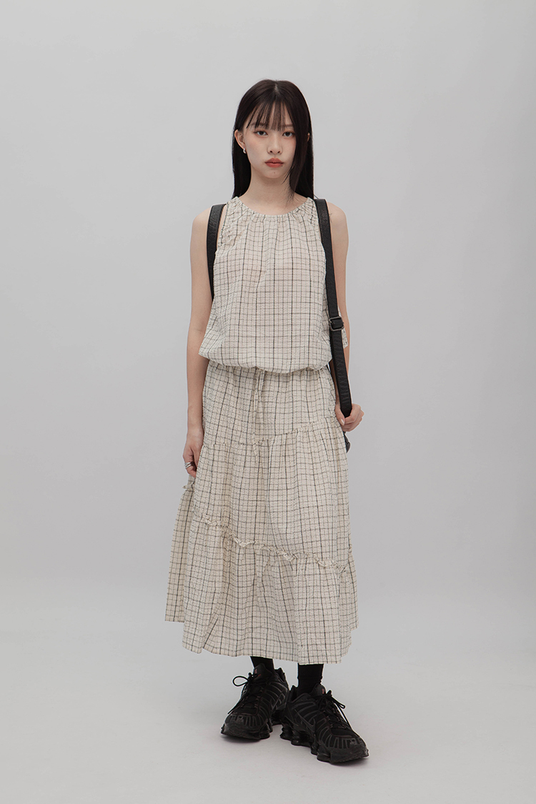 米白色和黑色格紋相間,泡泡肌理感,親膚透氣,成套搭配引人注目,輕鬆打造夏日造型,每天多一點浪漫。