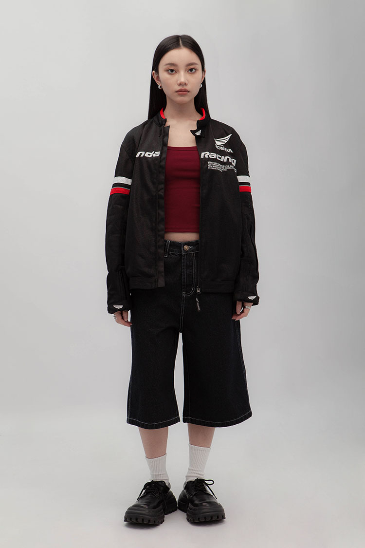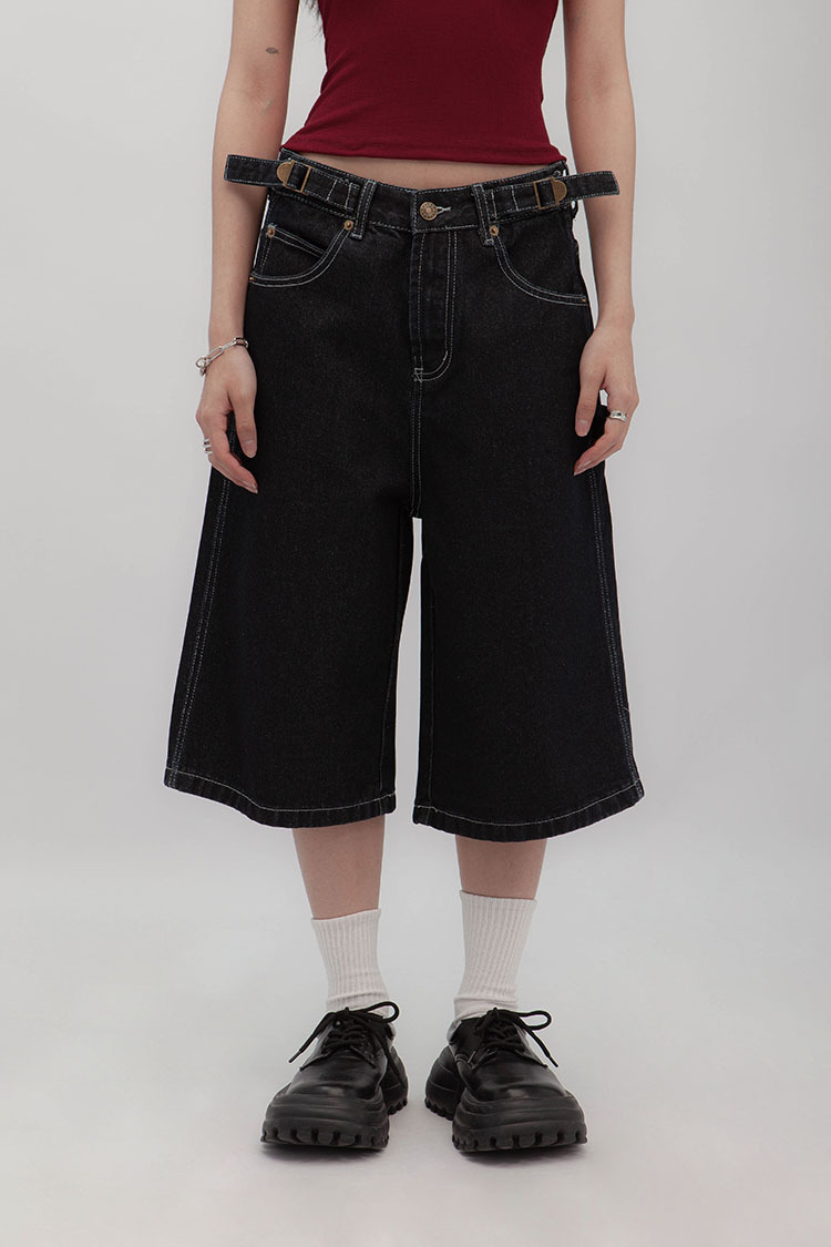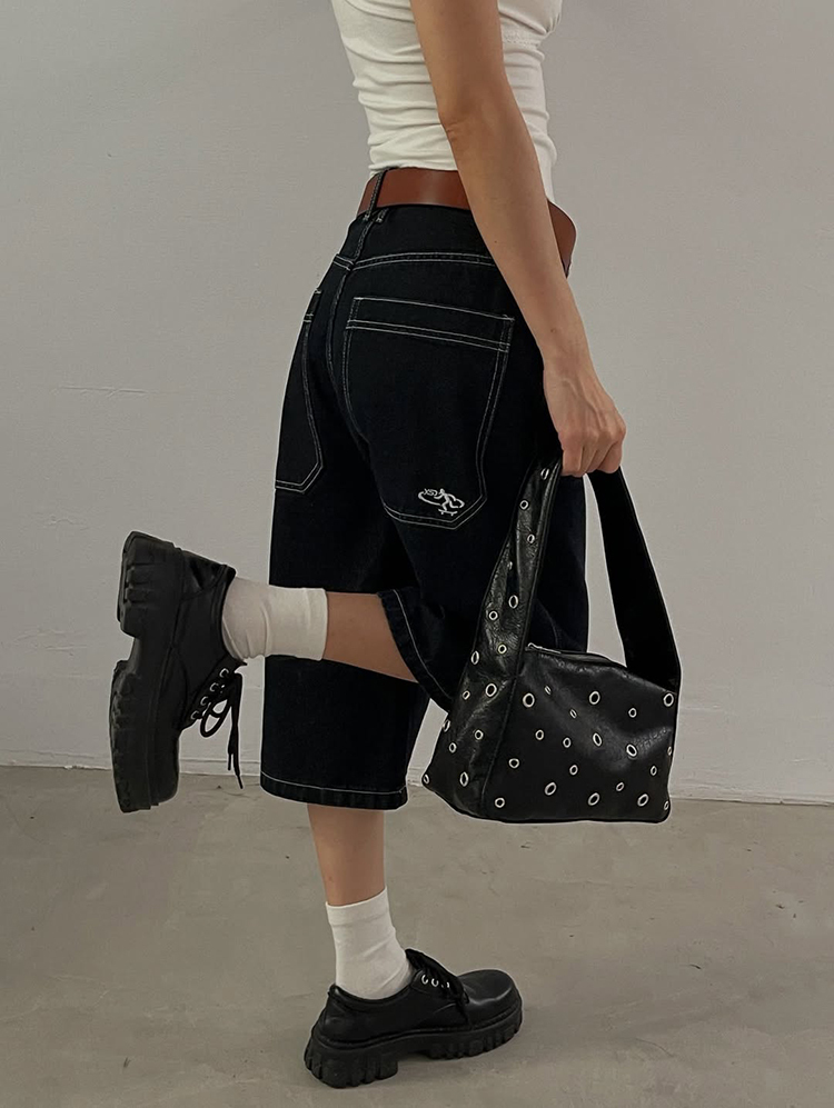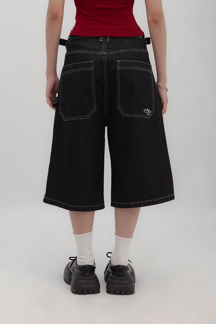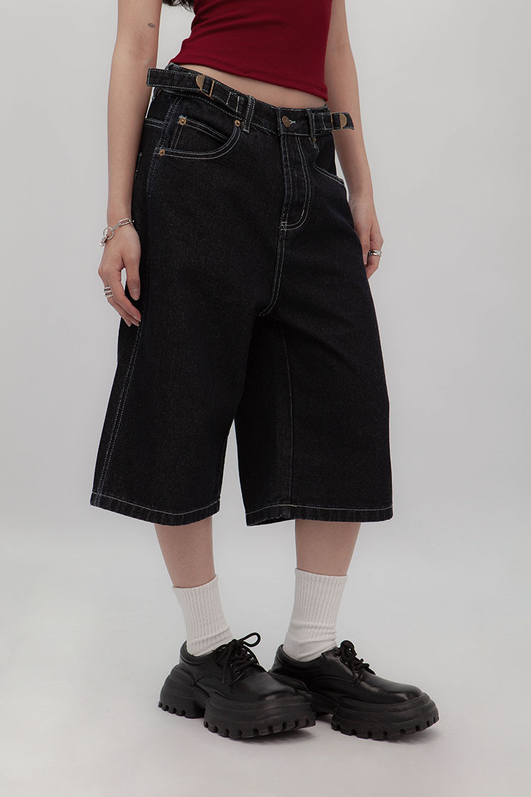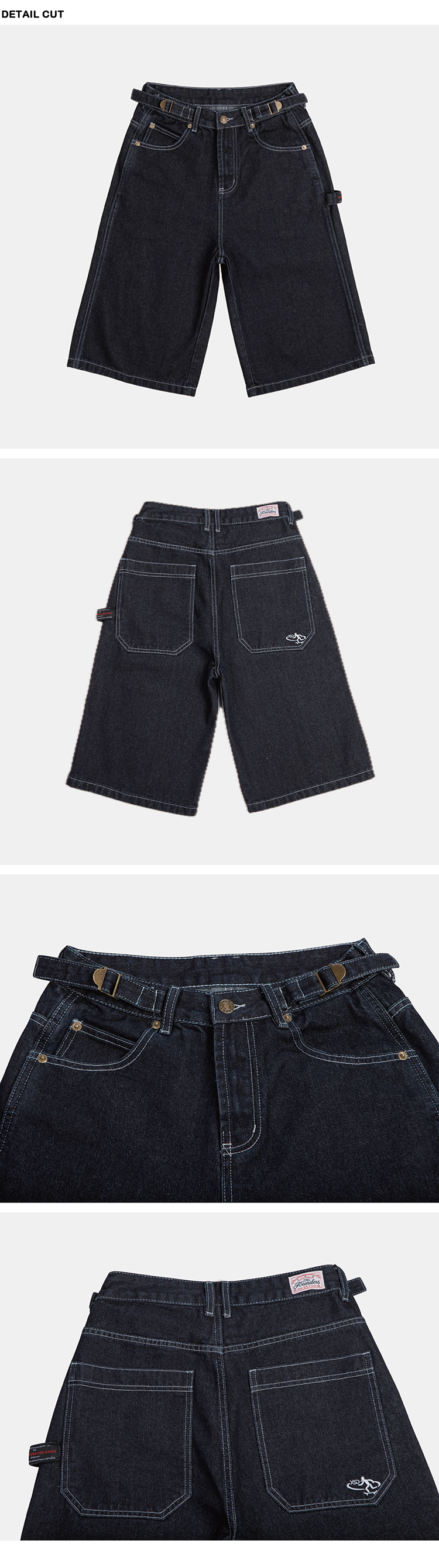 街頭輪廓為靈感,版型採用七分直筒剪裁,打造寬鬆份量感。褲頭附可調節式織帶設計,強化視覺層次與實穿機能,接近中高腰剪裁搭配挺版斜紋布料,呈現乾淨俐落的率性風格。深藍經紗搭配白色緯紗,褲面隱約透出經典雙色紋理,展現復古個性。後口袋以對比車線與刺繡點綴,簡約中帶出街頭細節感。