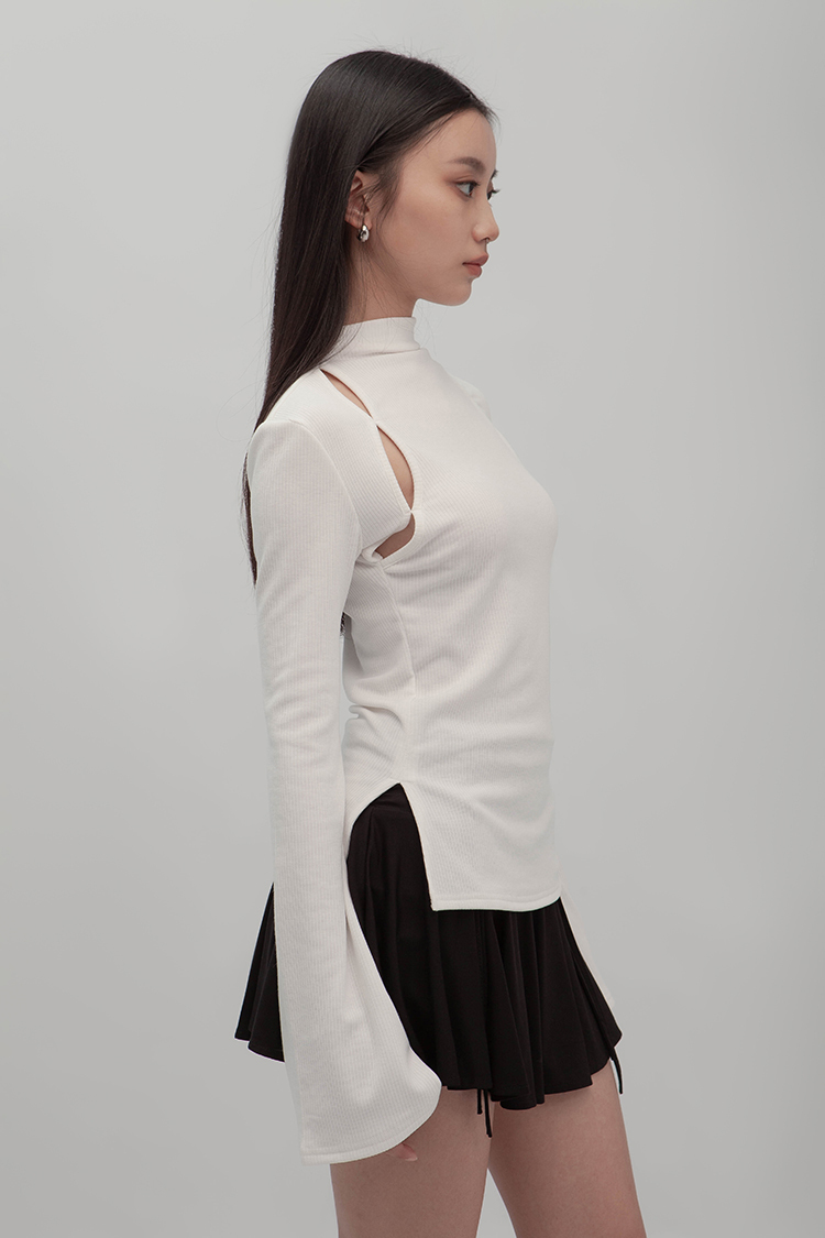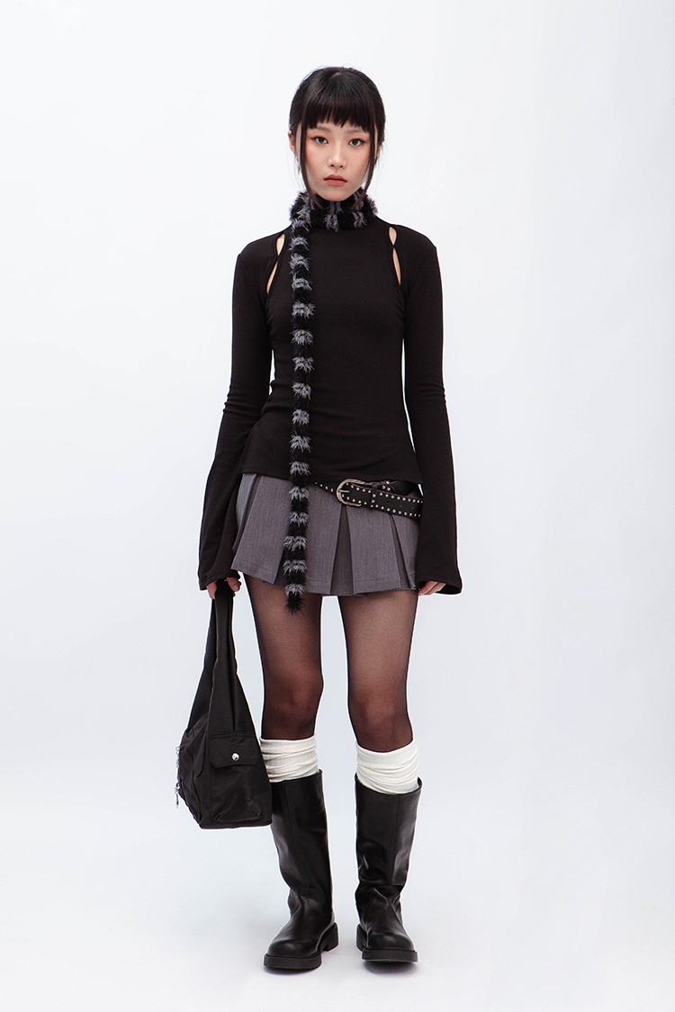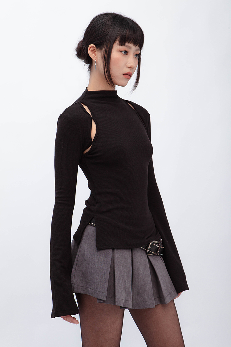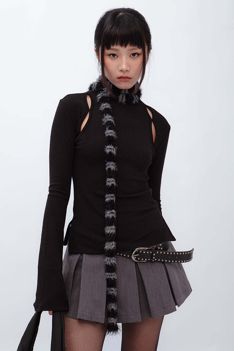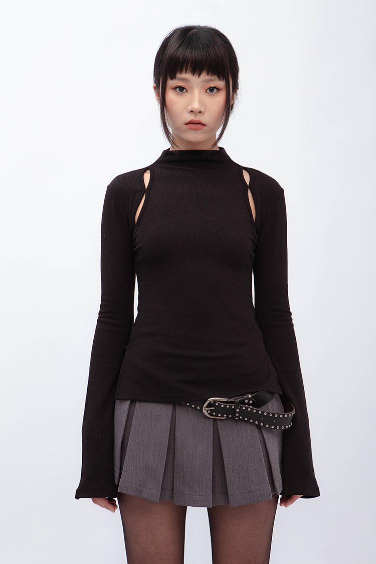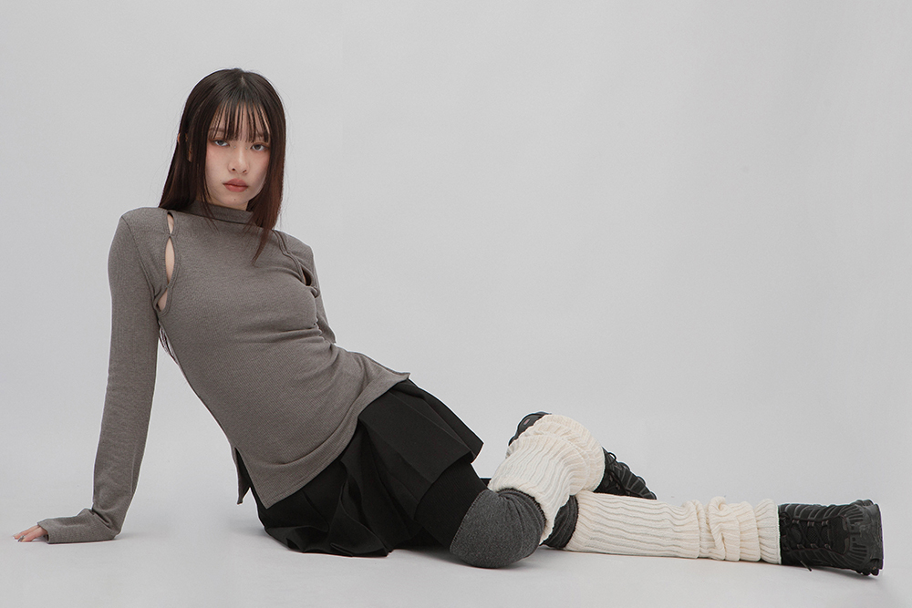 小高領羅紋上衣,鏤空剪裁增加細節,若隱若現的視覺效果,內裡特別採用加絨設計,觸感柔軟且保暖,修身版型突顯曲線,是秋冬必備的單品,為日常穿搭增添性感。