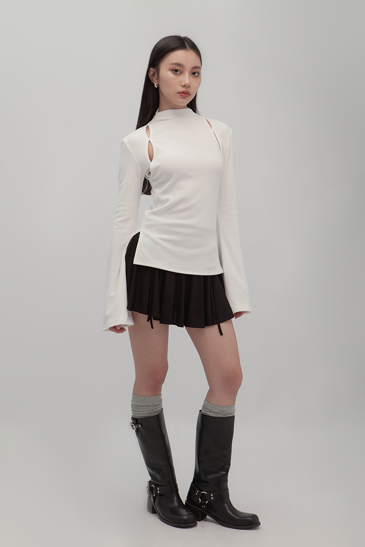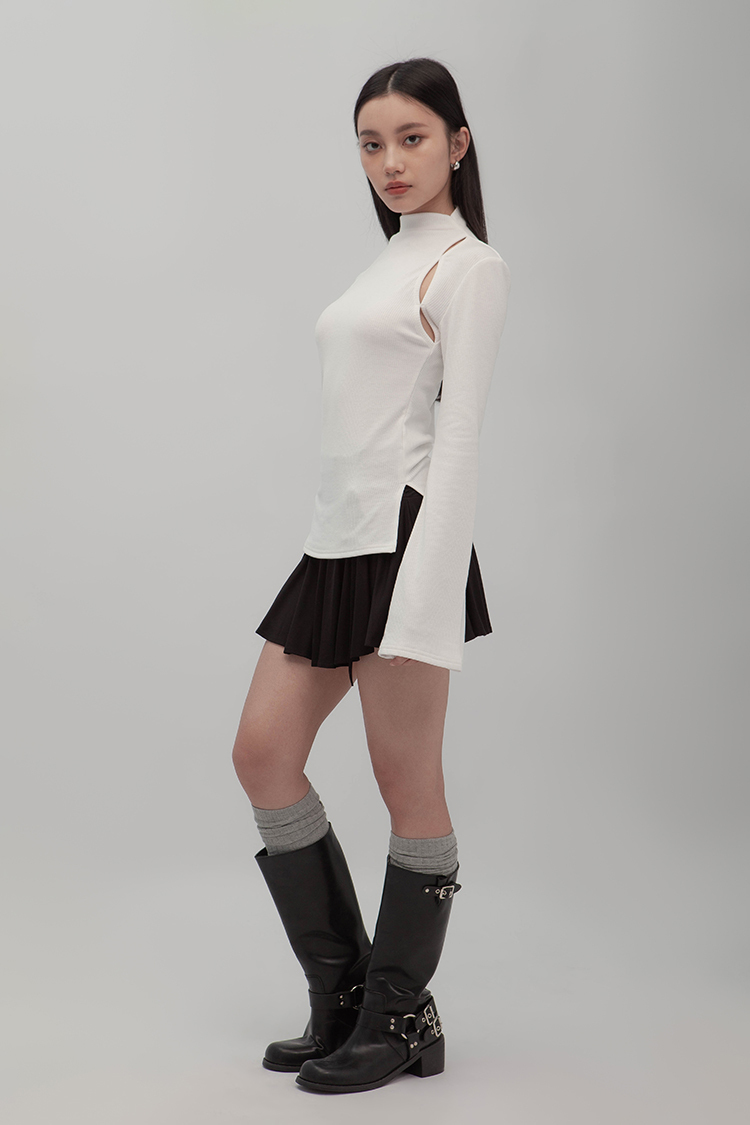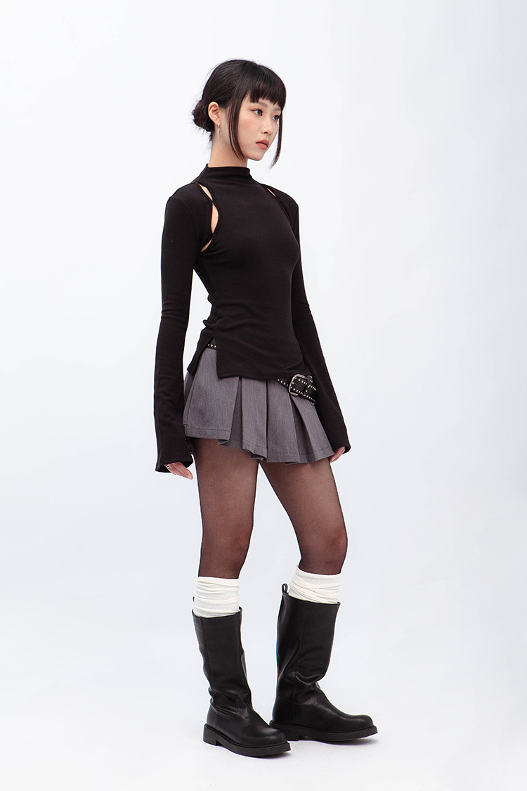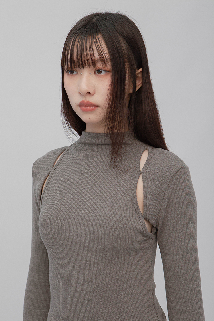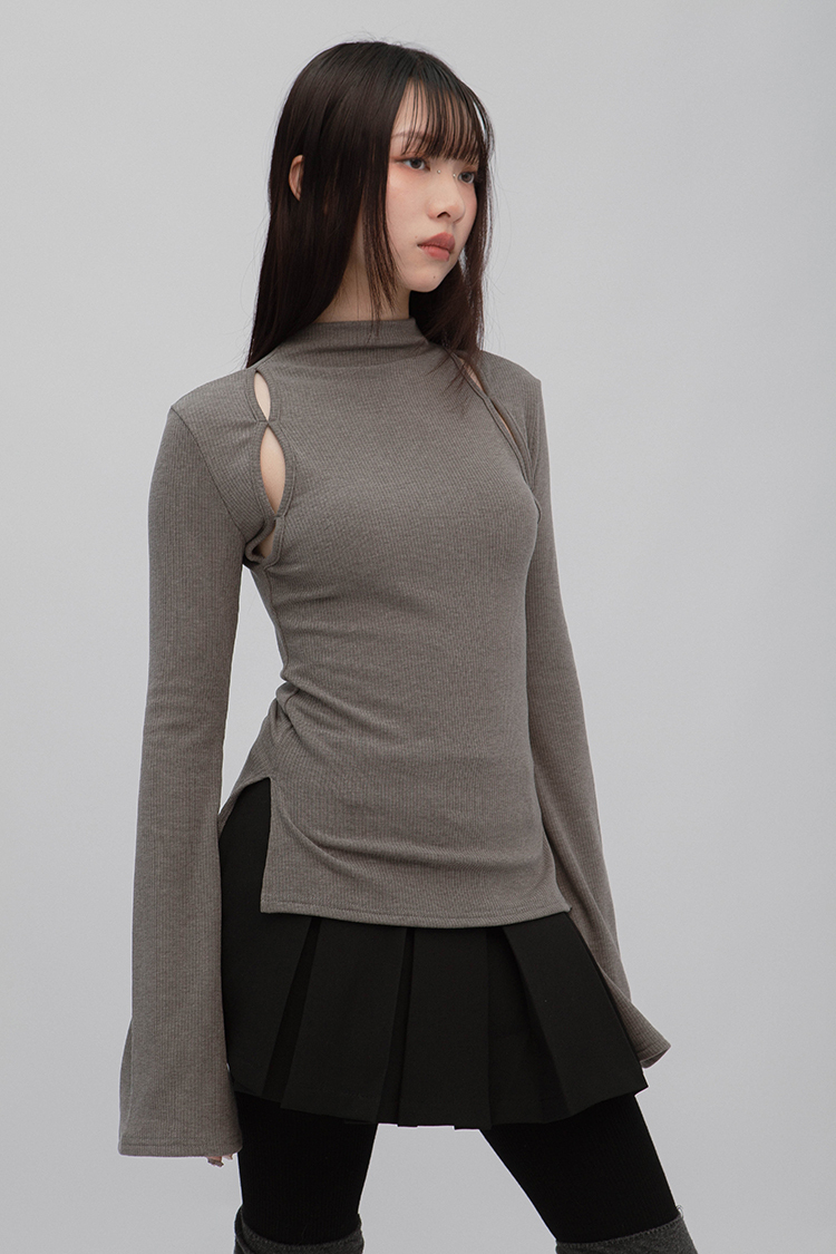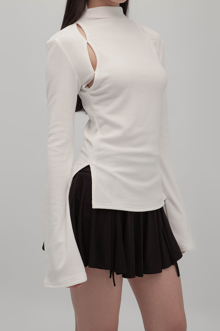 小高領羅紋上衣,鏤空剪裁增加細節,若隱若現的視覺效果,內裡特別採用加絨設計,觸感柔軟且保暖,修身版型突顯曲線,是秋冬必備的單品,為日常穿搭增添性感。