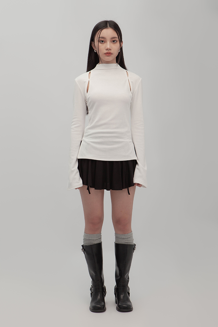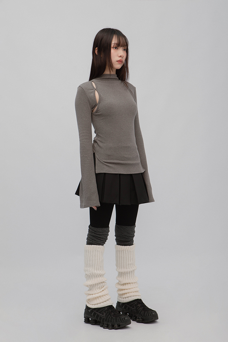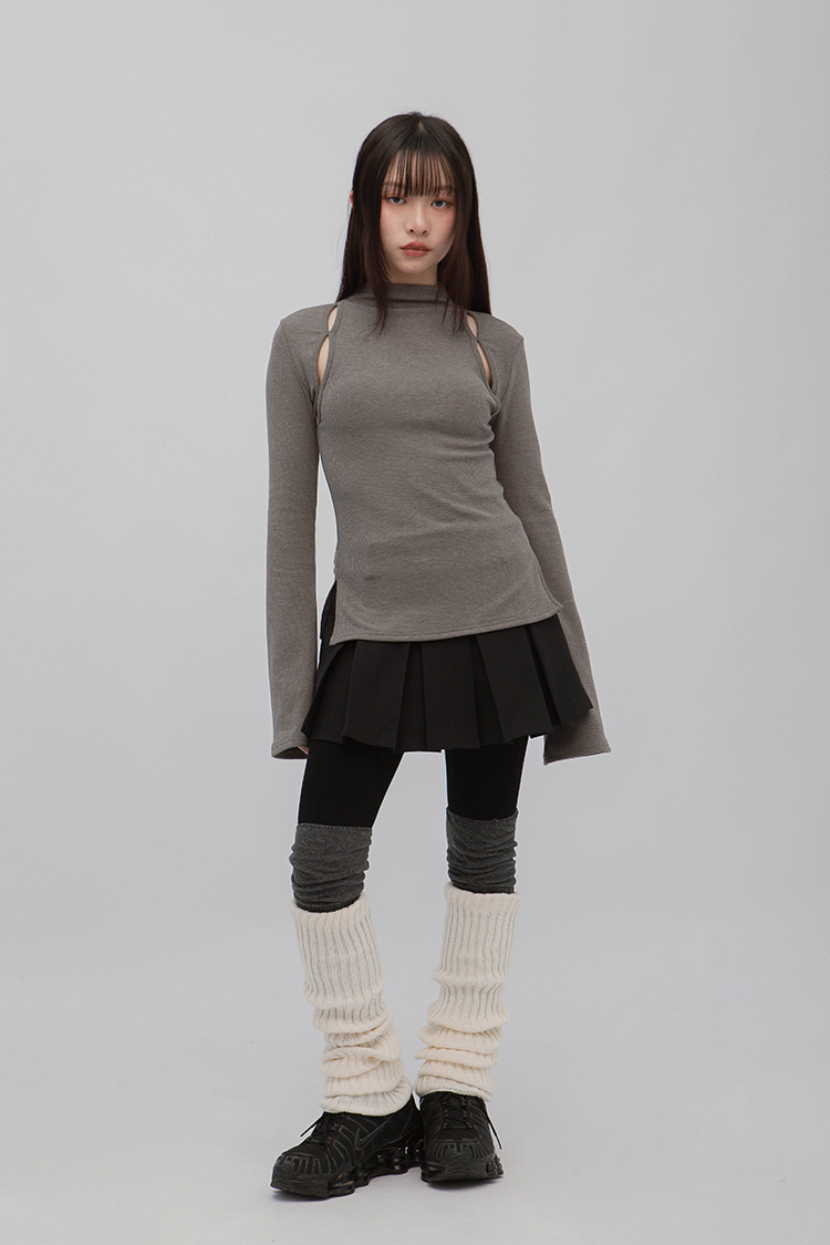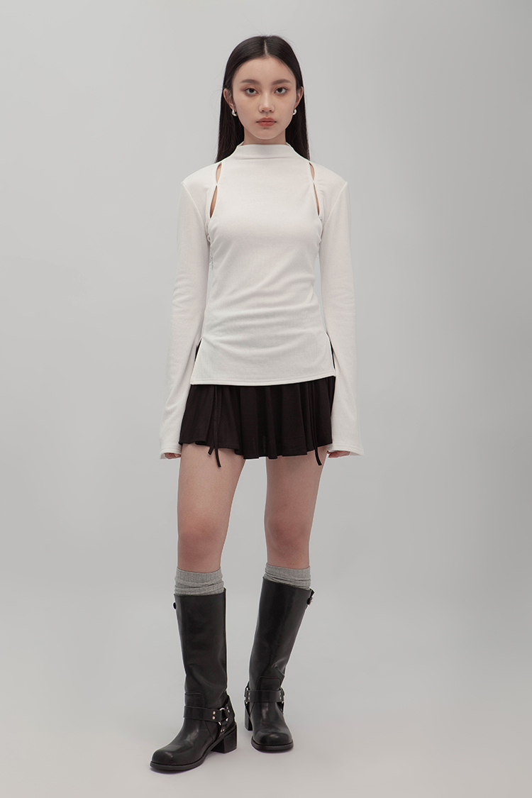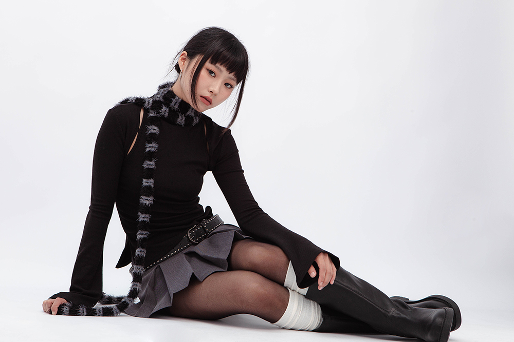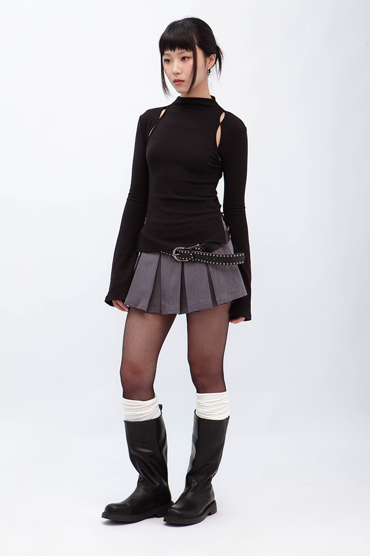 小高領羅紋上衣,鏤空剪裁增加細節,若隱若現的視覺效果,內裡特別採用加絨設計,觸感柔軟且保暖,修身版型突顯曲線,是秋冬必備的單品,為日常穿搭增添性感。
