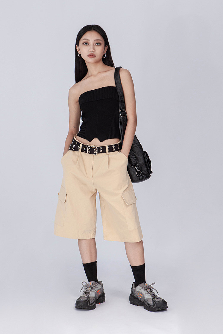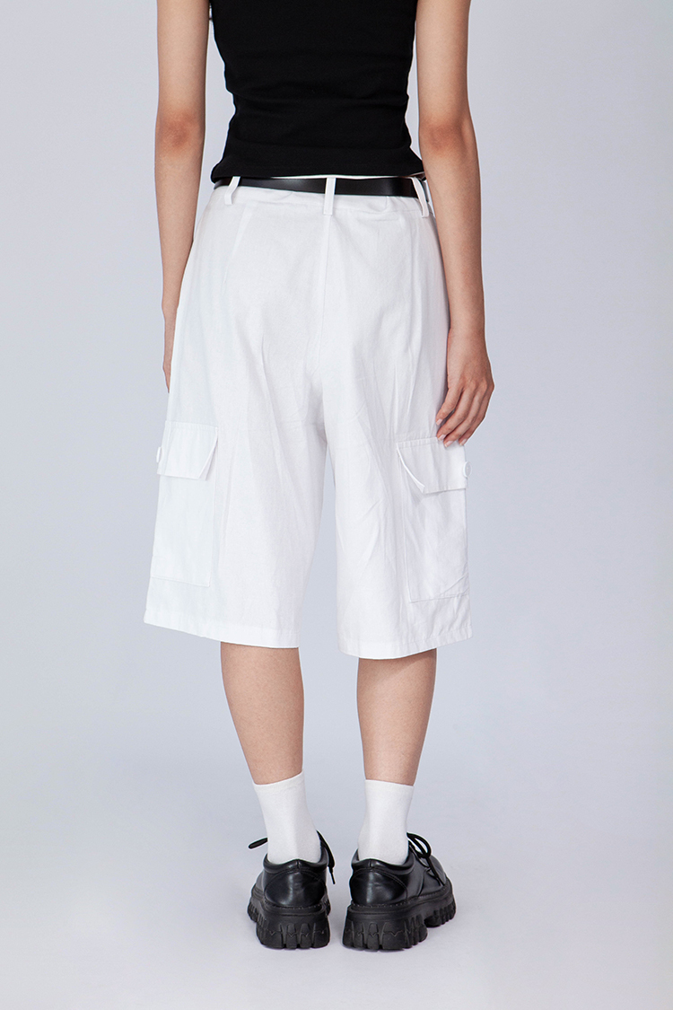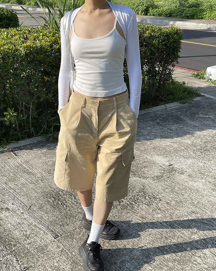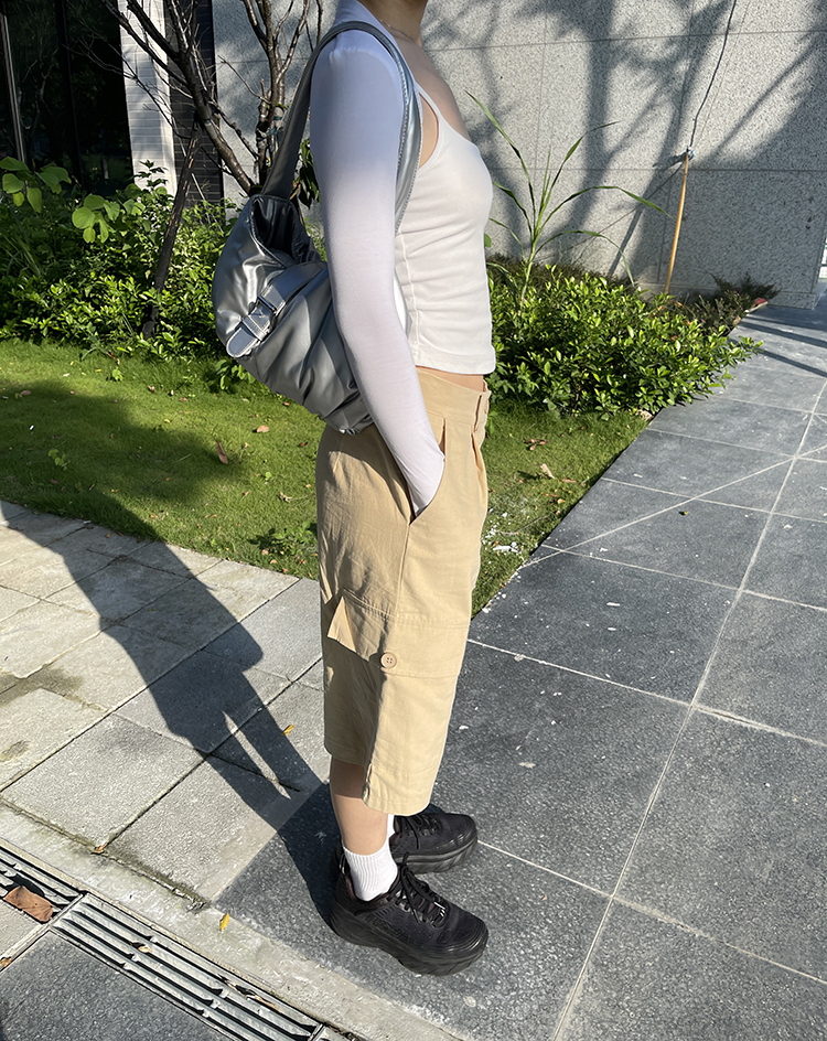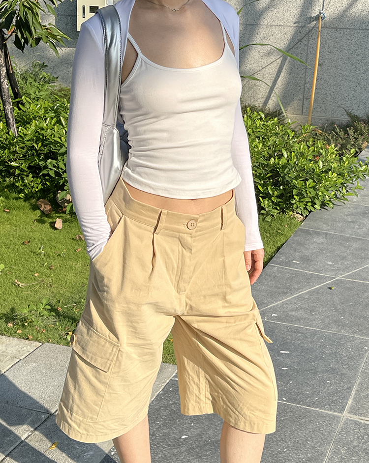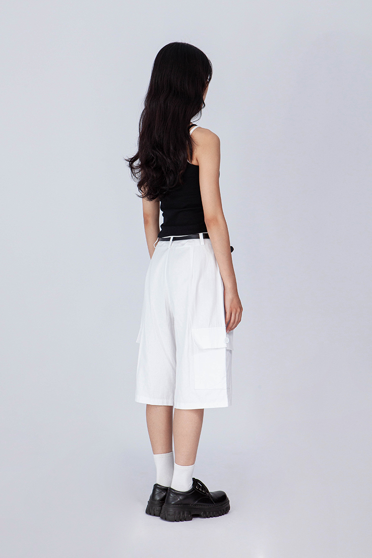 低腰,鈕釦拉鍊閉合,皮帶環,正面對稱打褶細節,兩側斜插袋與翻蓋式口袋,使整體輪廓更加精緻,過膝五分褲,休閒工裝,基礎日常。