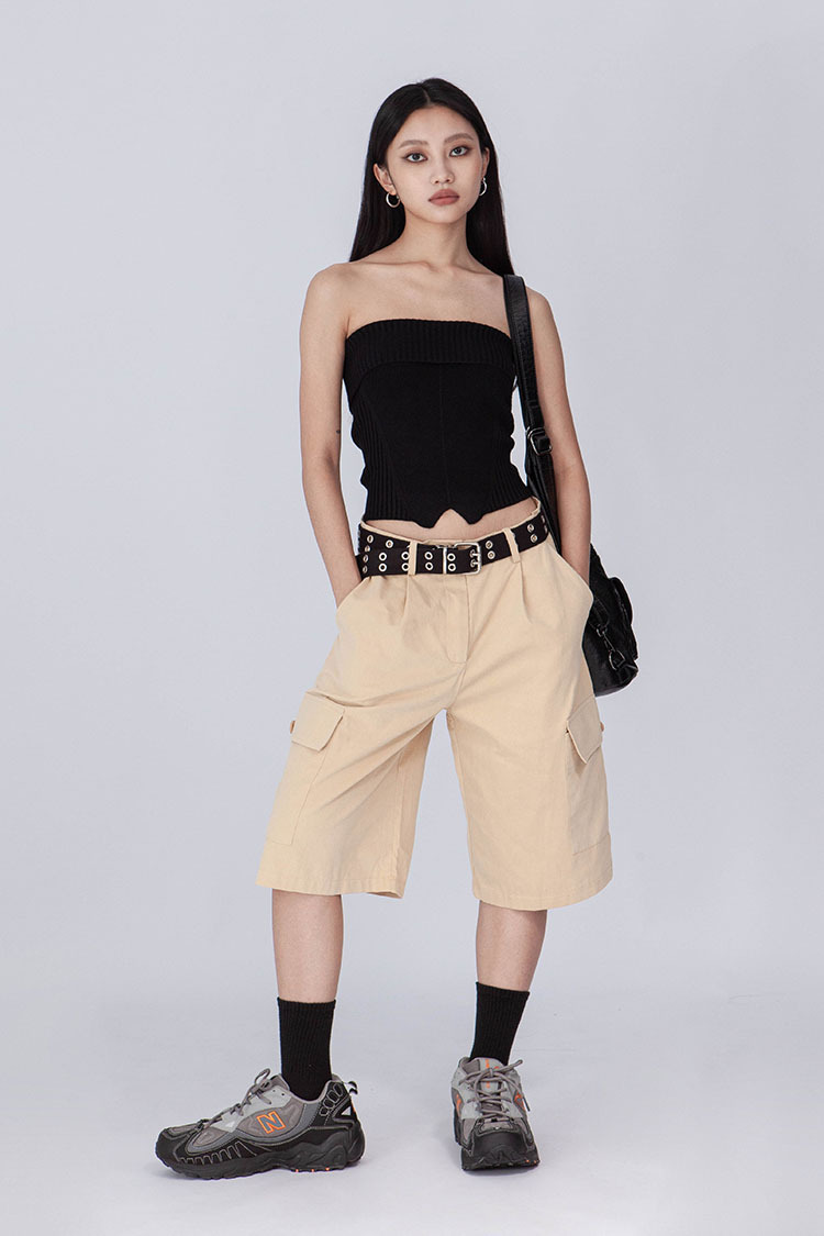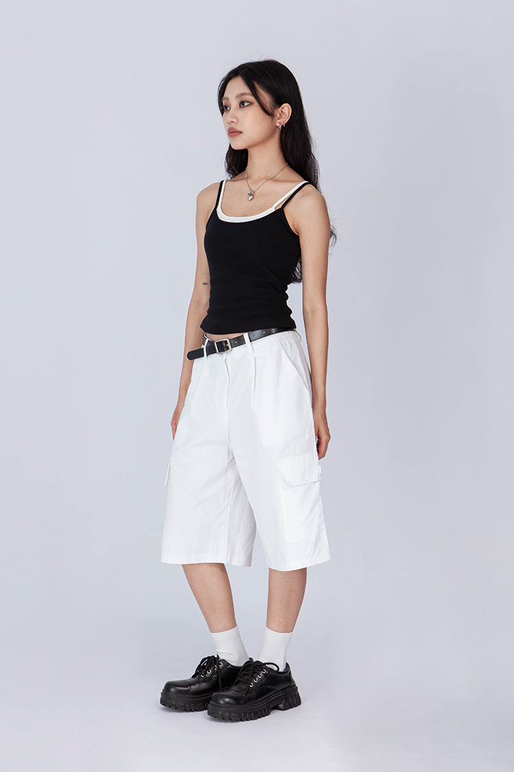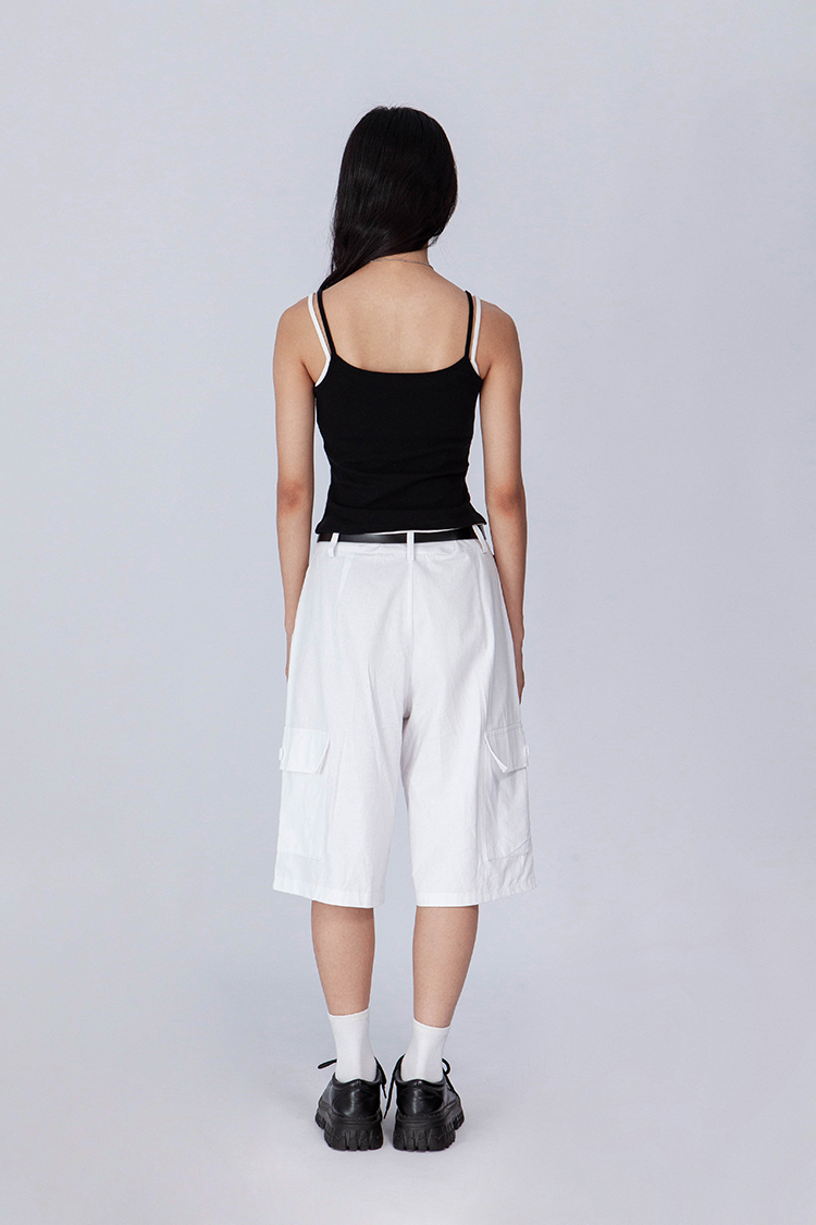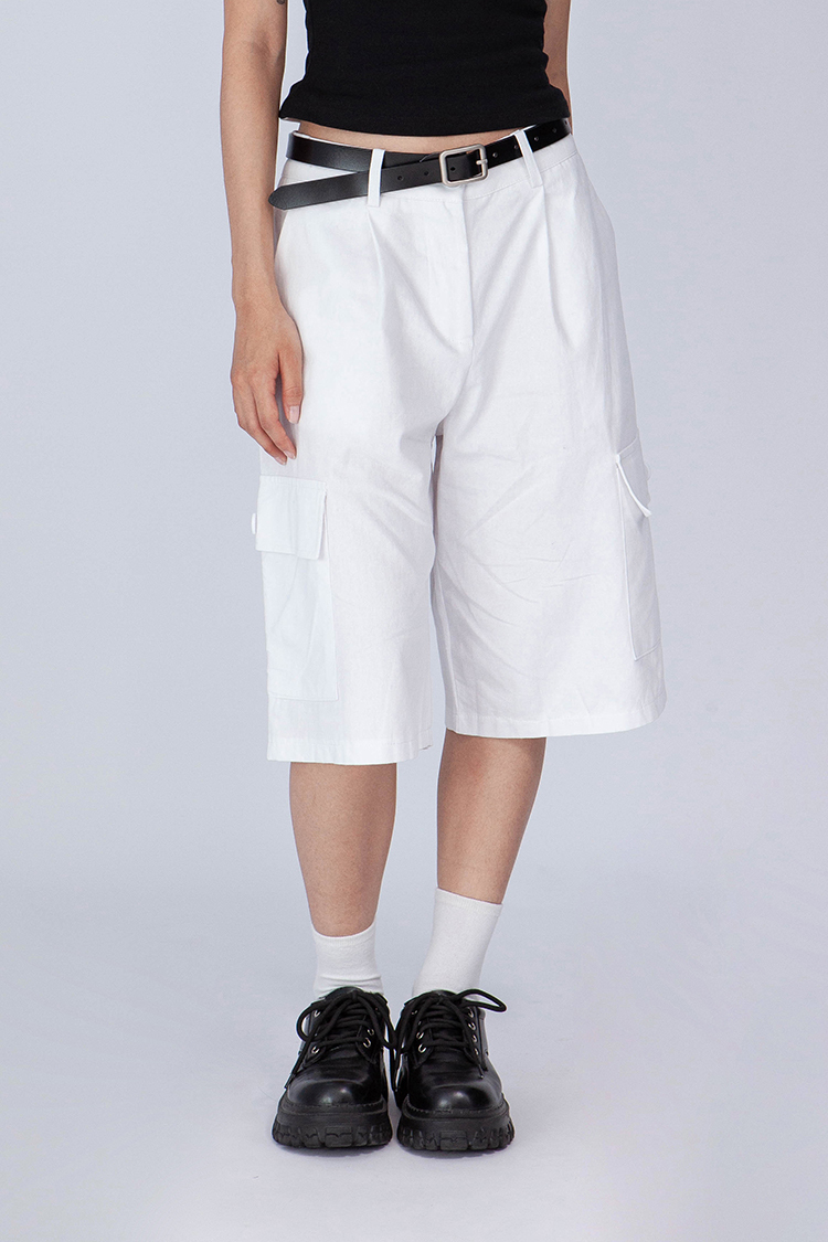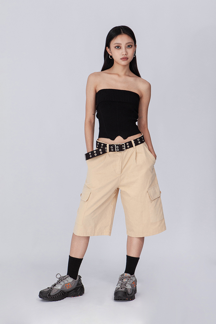 低腰,鈕釦拉鍊閉合,皮帶環,正面對稱打褶細節,兩側斜插袋與翻蓋式口袋,使整體輪廓更加精緻,過膝五分褲,休閒工裝,基礎日常。