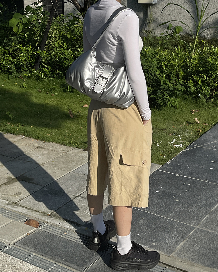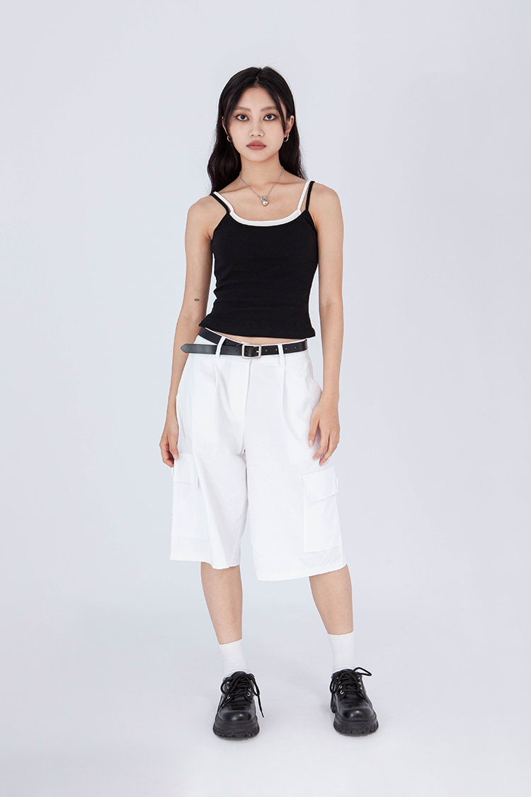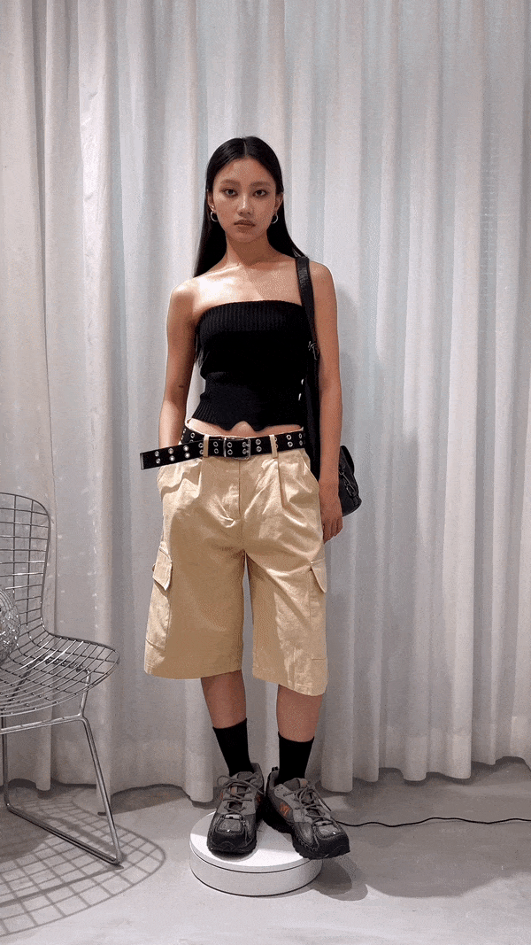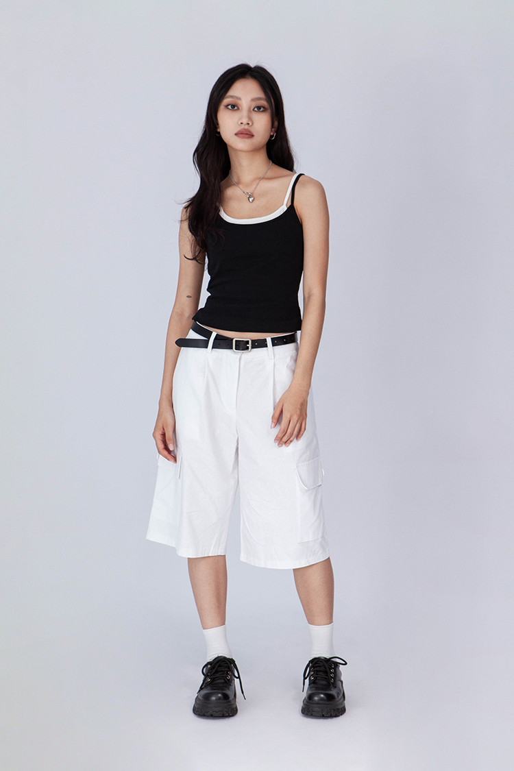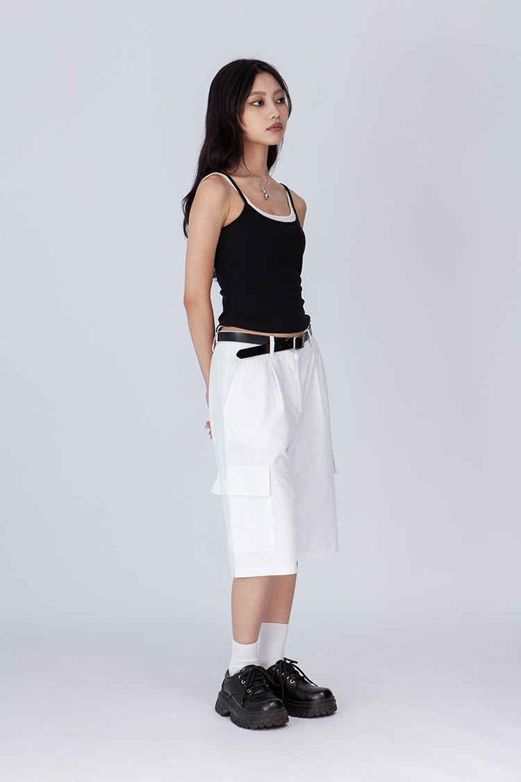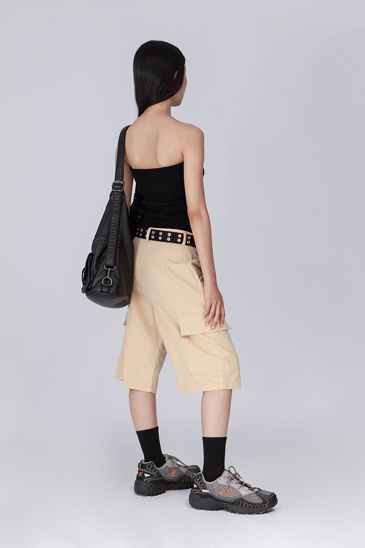 低腰,鈕釦拉鍊閉合,皮帶環,正面對稱打褶細節,兩側斜插袋與翻蓋式口袋,使整體輪廓更加精緻,過膝五分褲,休閒工裝,基礎日常。