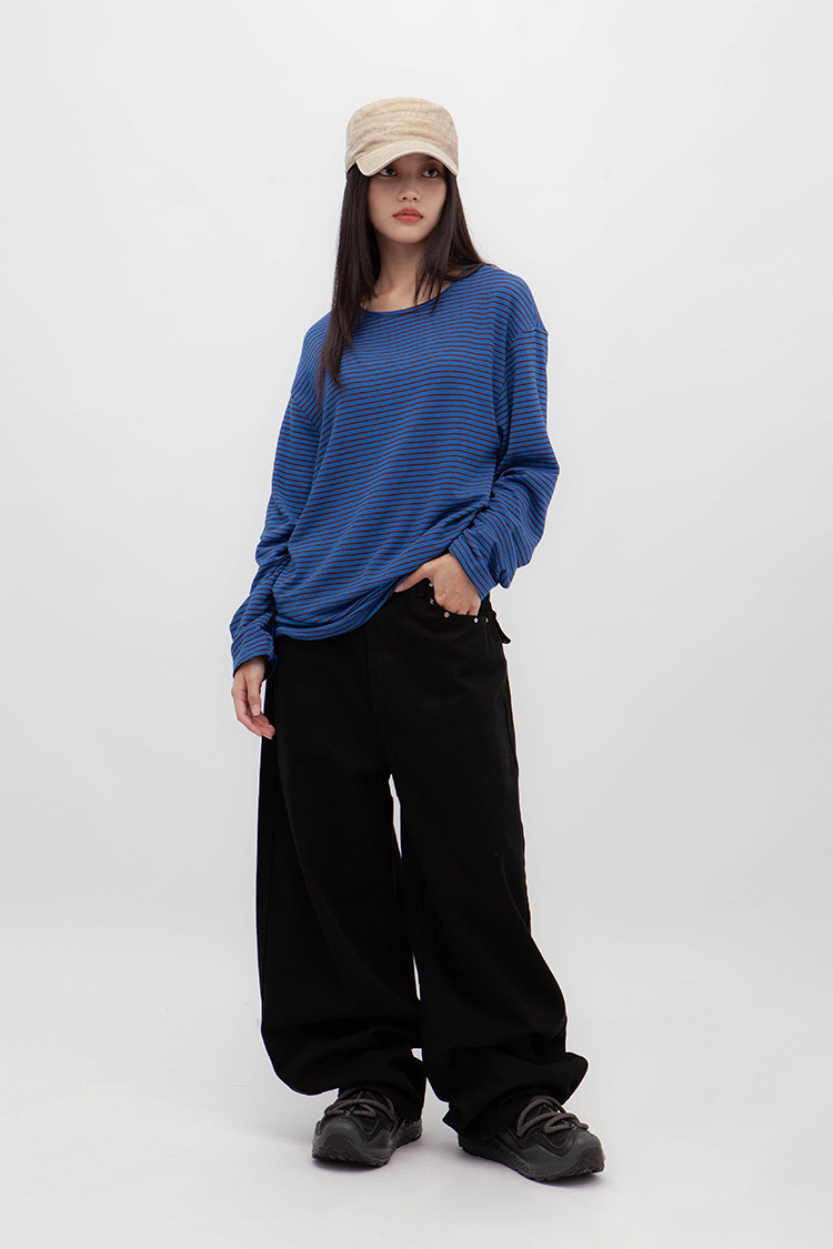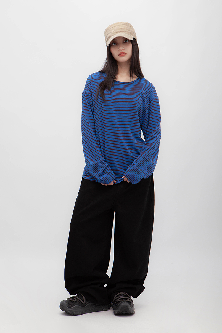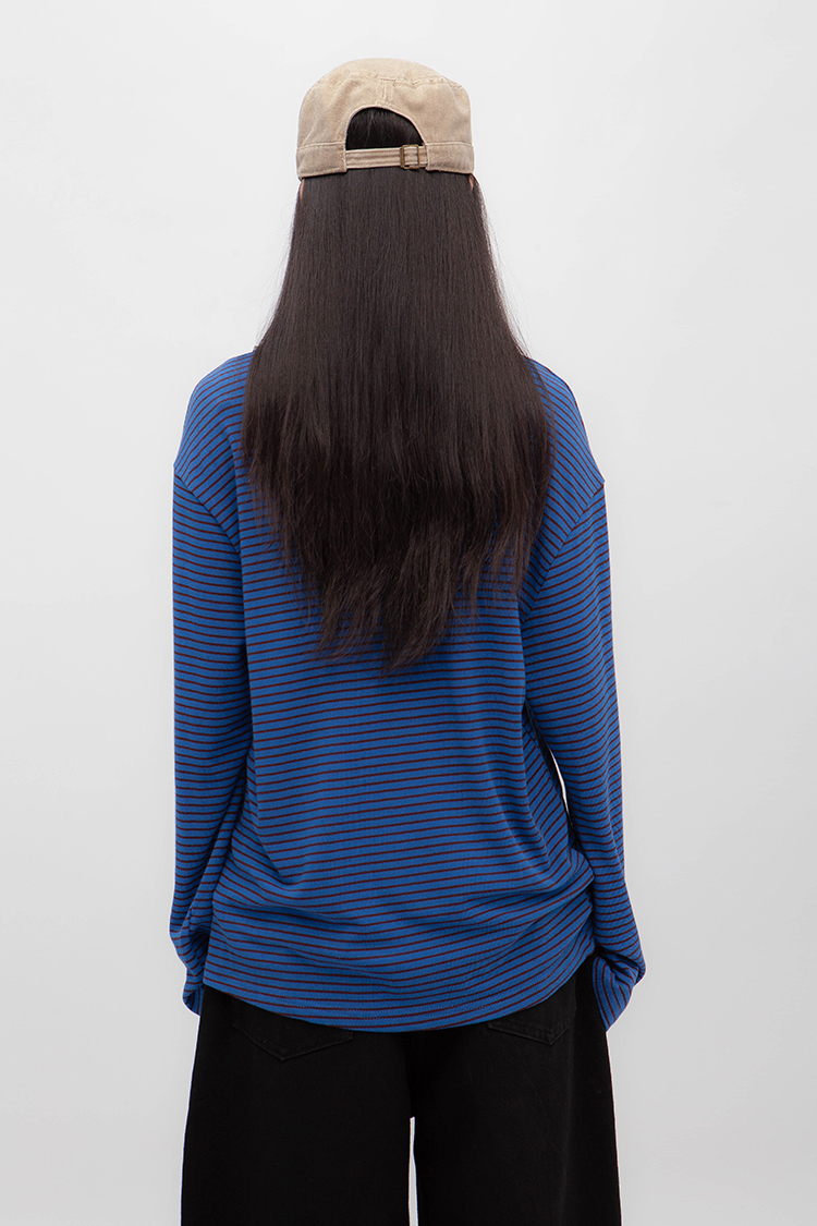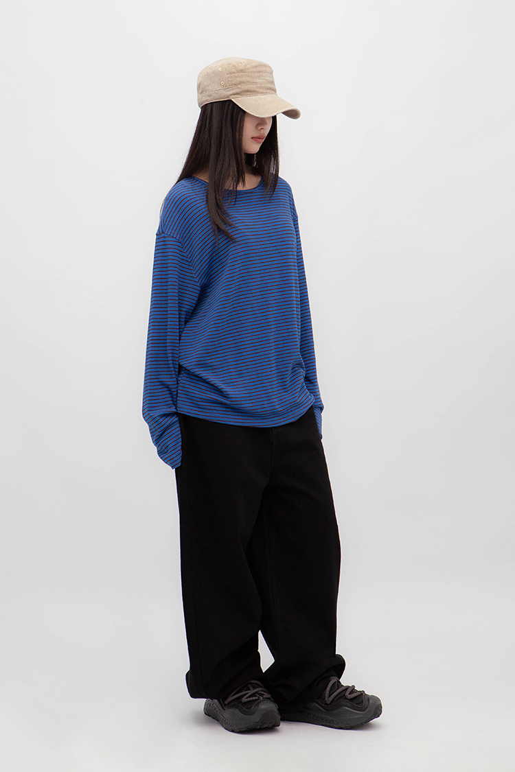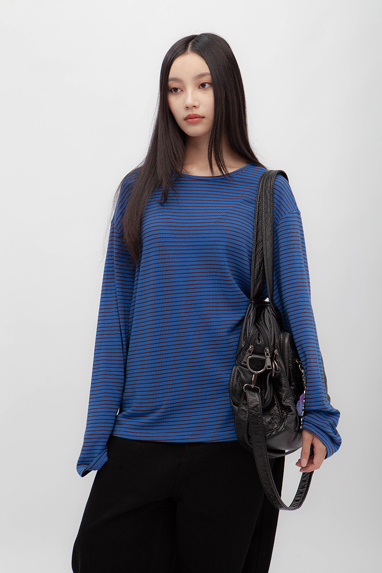 亮眼藍色、咖啡色條紋,搭配落肩版型,穿起來隨性顯瘦又舒服,日常百搭不挑人。