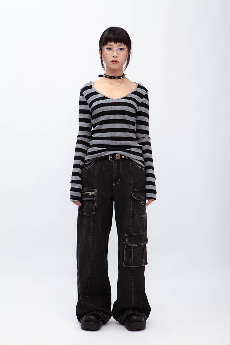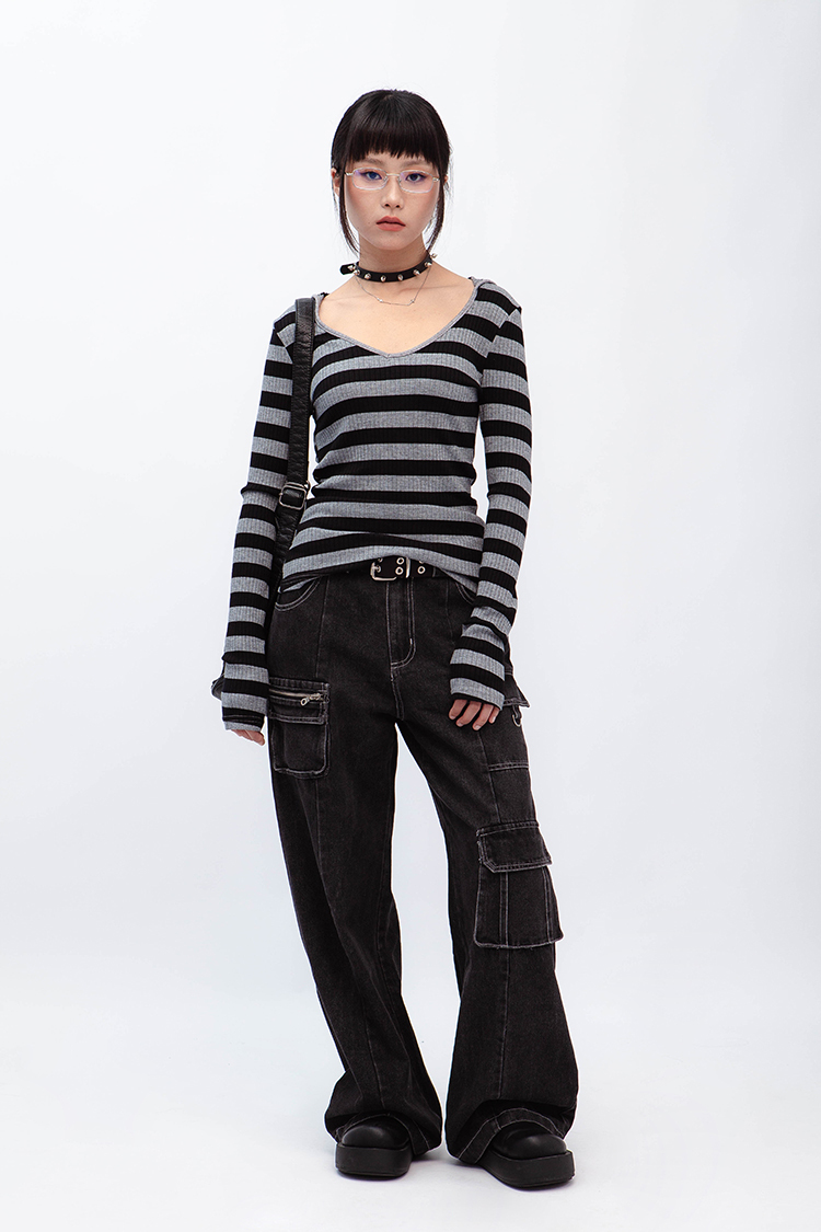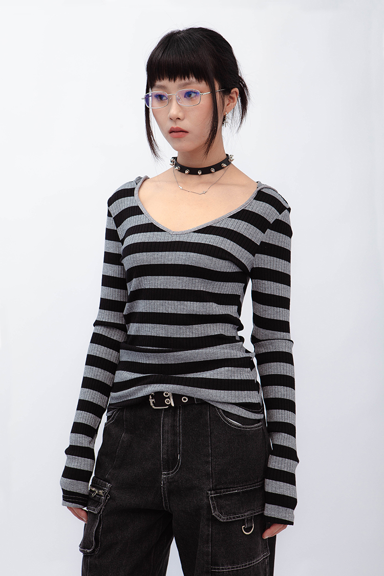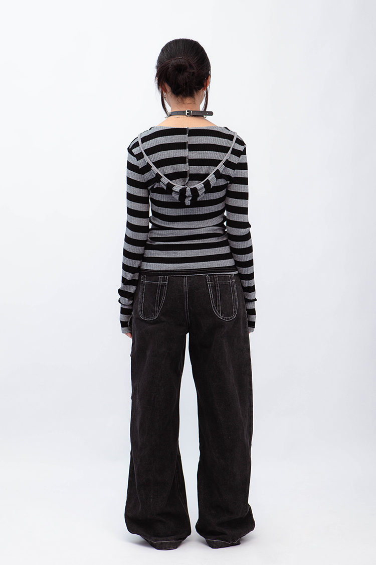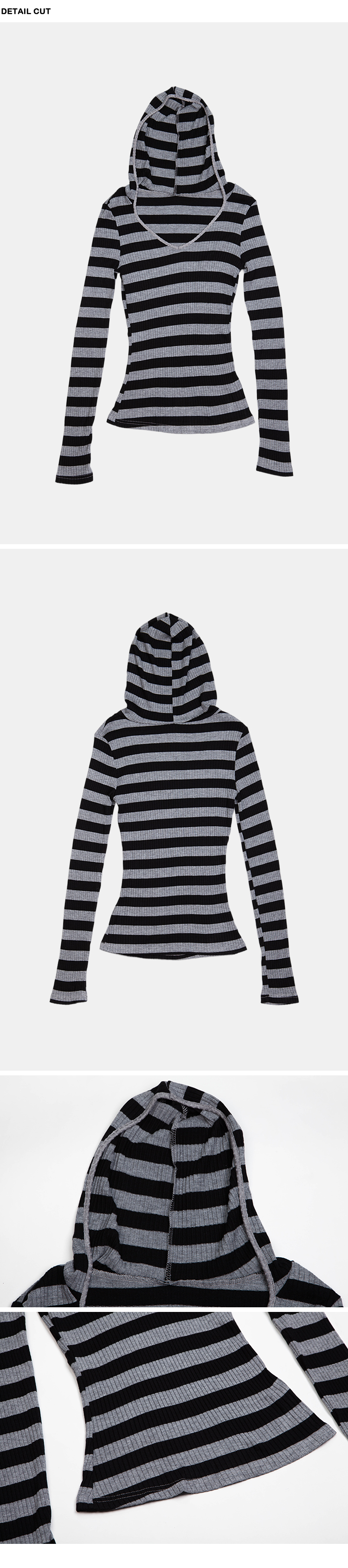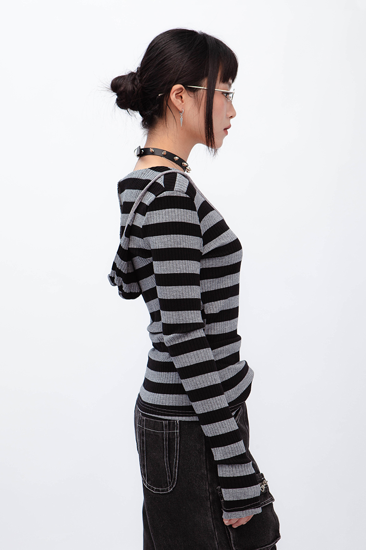 修身條紋針織上衣採用V領設計,搭配連帽細節,展現休閒與性感的完美平衡。羅紋針織布料柔軟親膚,具有良好的彈性,貼合身形且顯瘦。長袖剪裁,適合秋冬季節單穿或作為內搭。