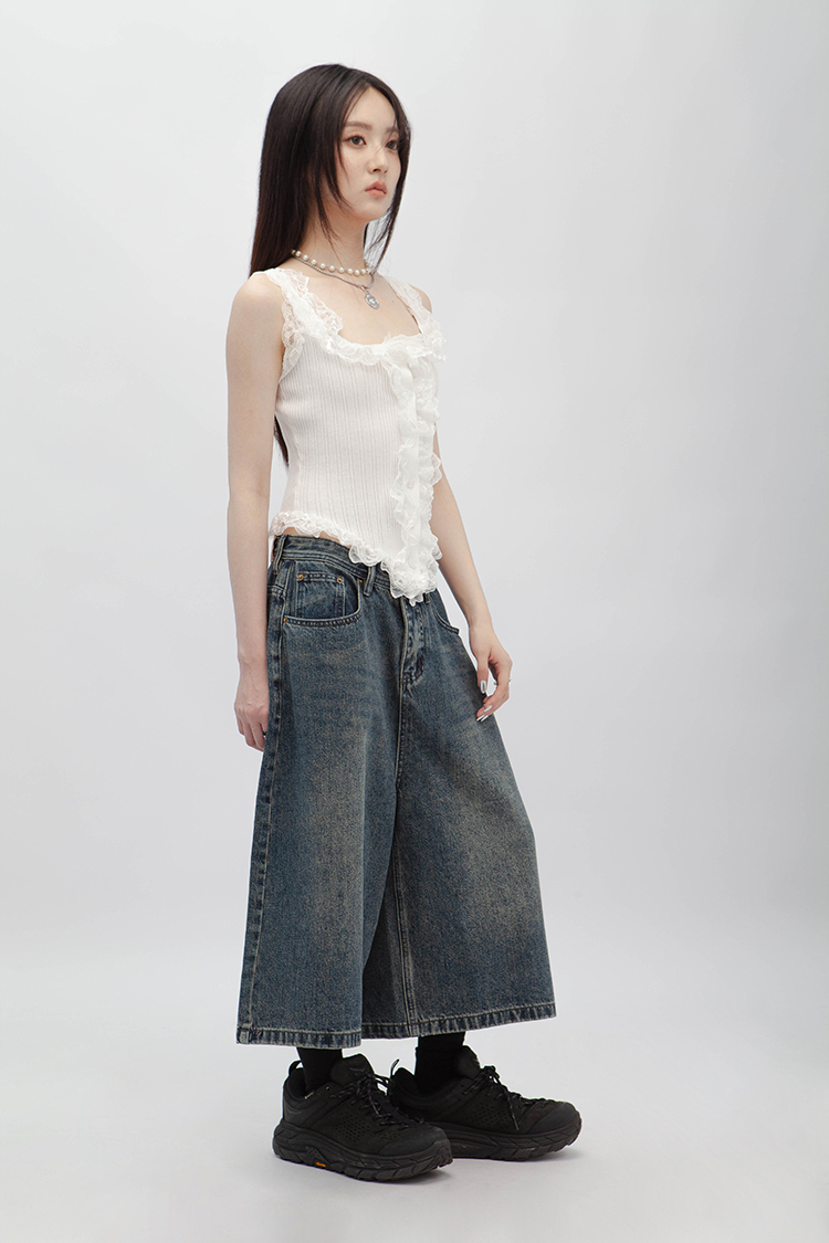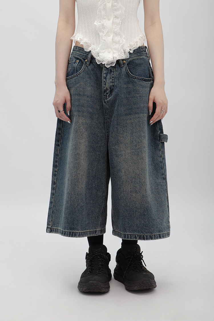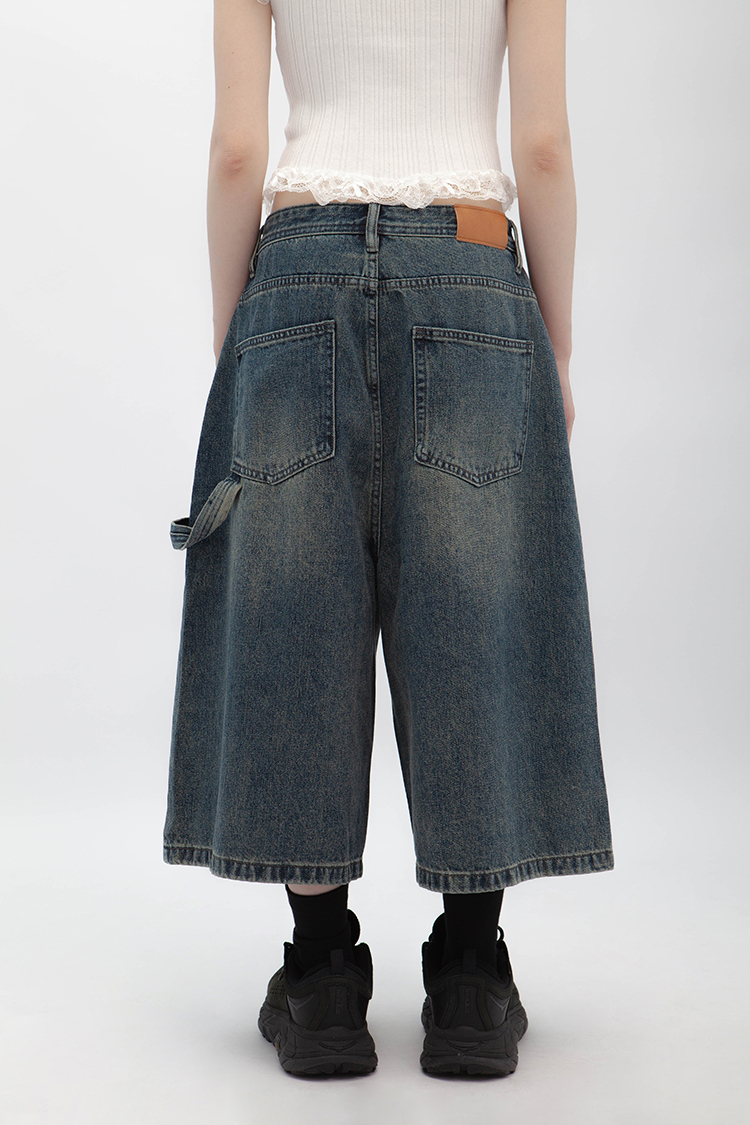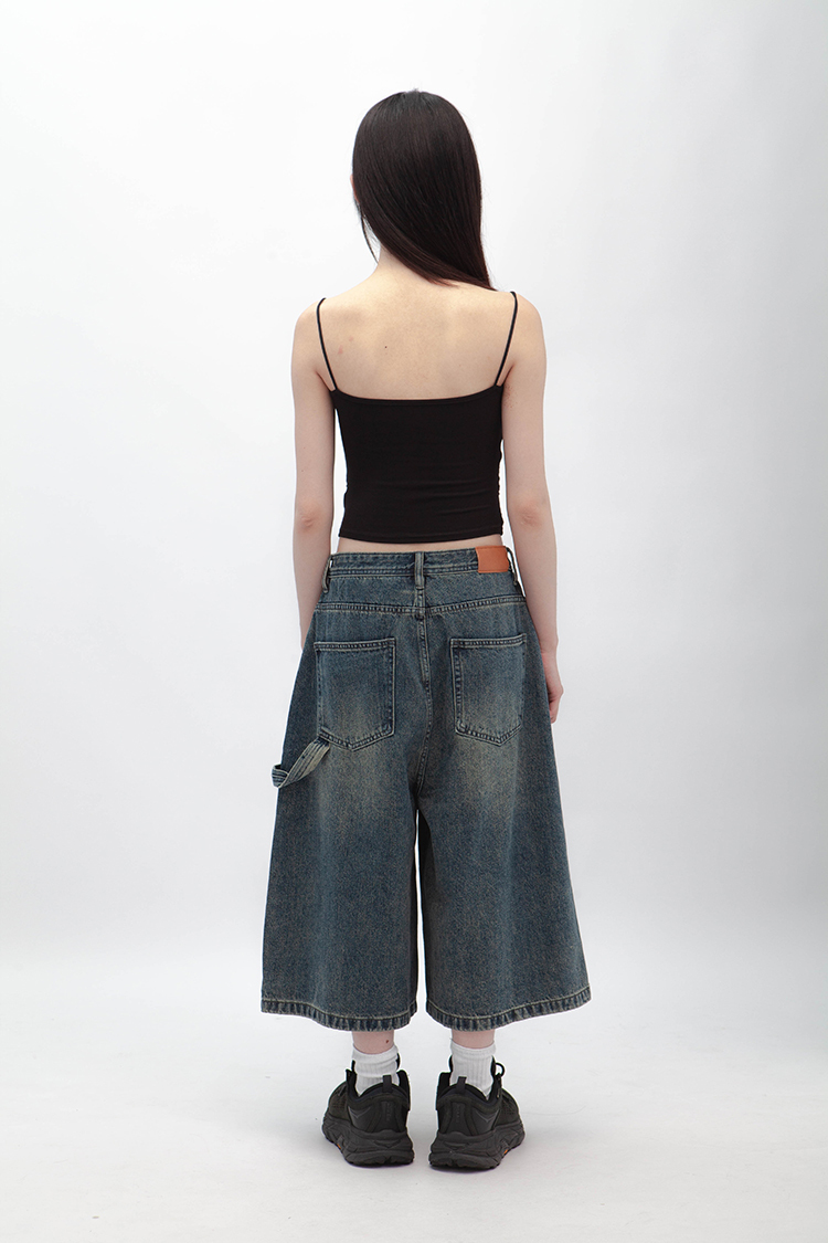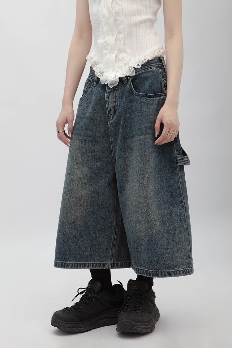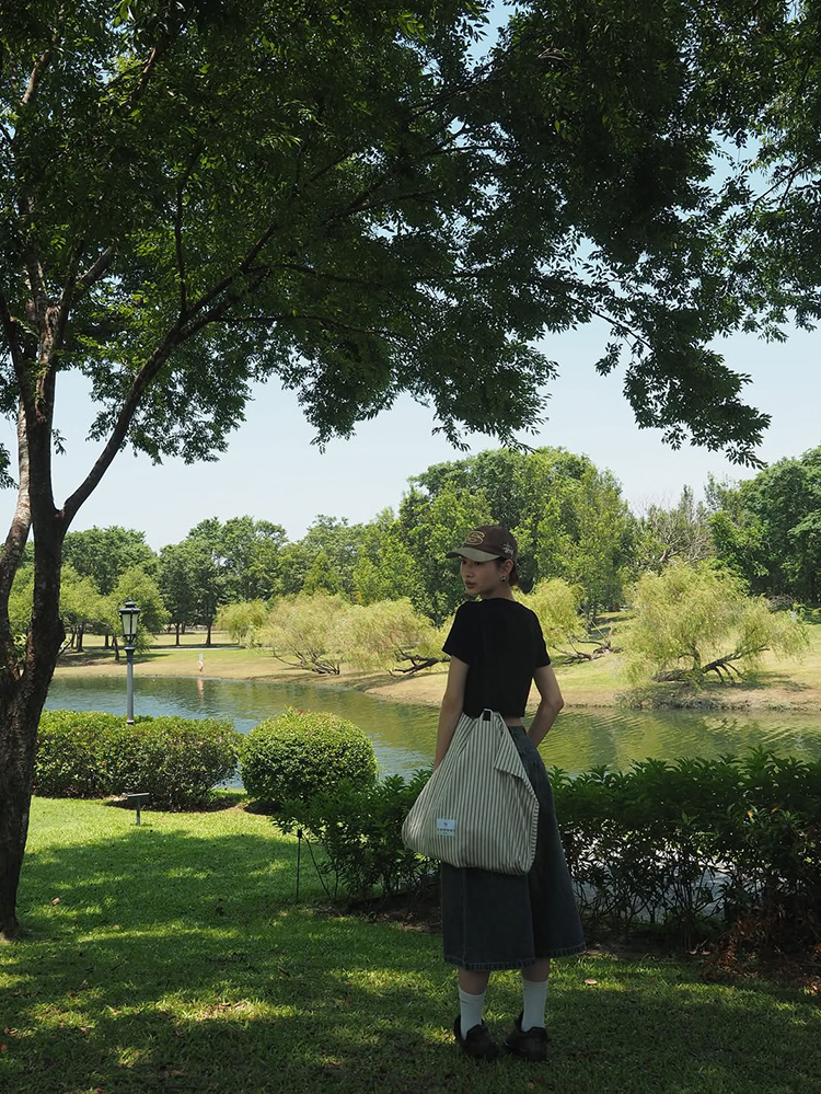 A字立體輪廓,修飾身型同時保有寬鬆感。呈現低調復古藍與些微黃感色差,隱約可見直條織紋紋理,左後側立體彎折設計。