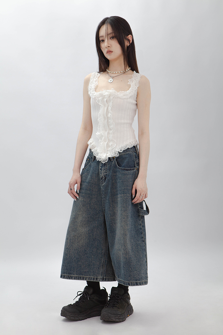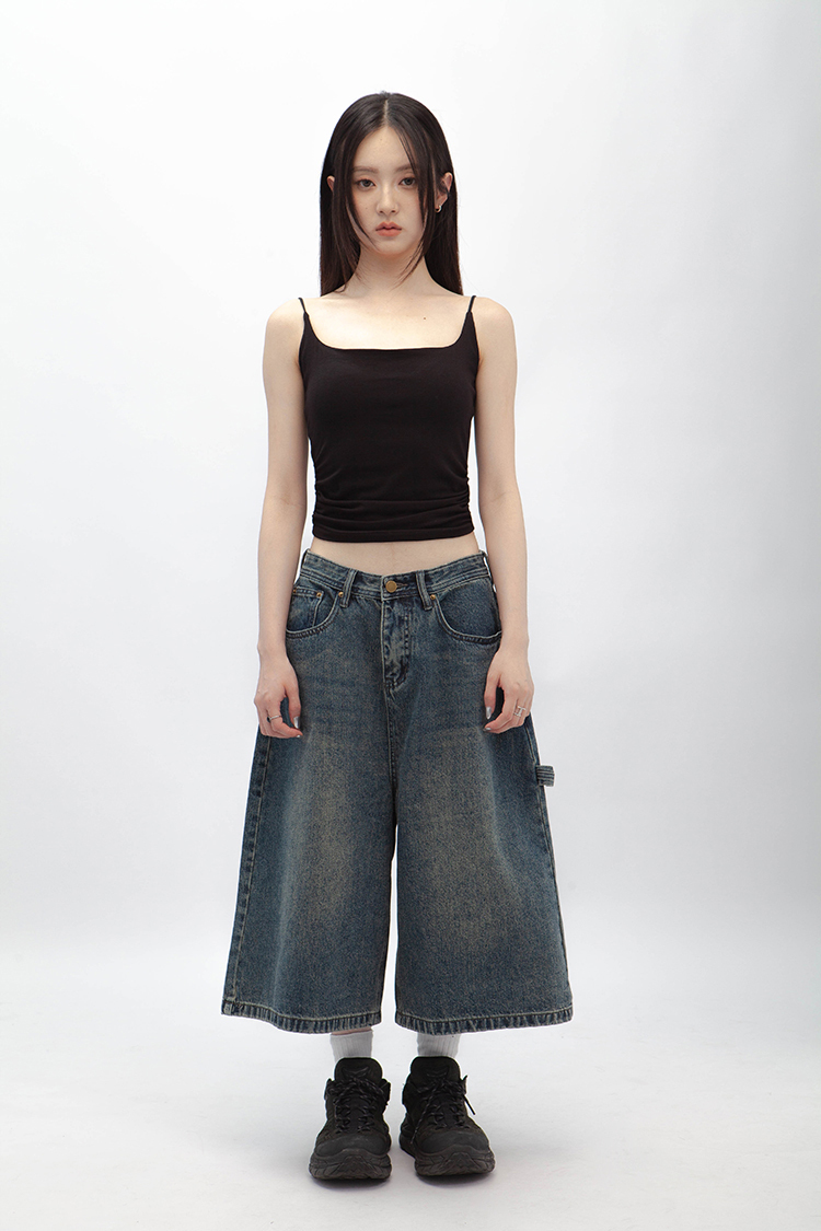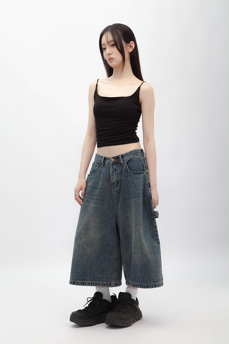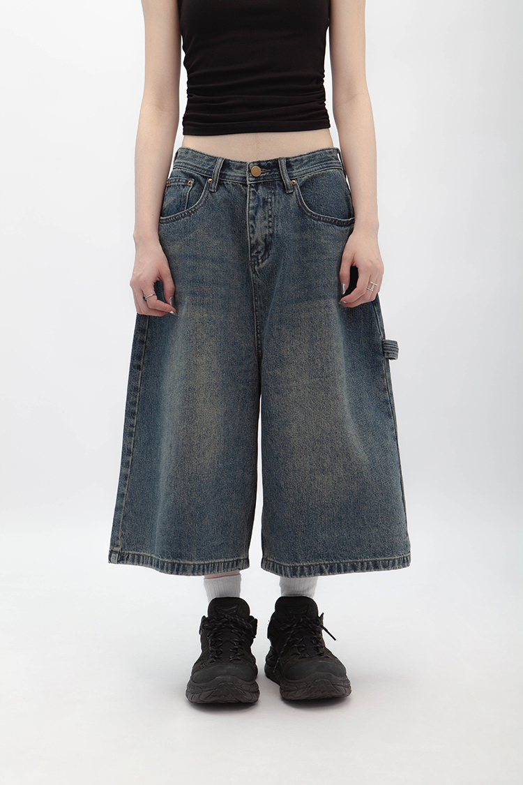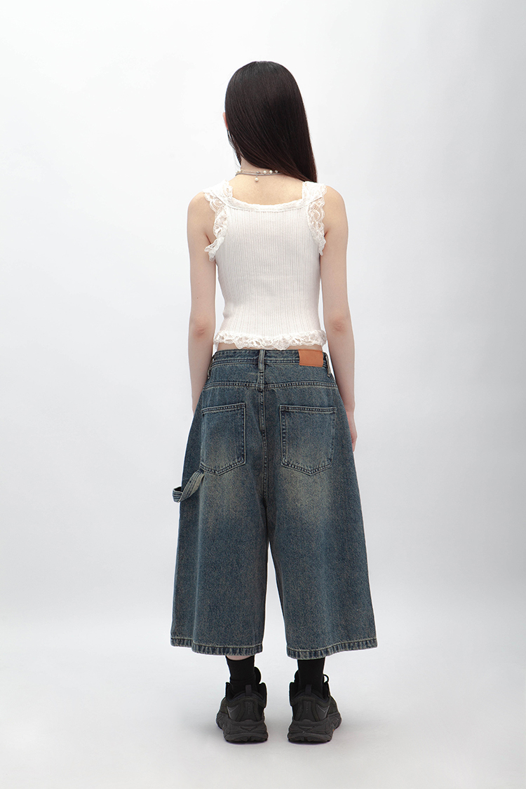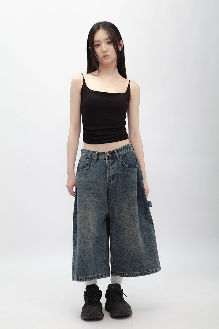 A字立體輪廓,修飾身型同時保有寬鬆感。呈現低調復古藍與些微黃感色差,隱約可見直條織紋紋理,左後側立體彎折設計。
