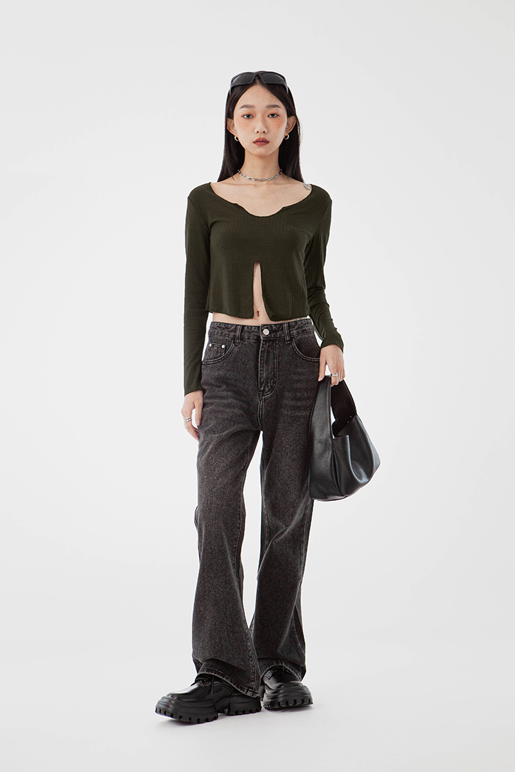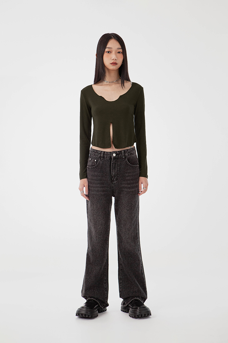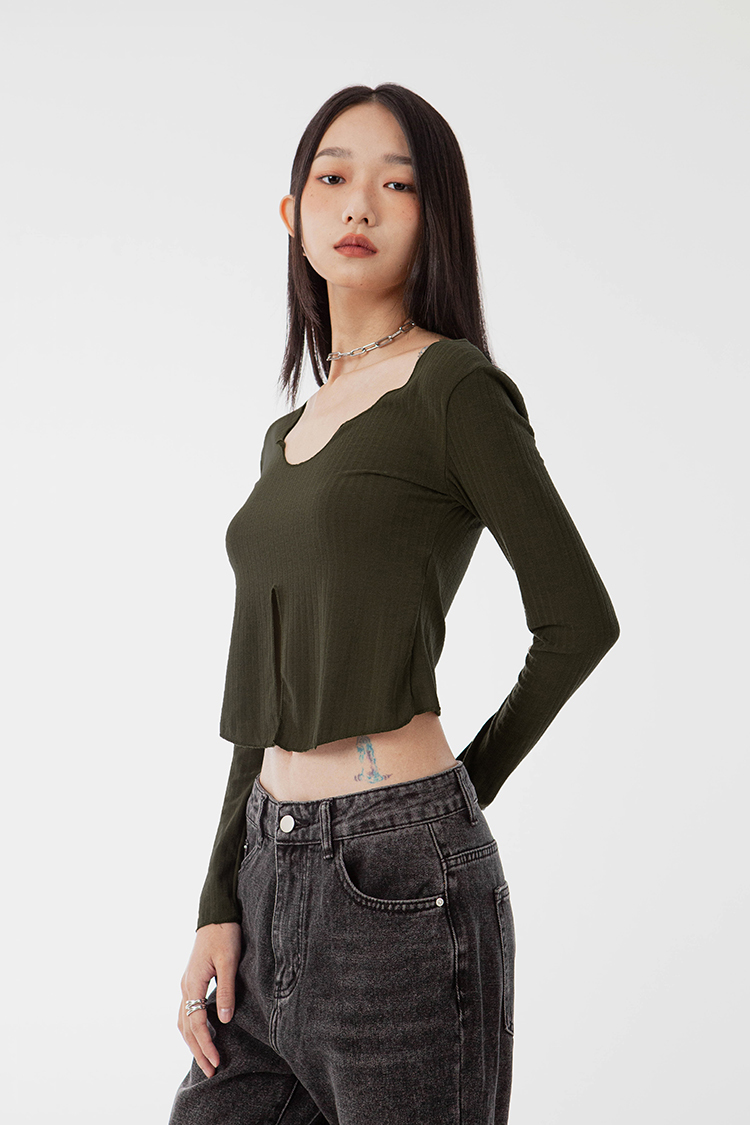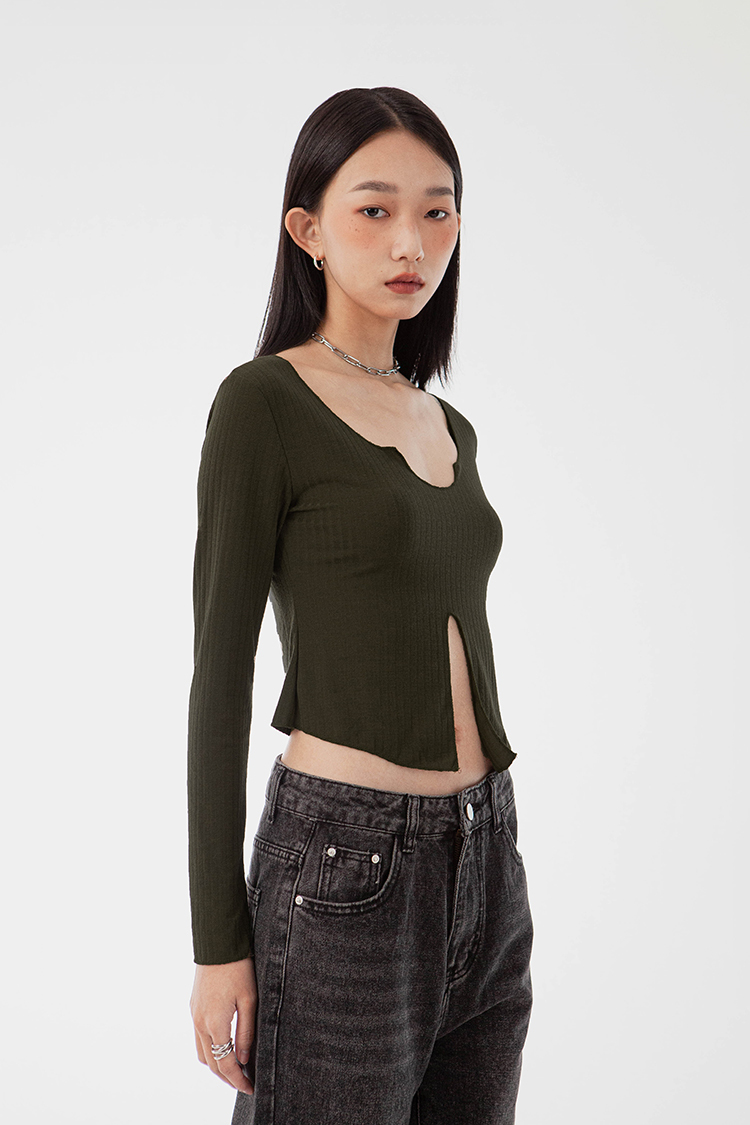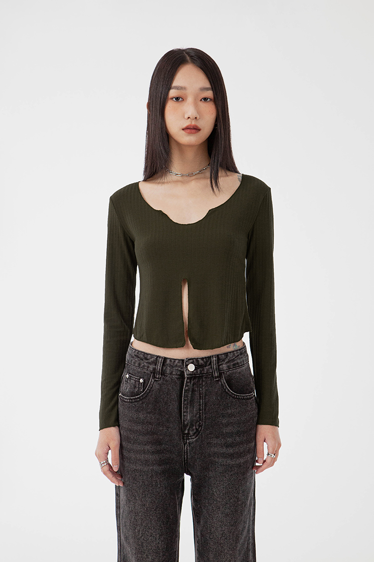 V領,展現鎖骨線條,寬羅紋針織,觸感柔軟舒適,正面下擺開衩設計,飄逸的視覺。
