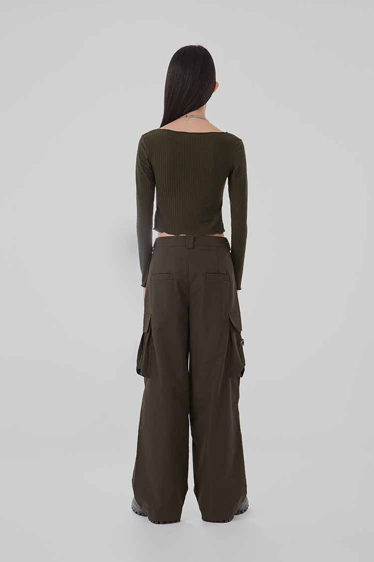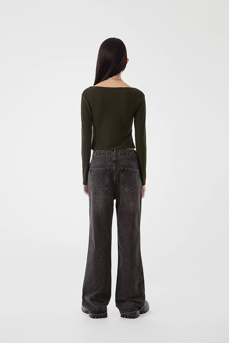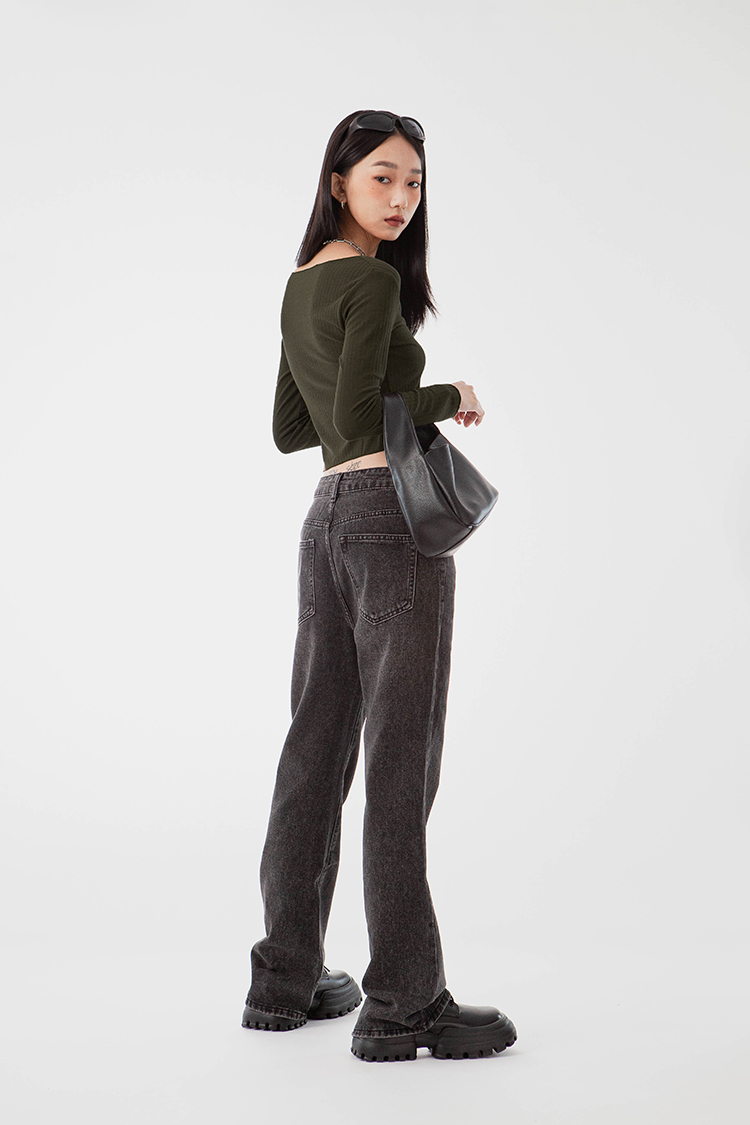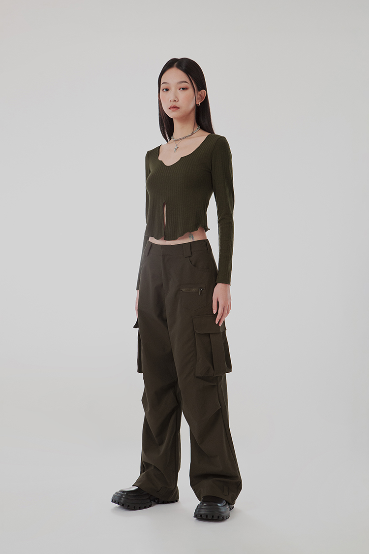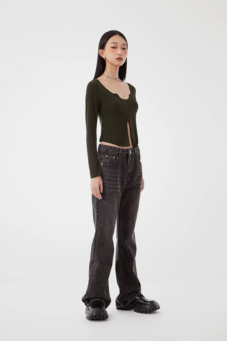 V領,展現鎖骨線條,寬羅紋針織,觸感柔軟舒適,正面下擺開衩設計,飄逸的視覺。