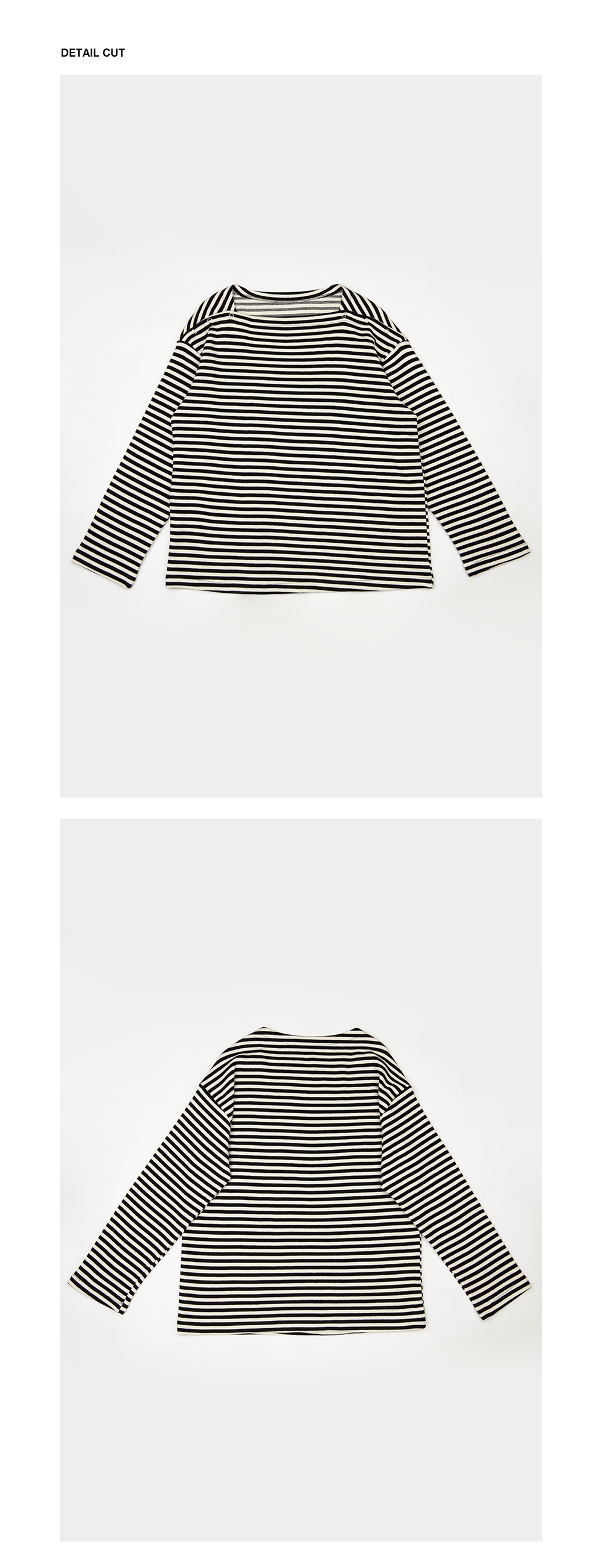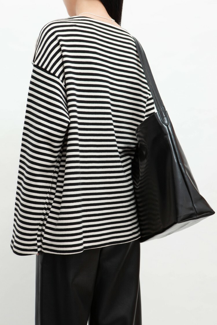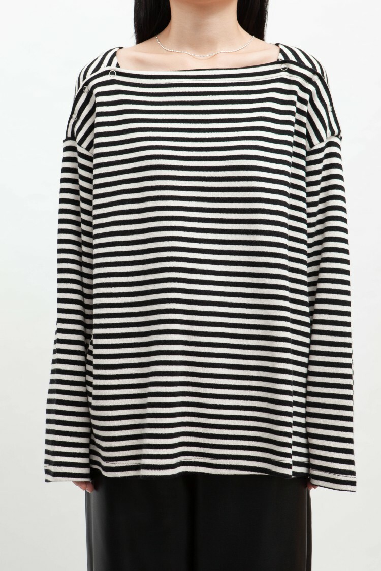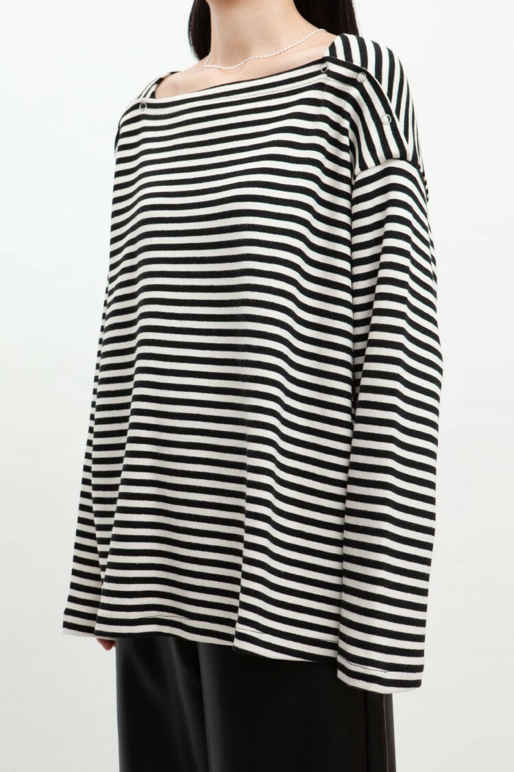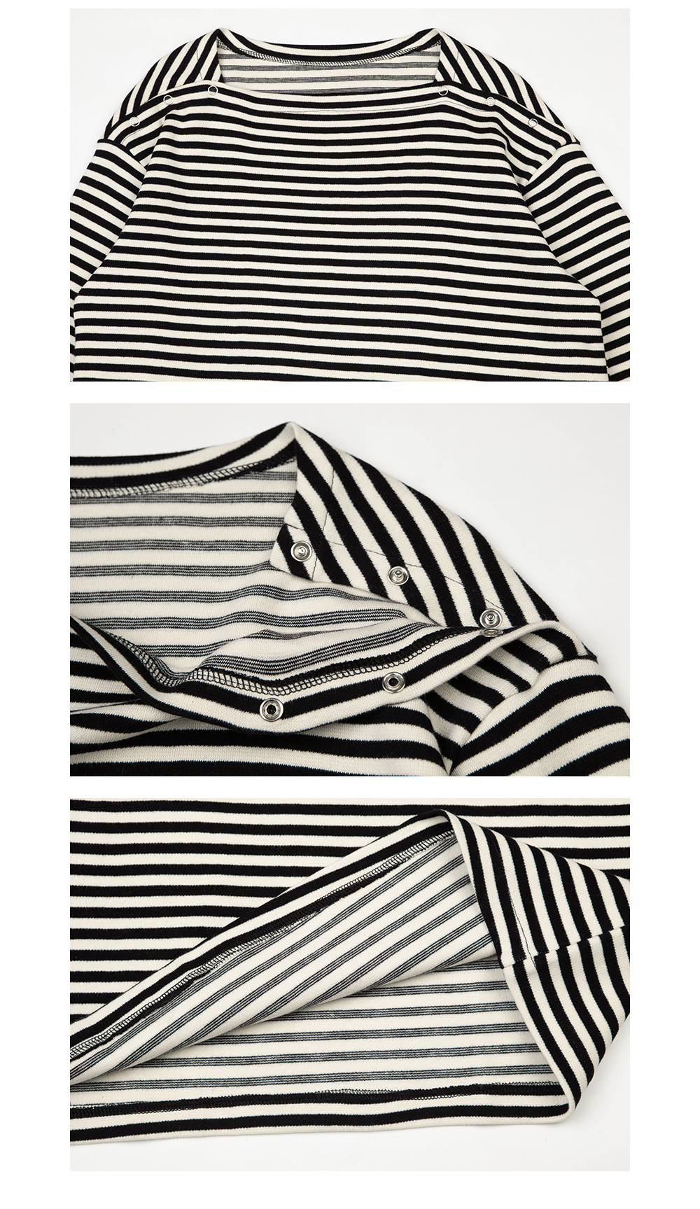一字領紐扣設計,黑色米色相間條紋,落肩袖,加厚羅紋針織布料,寬鬆輪廓,中長版型,經典又輕鬆,休閒基礎款。
