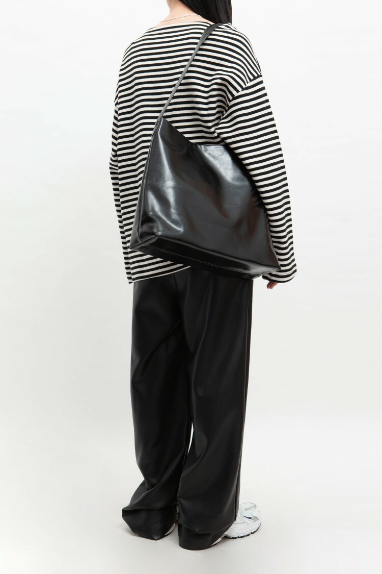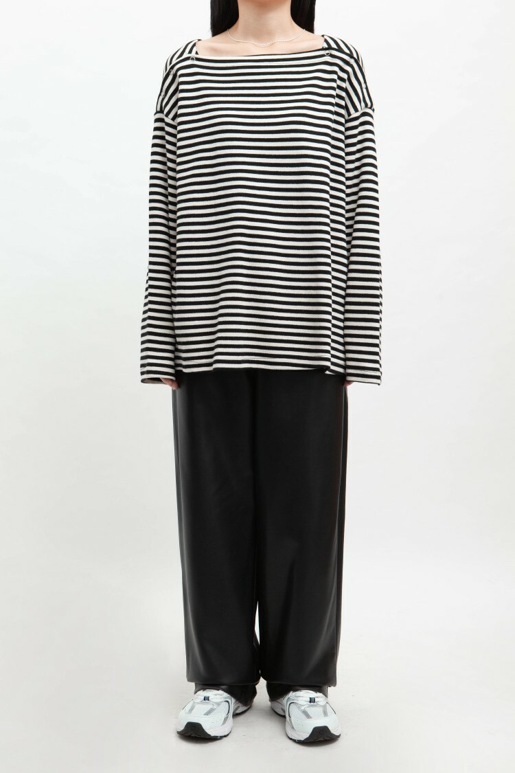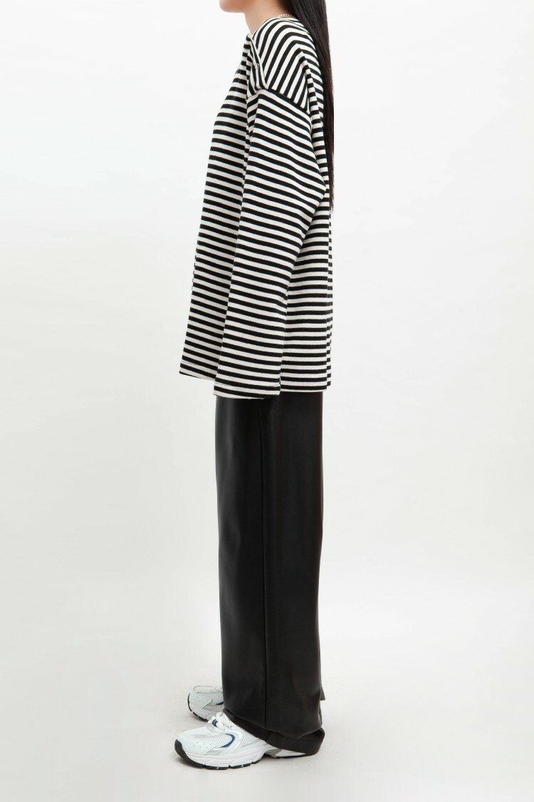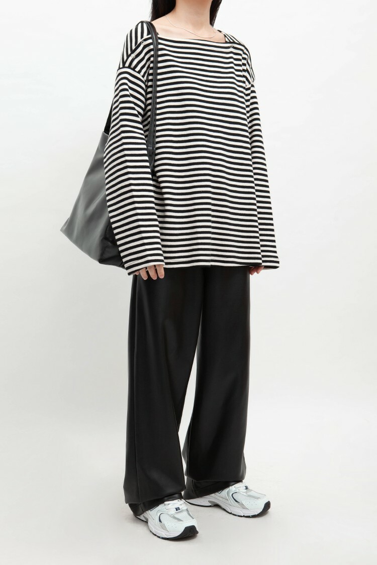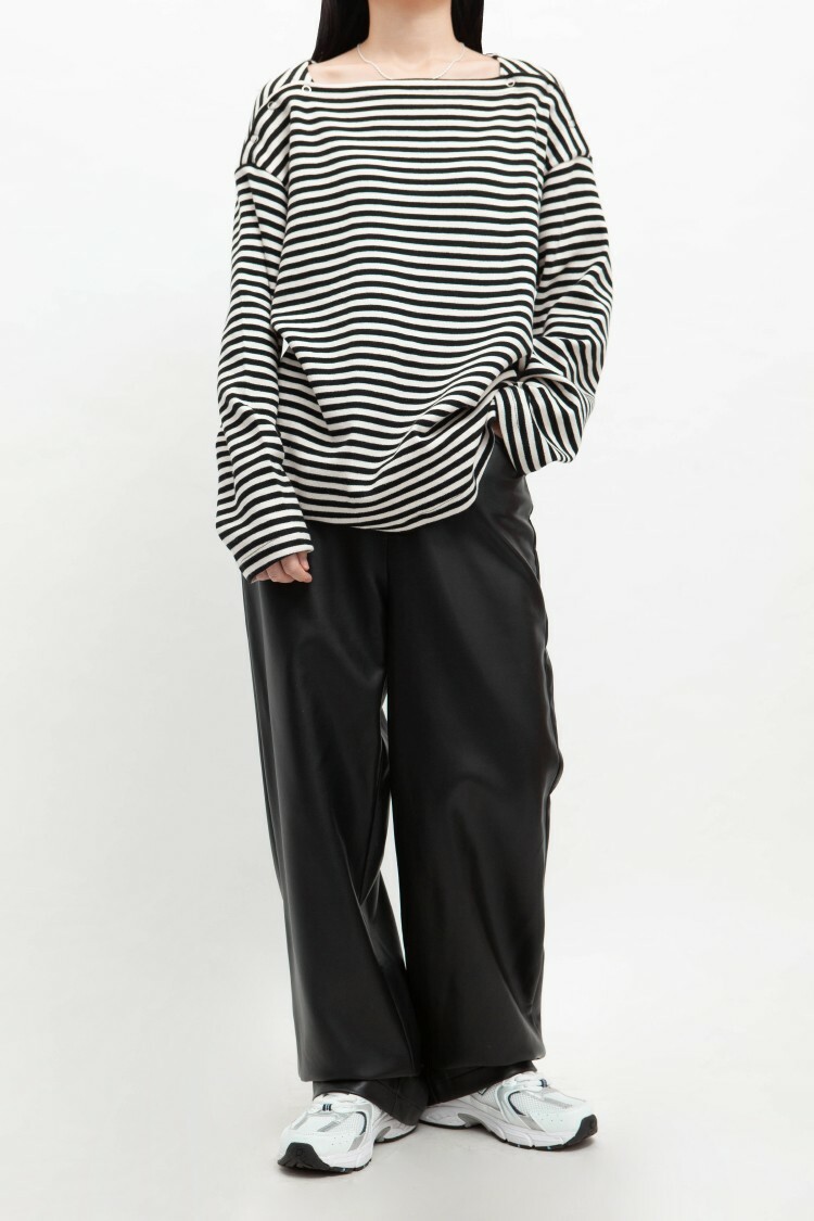 一字領紐扣設計,黑色米色相間條紋,落肩袖,加厚羅紋針織布料,寬鬆輪廓,中長版型,經典又輕鬆,休閒基礎款。