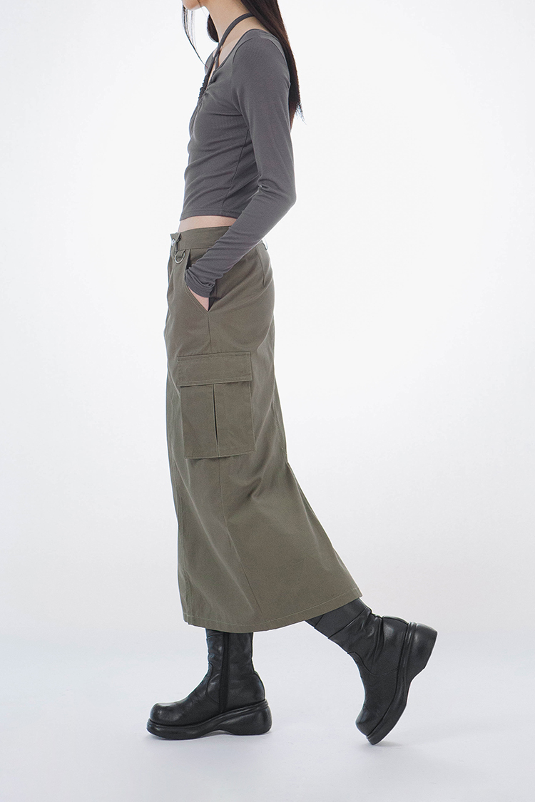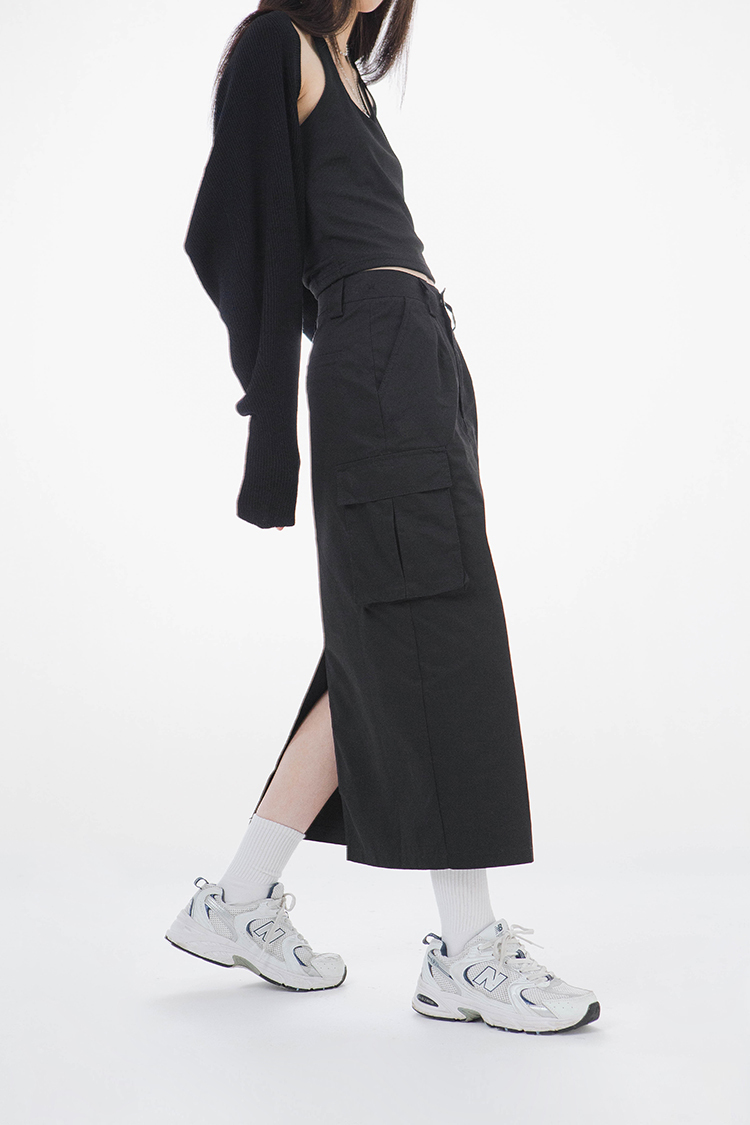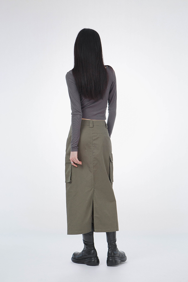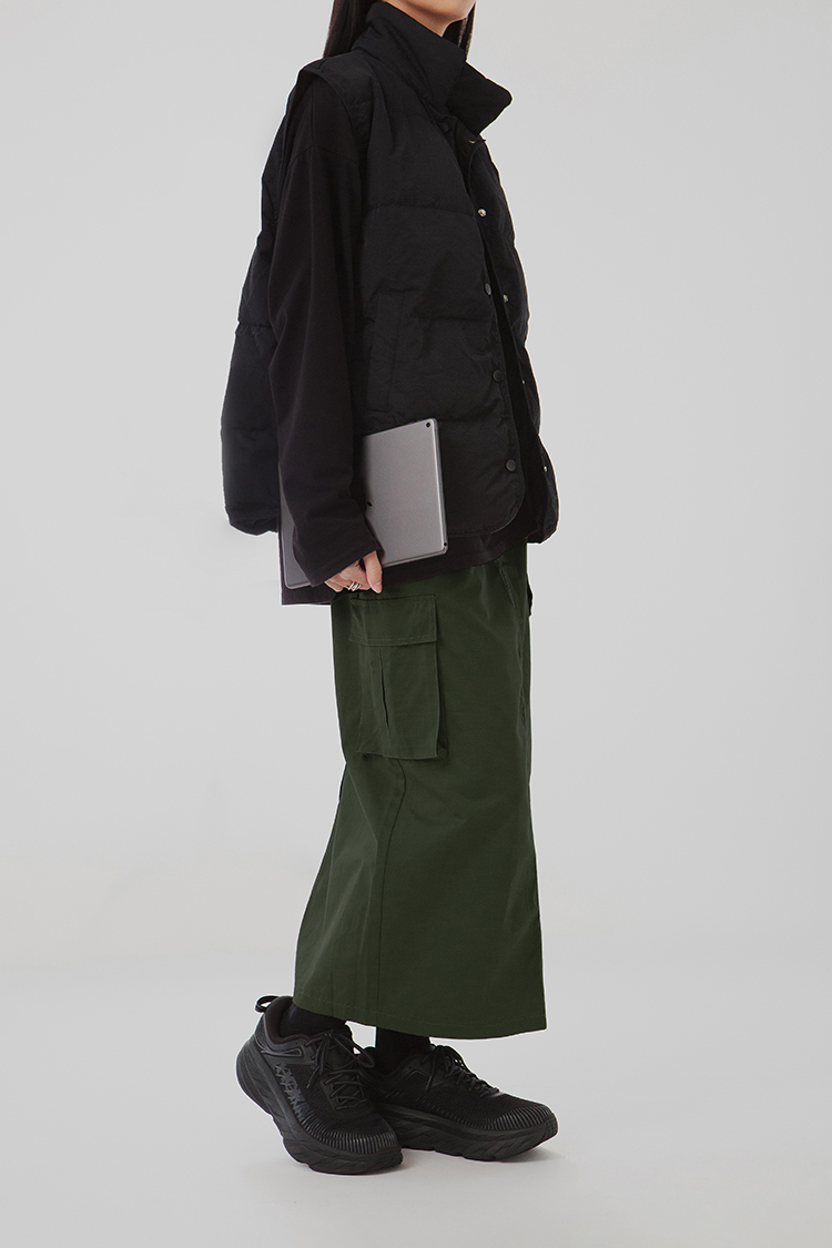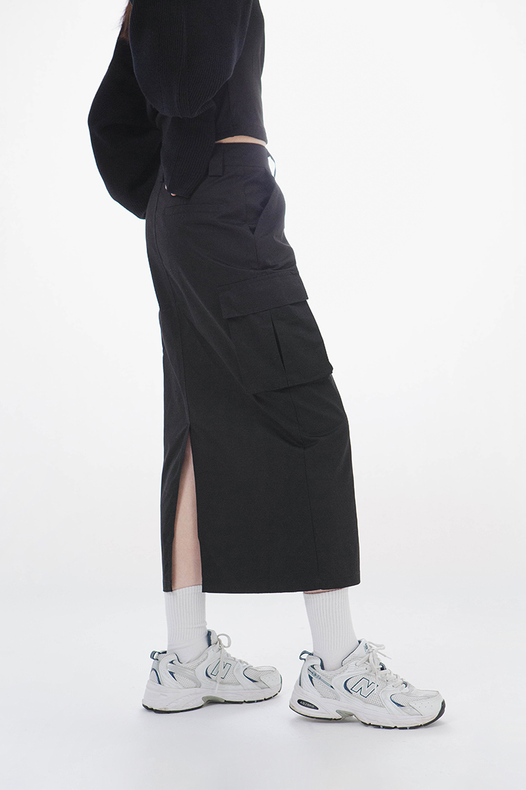 中腰,按壓式鈕扣,拉鍊門襟閉合,正面兩側斜插袋與中間兩側翻蓋口袋,無彈性,背面下襬開衩,穿著整體有修飾臀部的效果。