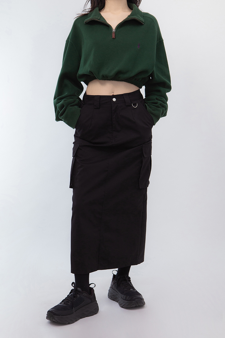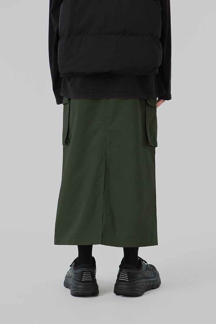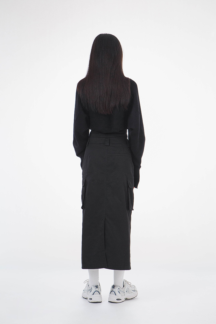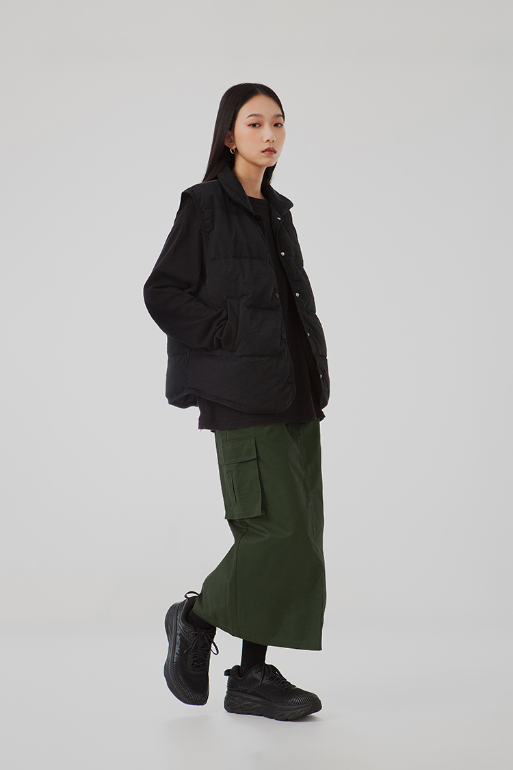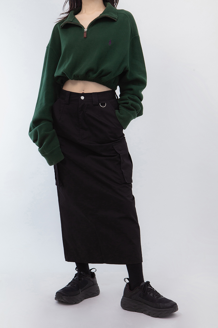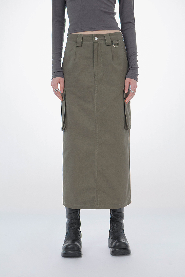 中腰,按壓式鈕扣,拉鍊門襟閉合,正面兩側斜插袋與中間兩側翻蓋口袋,無彈性,背面下襬開衩,穿著整體有修飾臀部的效果。