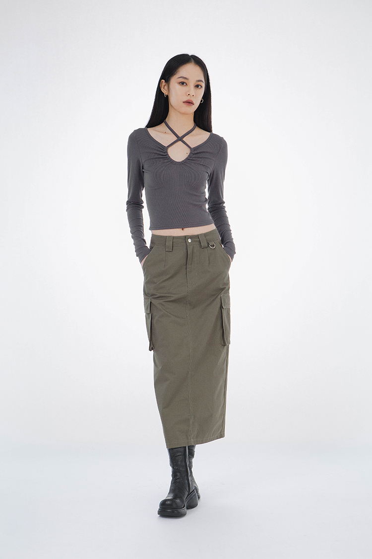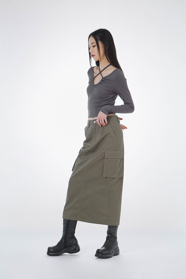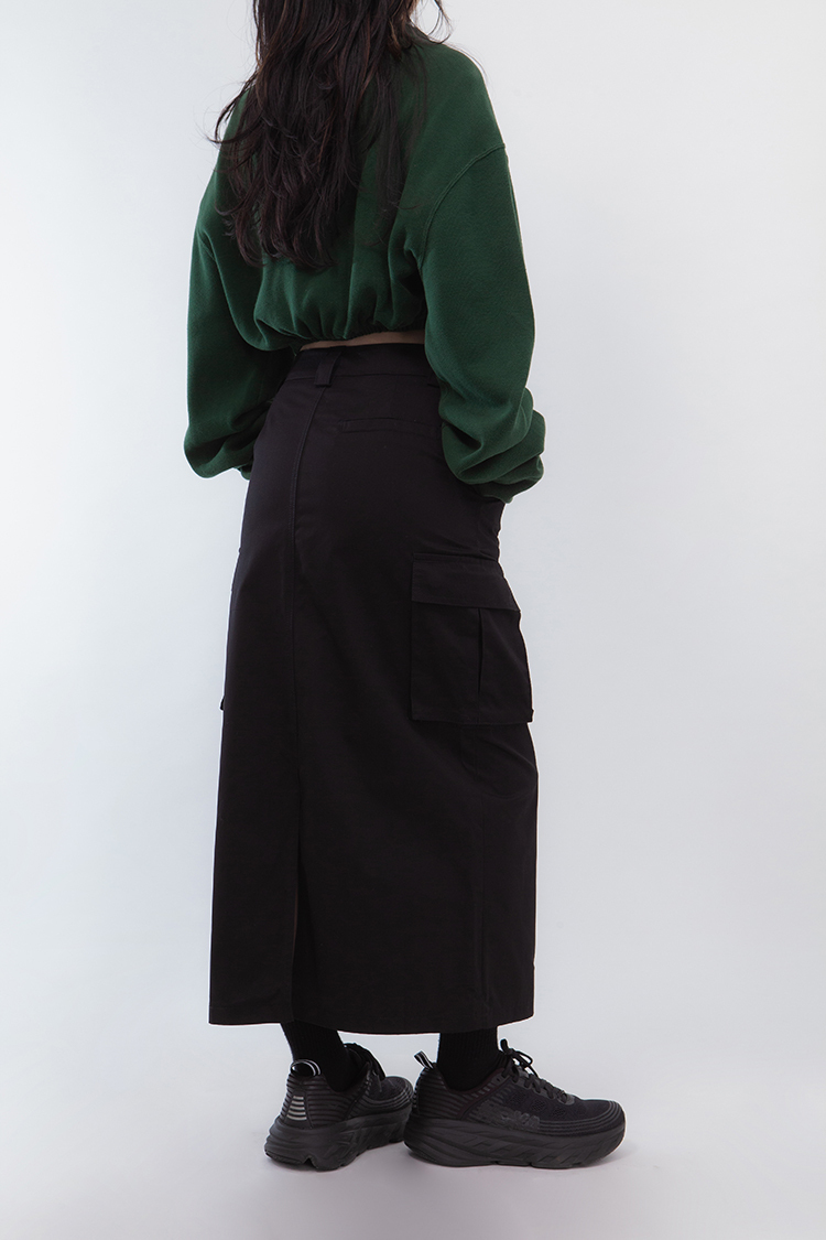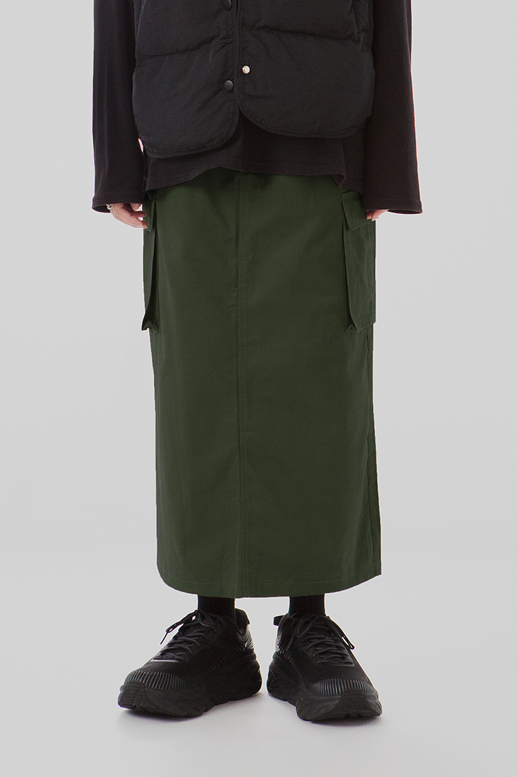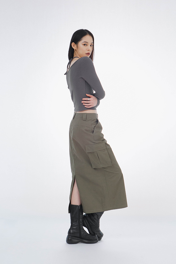 中腰,按壓式鈕扣,拉鍊門襟閉合,正面兩側斜插袋與中間兩側翻蓋口袋,無彈性,背面下襬開衩,穿著整體有修飾臀部的效果。