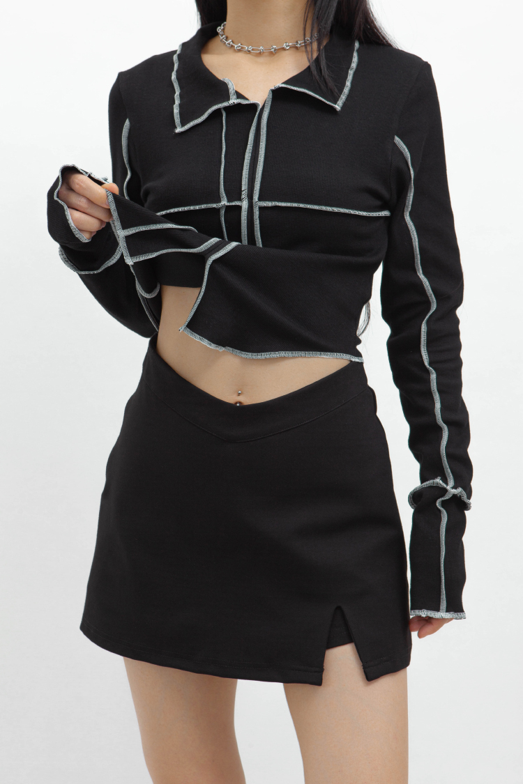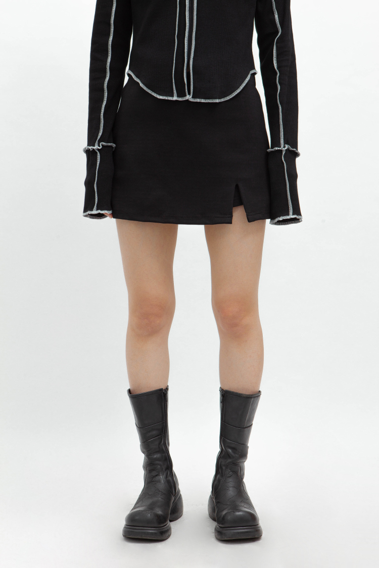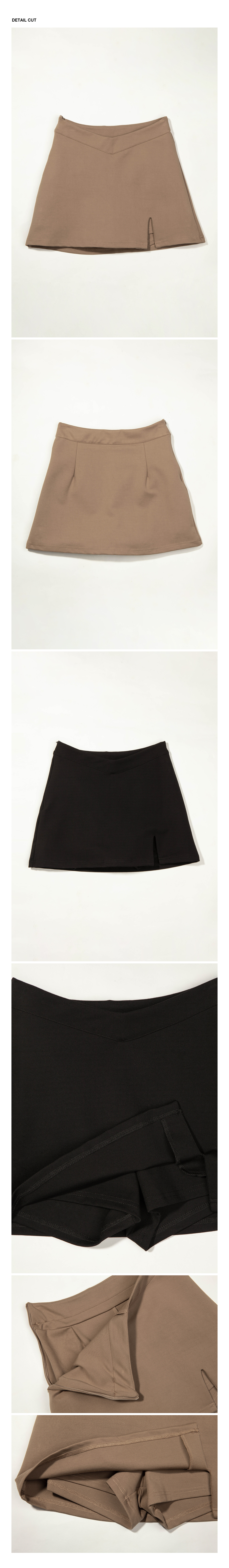 高腰V型剪裁,A字輪廓,左側小開叉與隱形拉鍊,內含安全褲,彈性平紋針織布料,中等厚度。