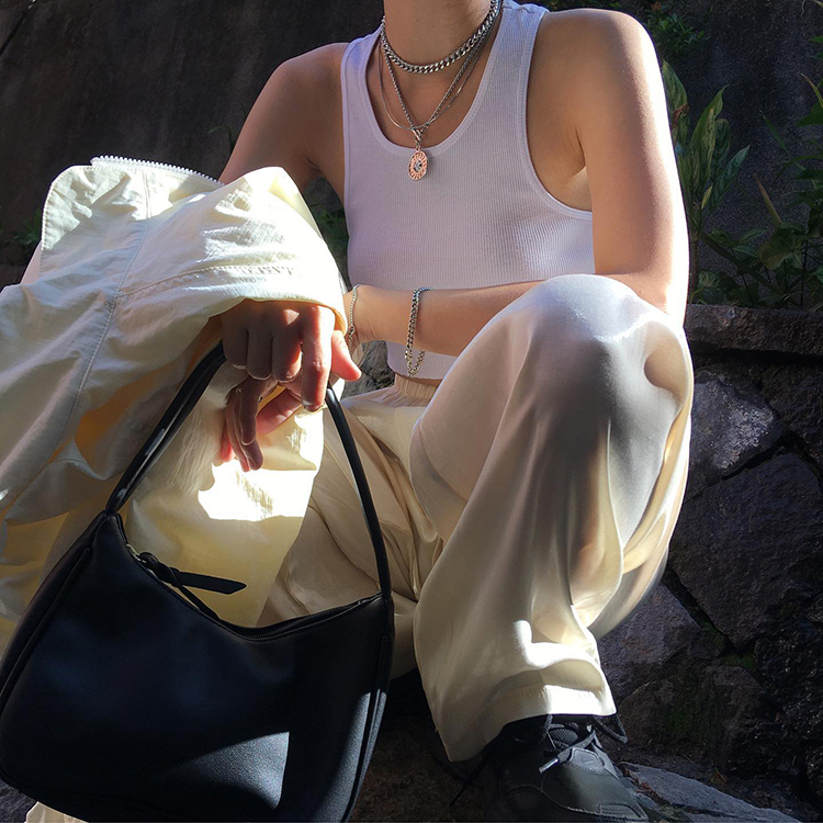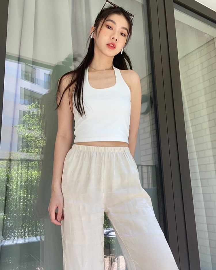 鬆緊褲頭,無內襯,寬管褲型,簡潔的輪廓,採用光澤感布料,透氣涼爽適合這個夏日。