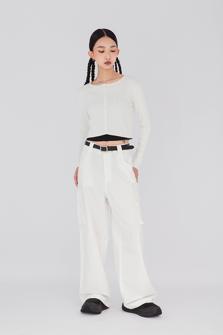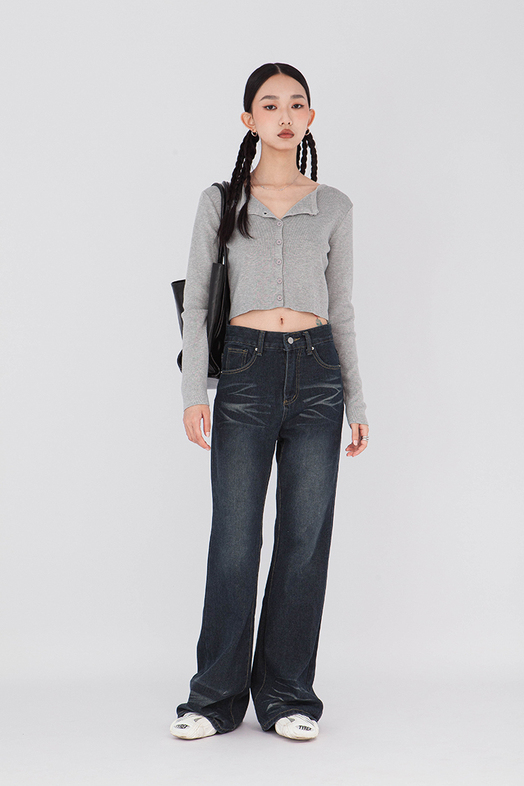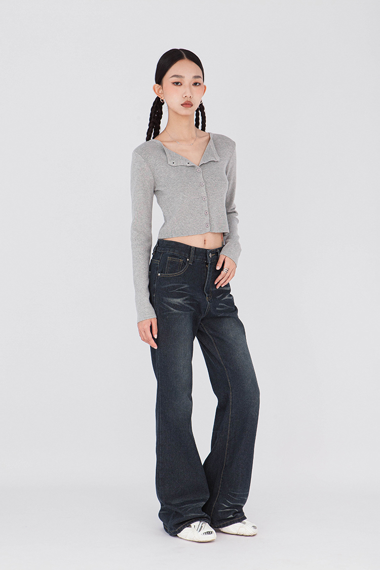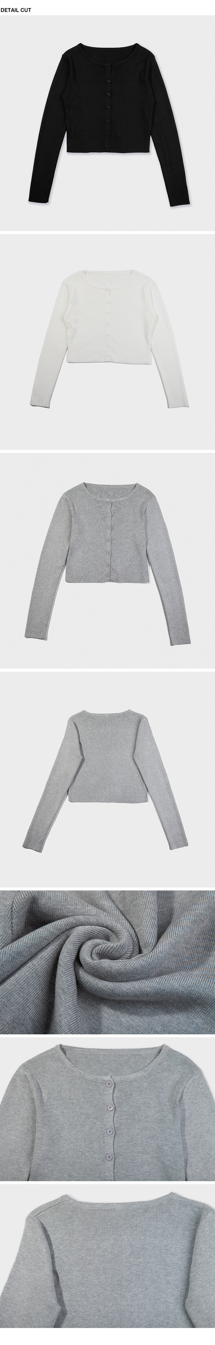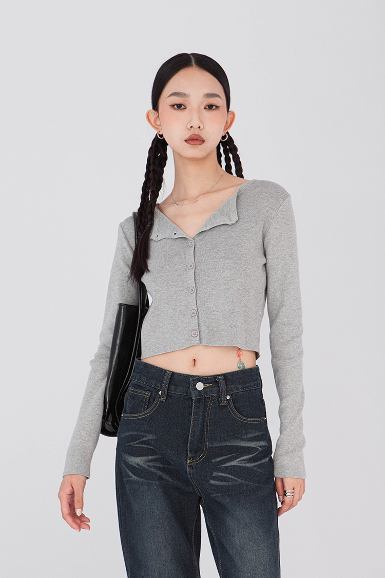 寬圓領,正面單排扣開襟衫,羅紋針織,有彈性,長袖,短版,可以當作上衣或是外套,輕鬆的在不同場合中切換使用,增添層次感。