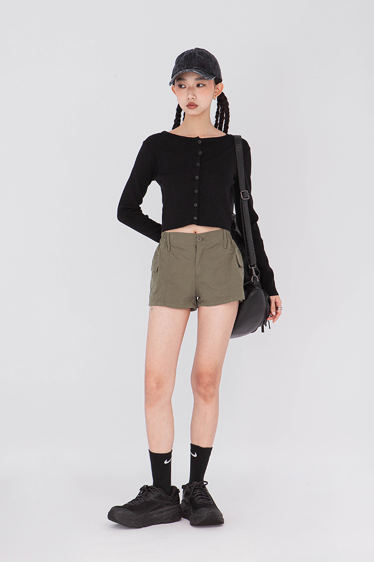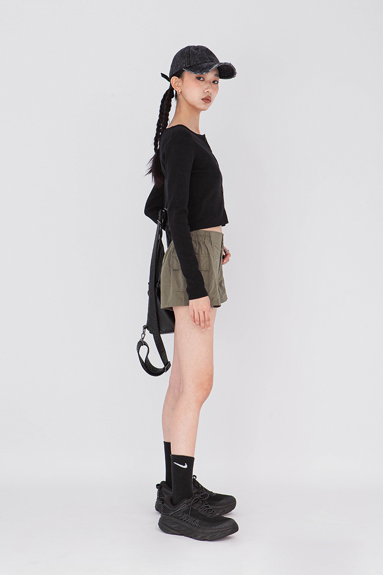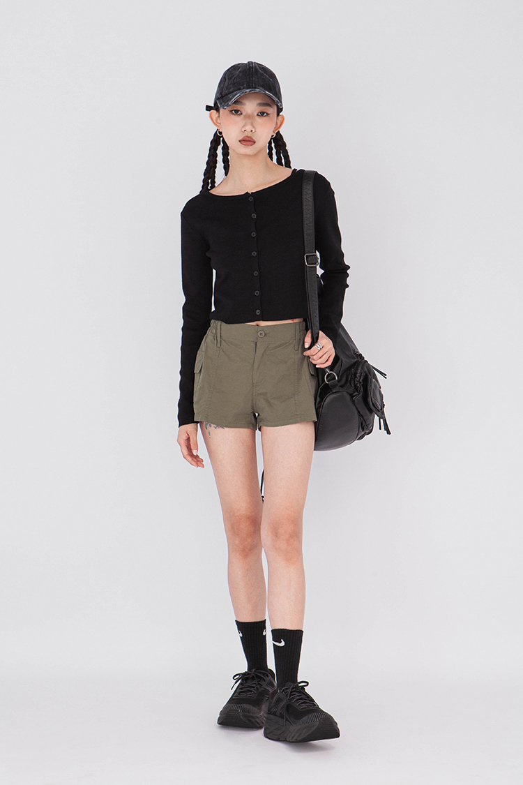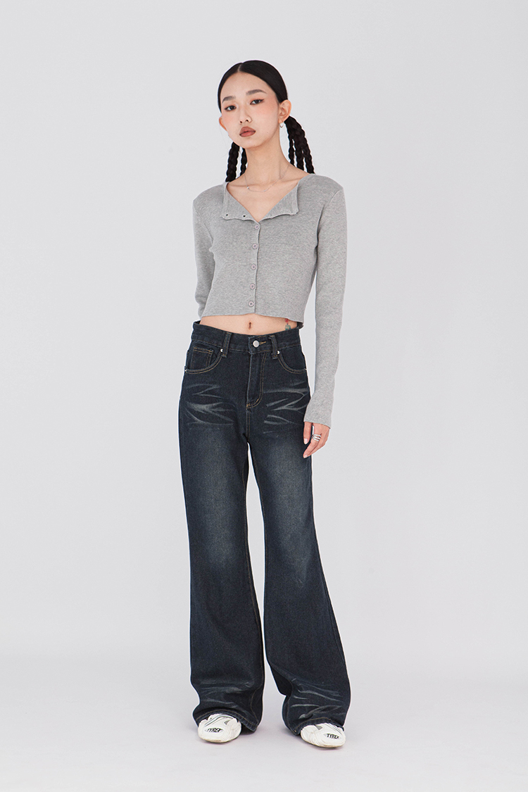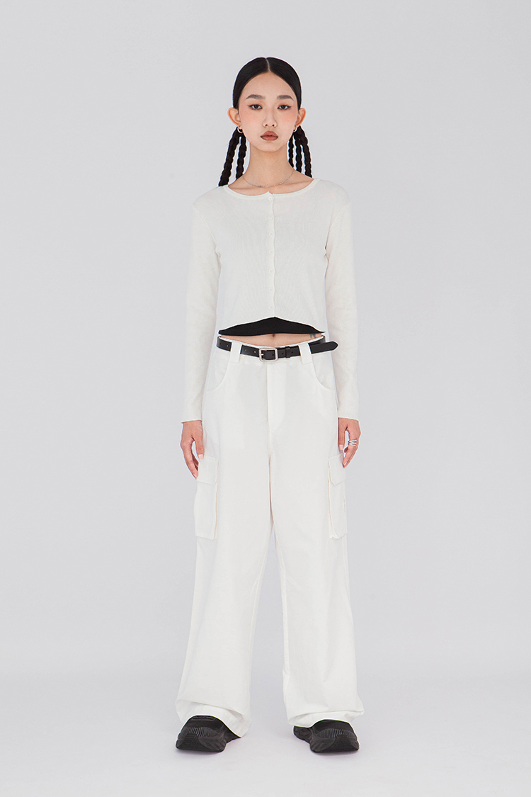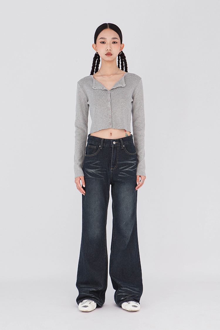 寬圓領,正面單排扣開襟衫,羅紋針織,有彈性,長袖,短版,可以當作上衣或是外套,輕鬆的在不同場合中切換使用,增添層次感。