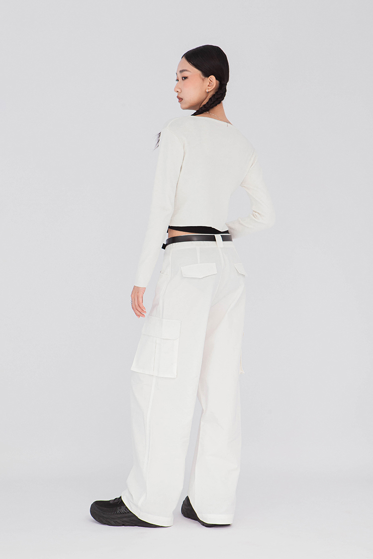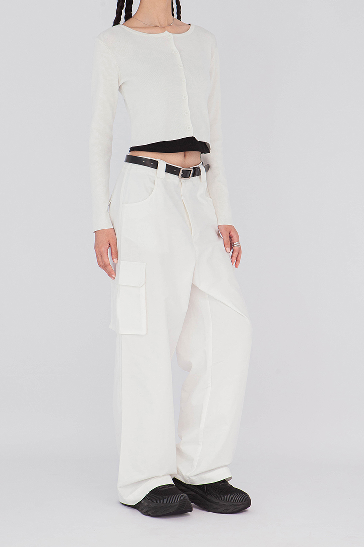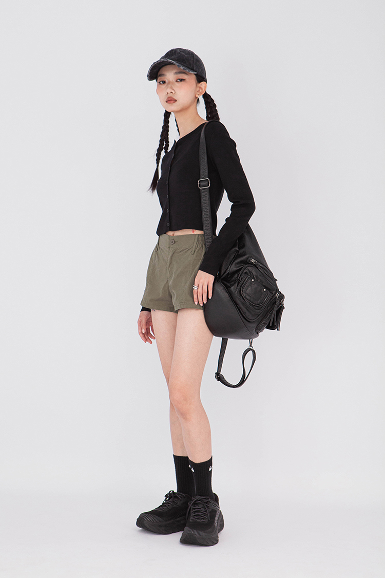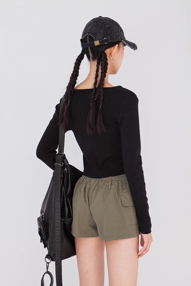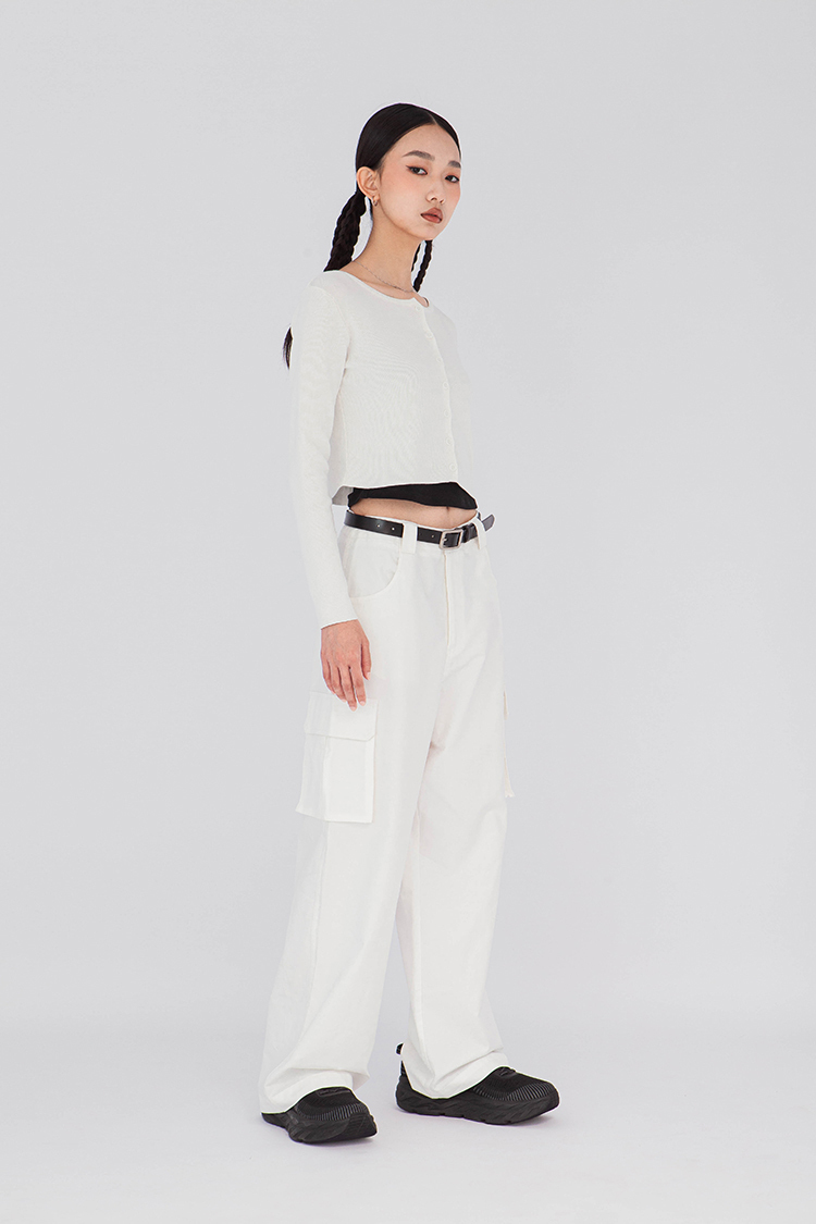 寬圓領,正面單排扣開襟衫,羅紋針織,有彈性,長袖,短版,可以當作上衣或是外套,輕鬆的在不同場合中切換使用,增添層次感。