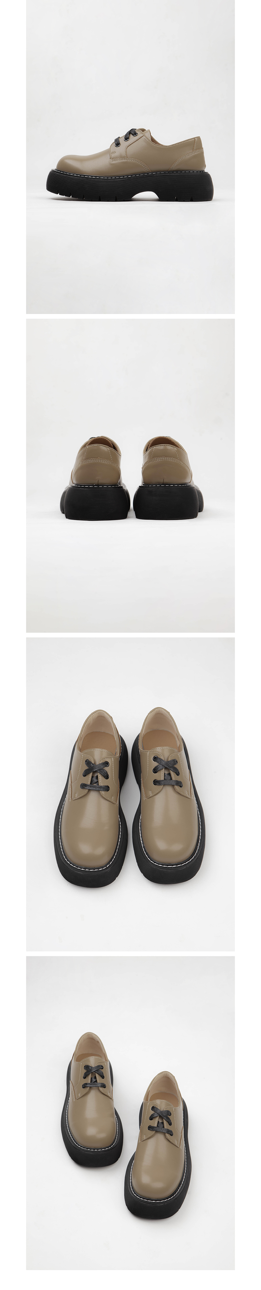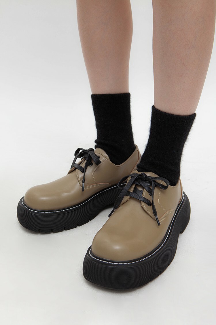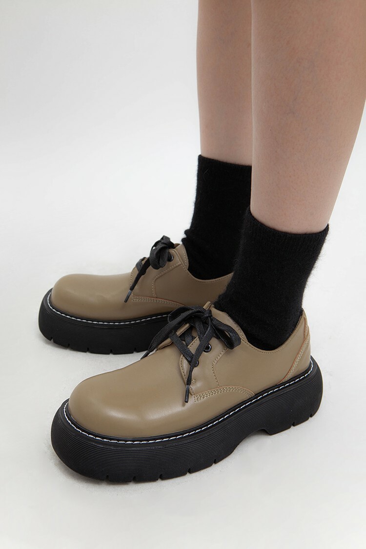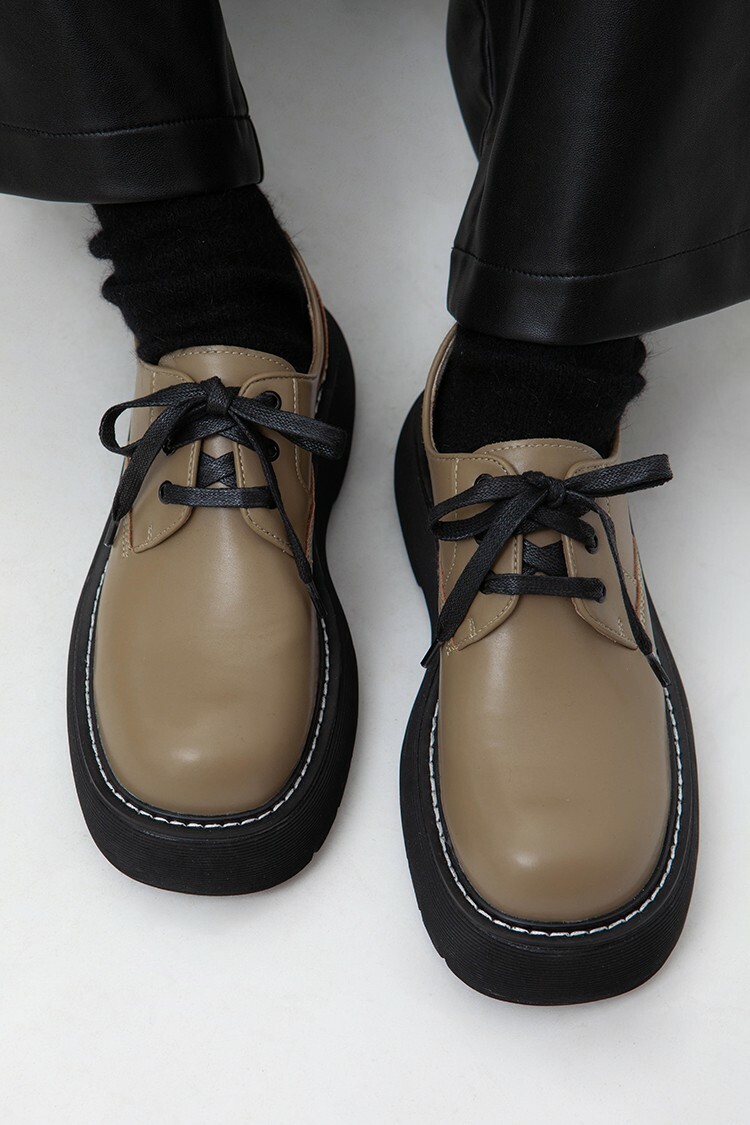 圓頭厚底鞋,楦頭修長,抛光表面,綁繩繫帶,白色明線,鞋面使用彩度低的酪梨綠,膚色內裡,有重量感,舒適行走,整體淡雅舒適的視覺感受。