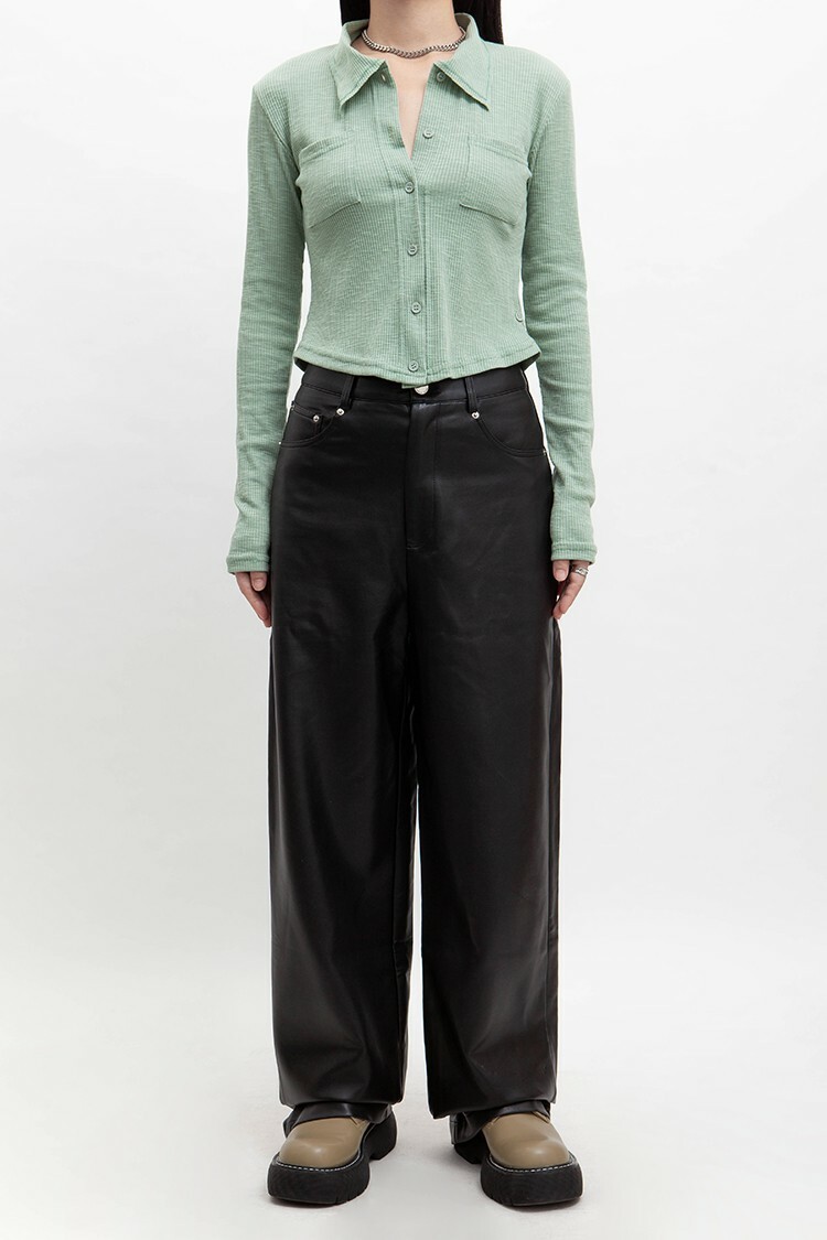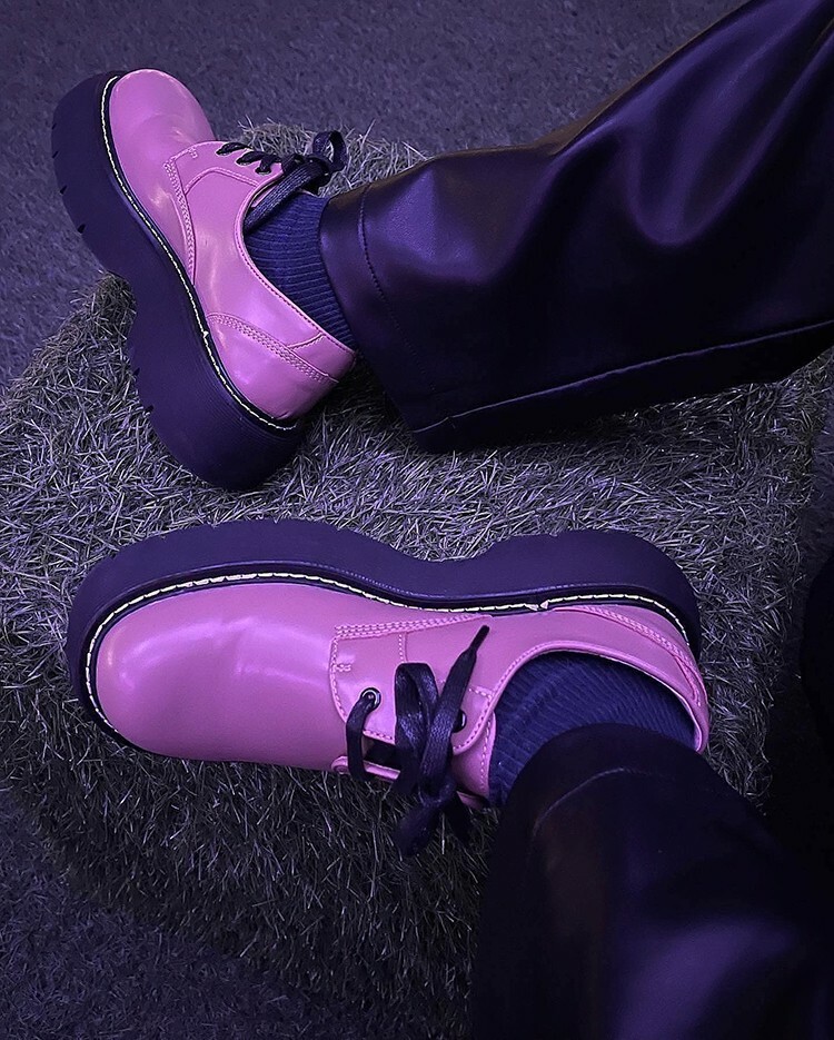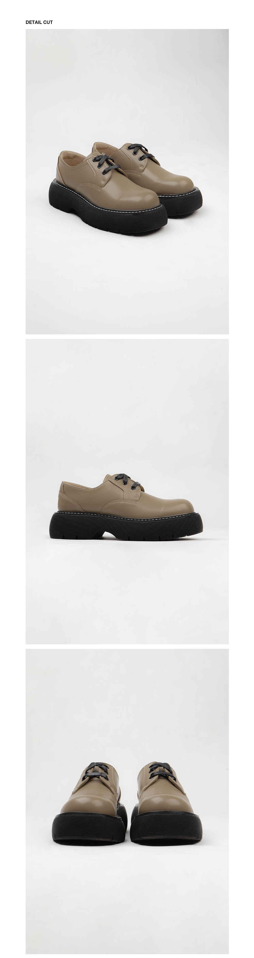 圓頭厚底鞋,楦頭修長,抛光表面,綁繩繫帶,白色明線,鞋面使用彩度低的酪梨綠,膚色內裡,有重量感,舒適行走,整體淡雅舒適的視覺感受。