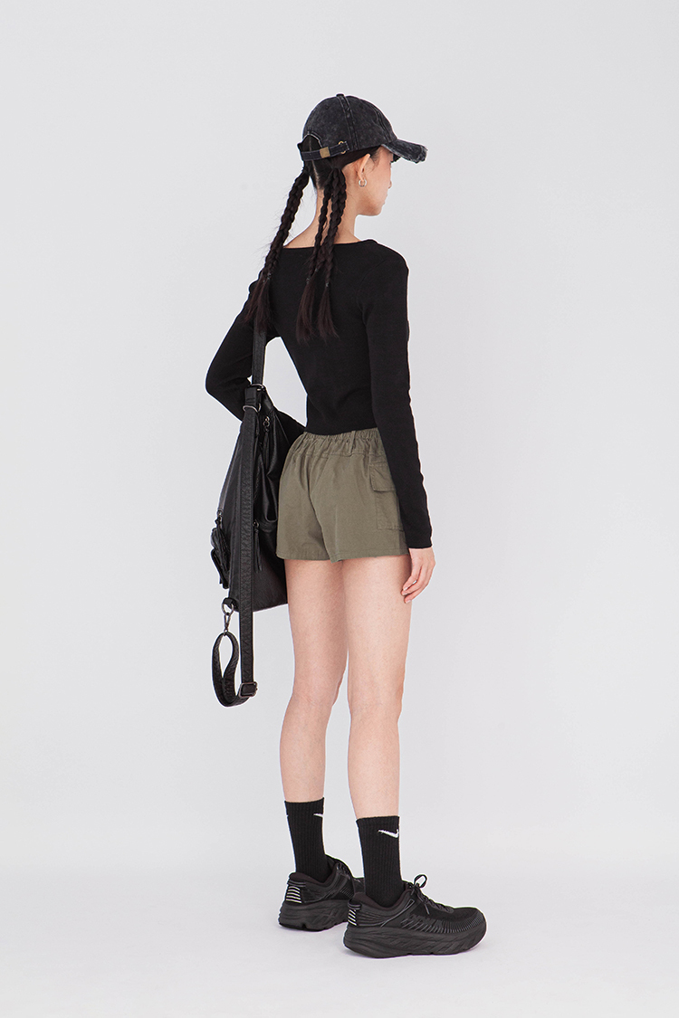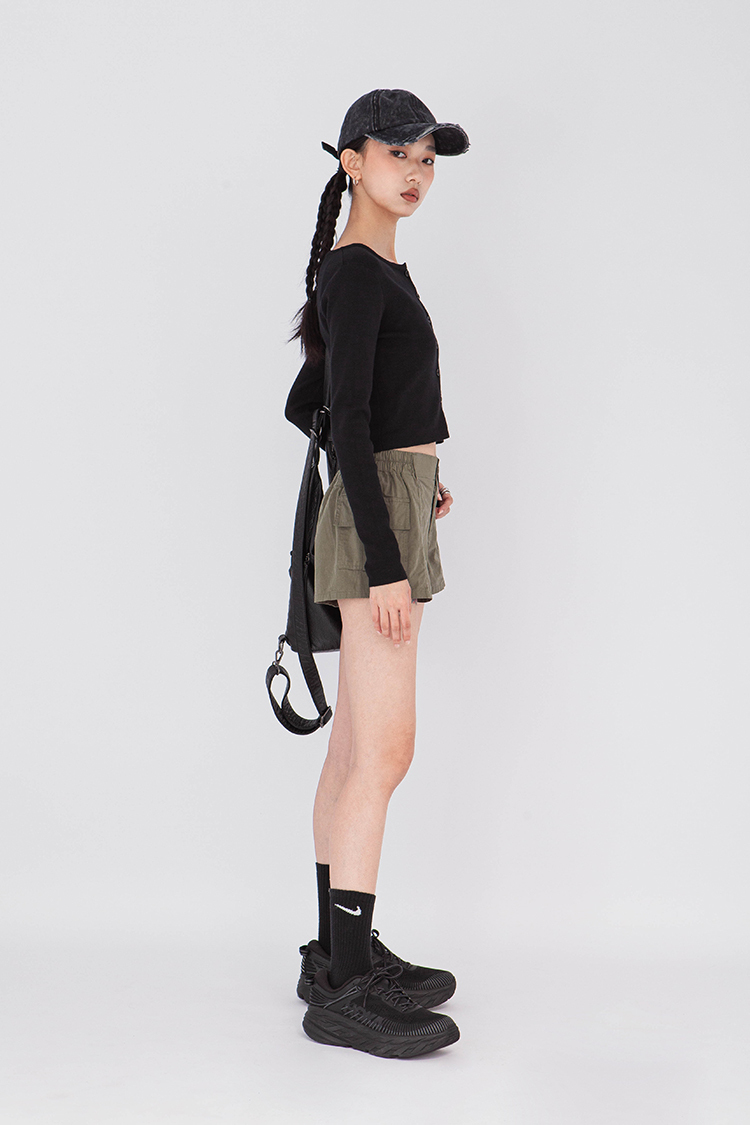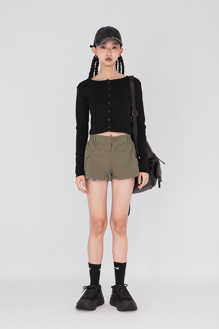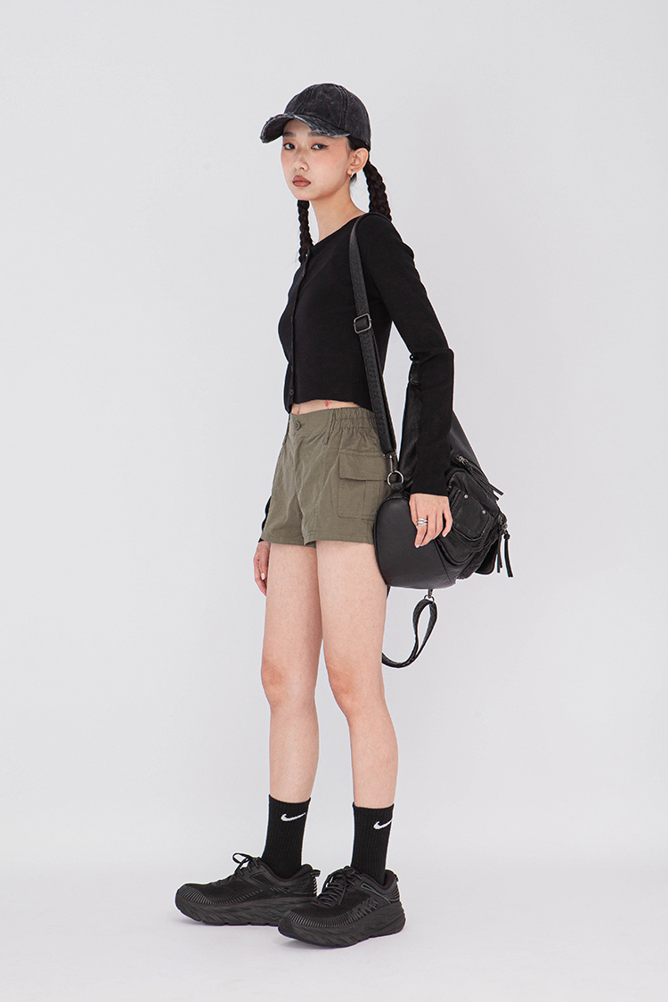 中腰,鬆緊貼身褲頭,鈕釦拉鍊閉合,側邊翻蓋式口袋,簡單搭配T恤、球鞋或拖鞋,享受陽光、沙灘、慢步的日常。