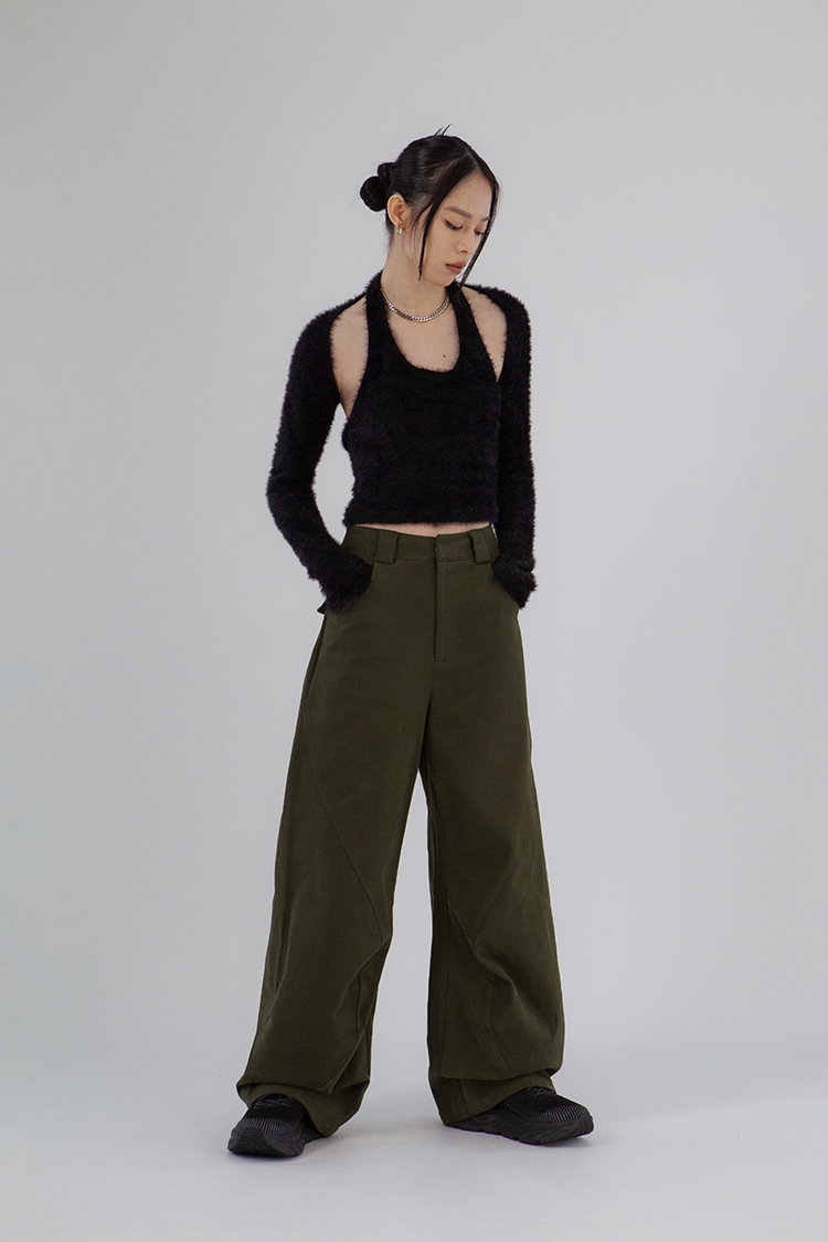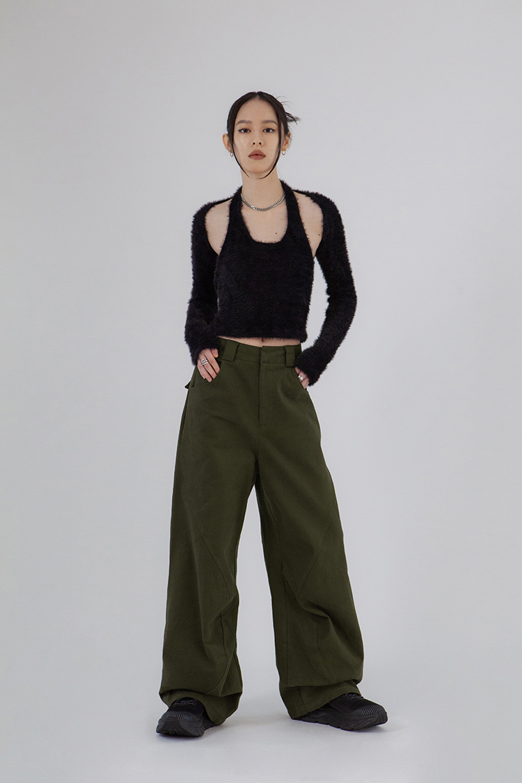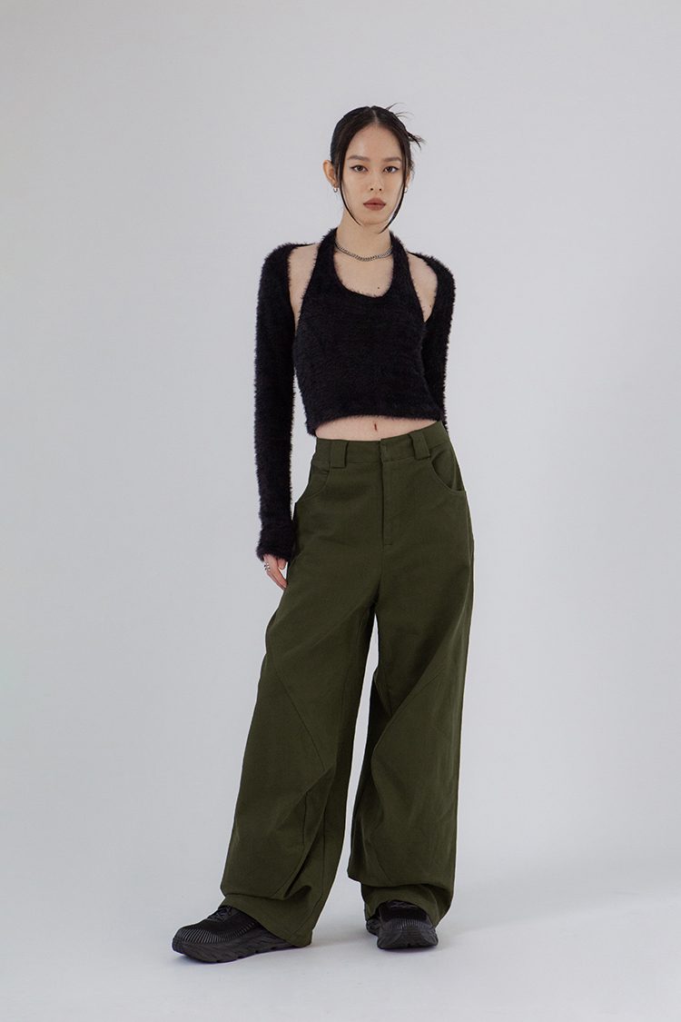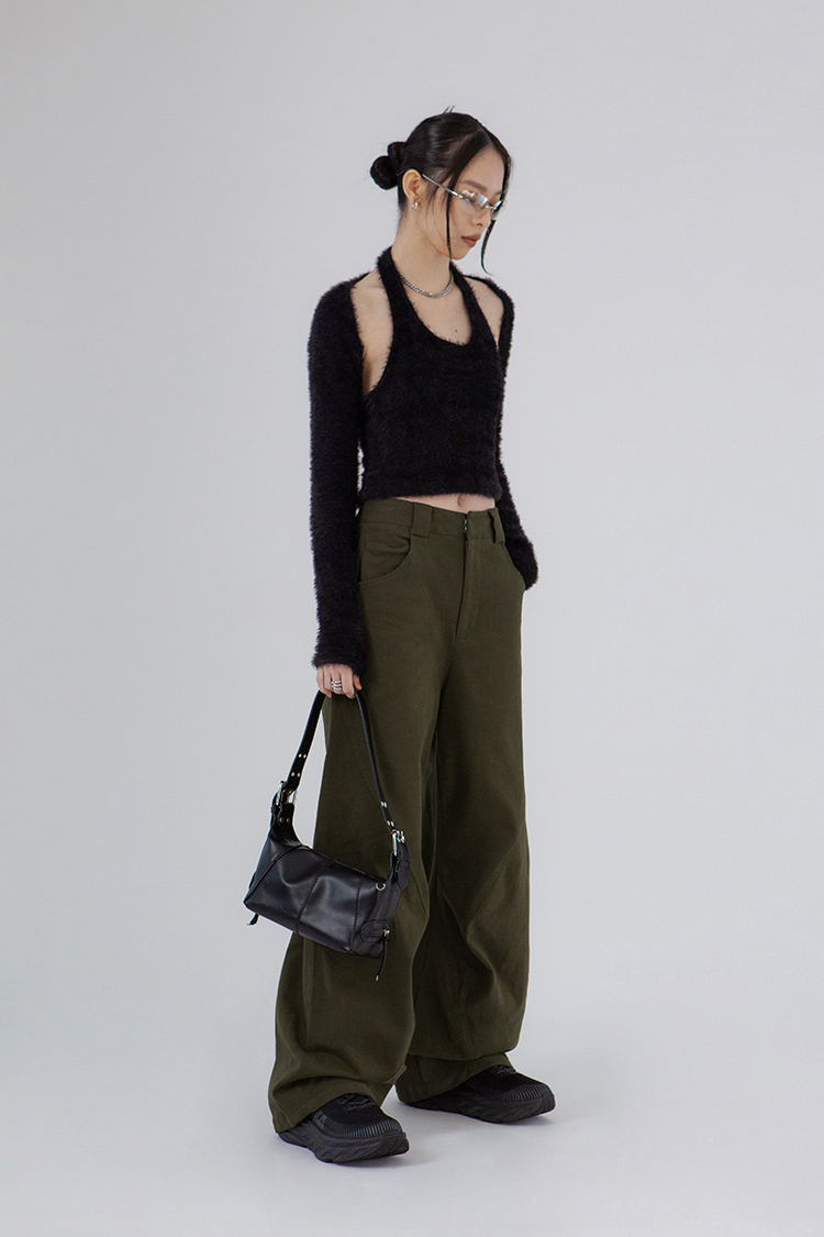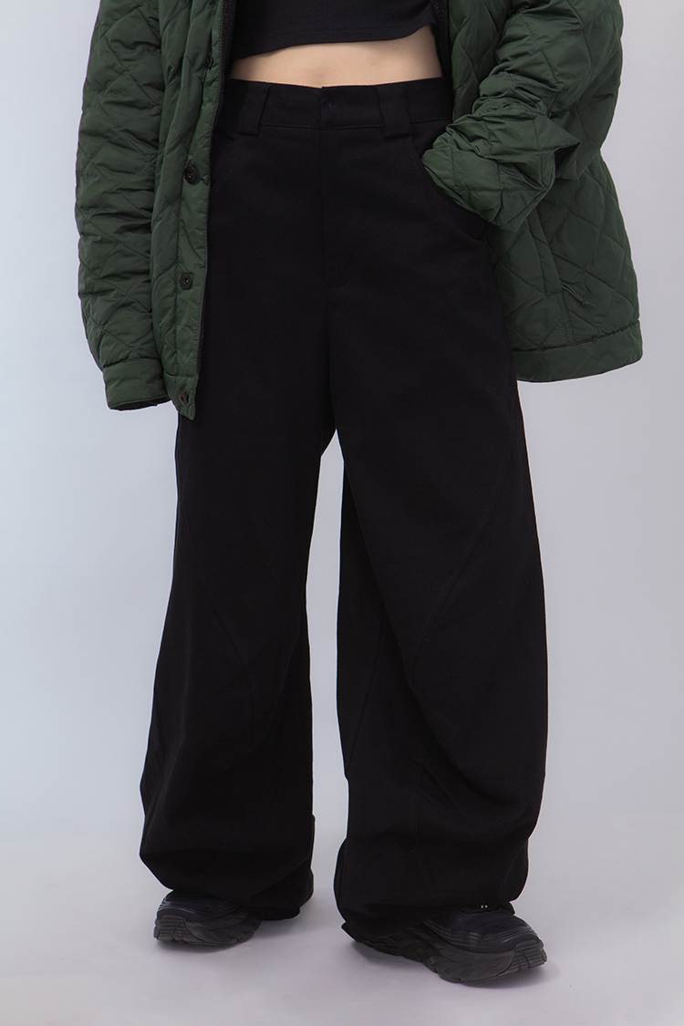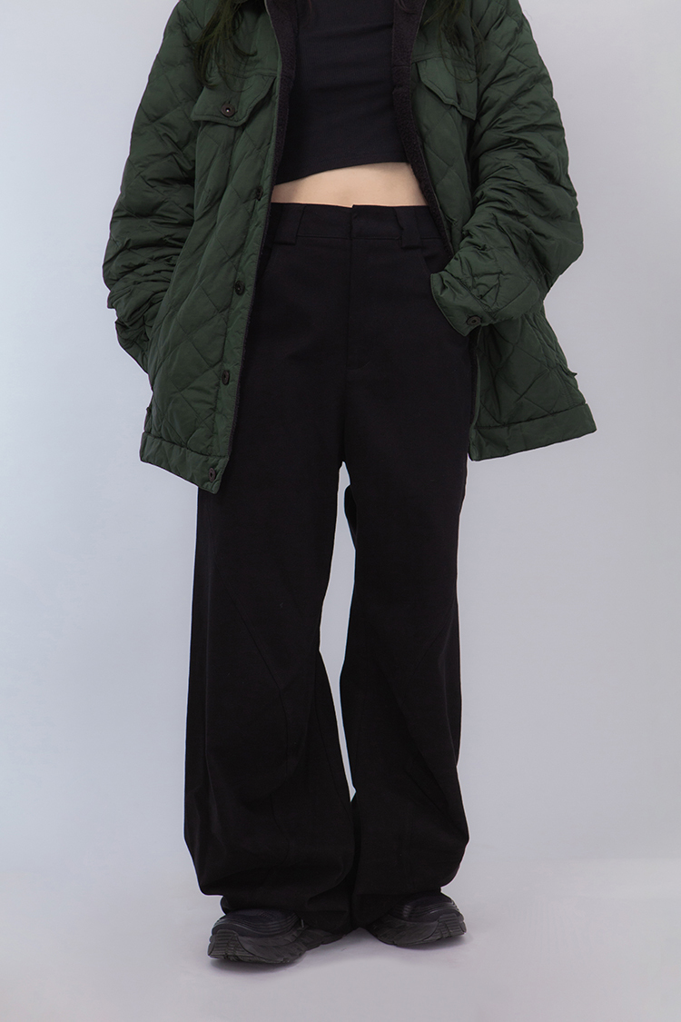 中腰,弧形側邊縫線拼接設計,拉鍊門襟配隱形鉤扣,兩側口袋,寬管休閒褲,斜紋布料,中等厚度,柔軟短絨毛表面,親膚溫暖,最百搭的必備單品之一。