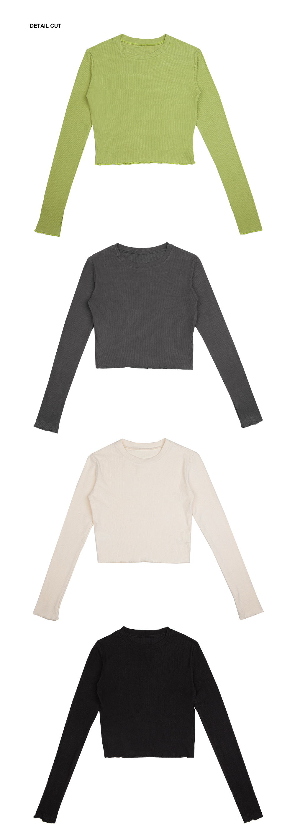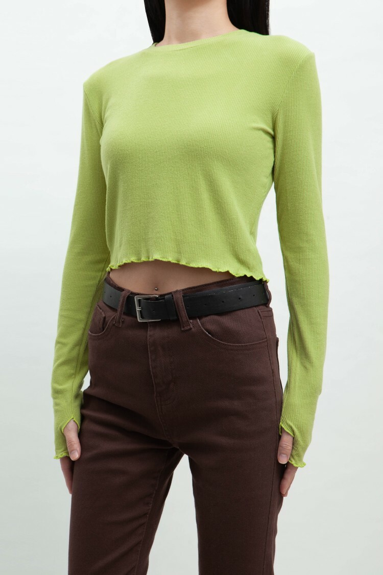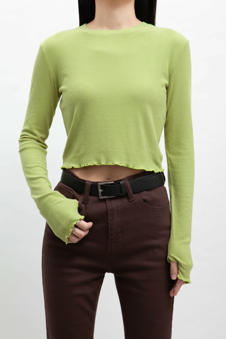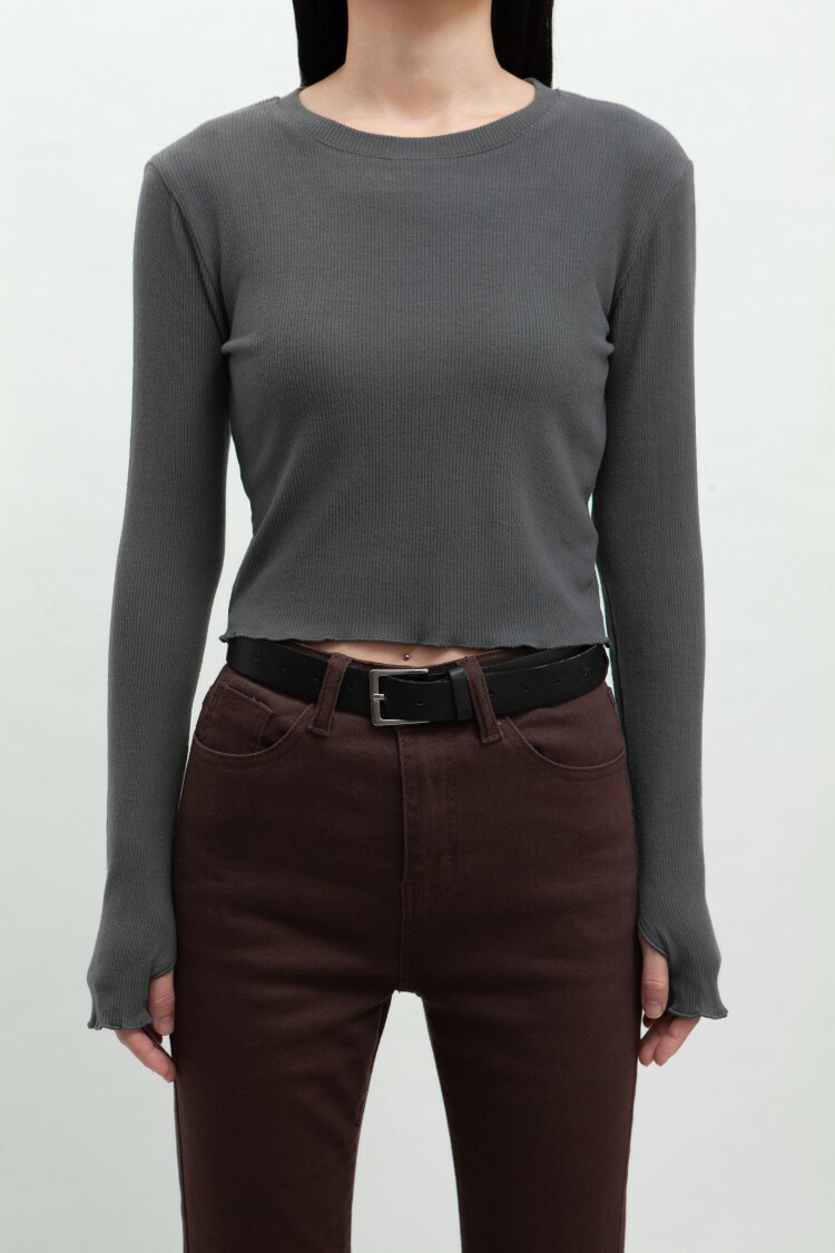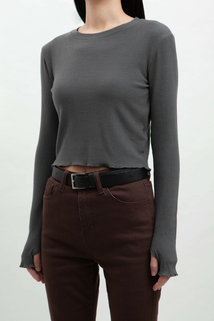 小圓領,羅紋布料,長袖短版,拇指扣設計,手袖與下擺捲邊處理,基礎實穿多色選擇。