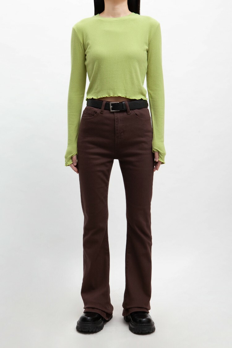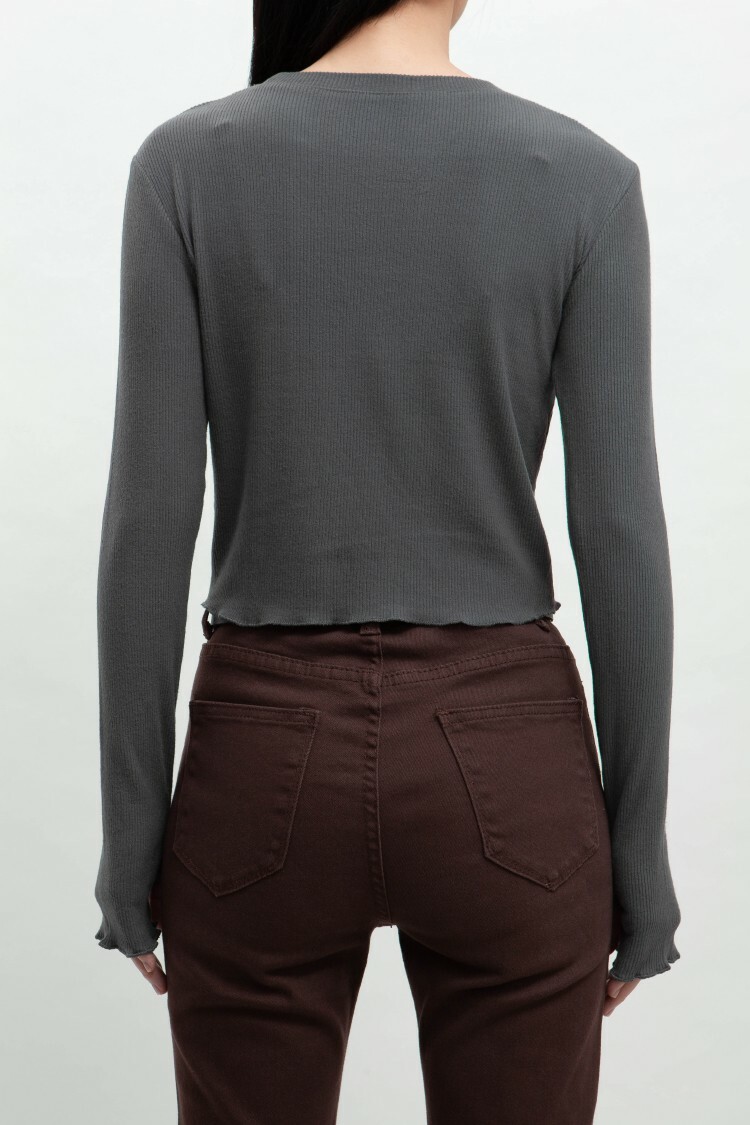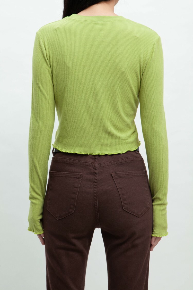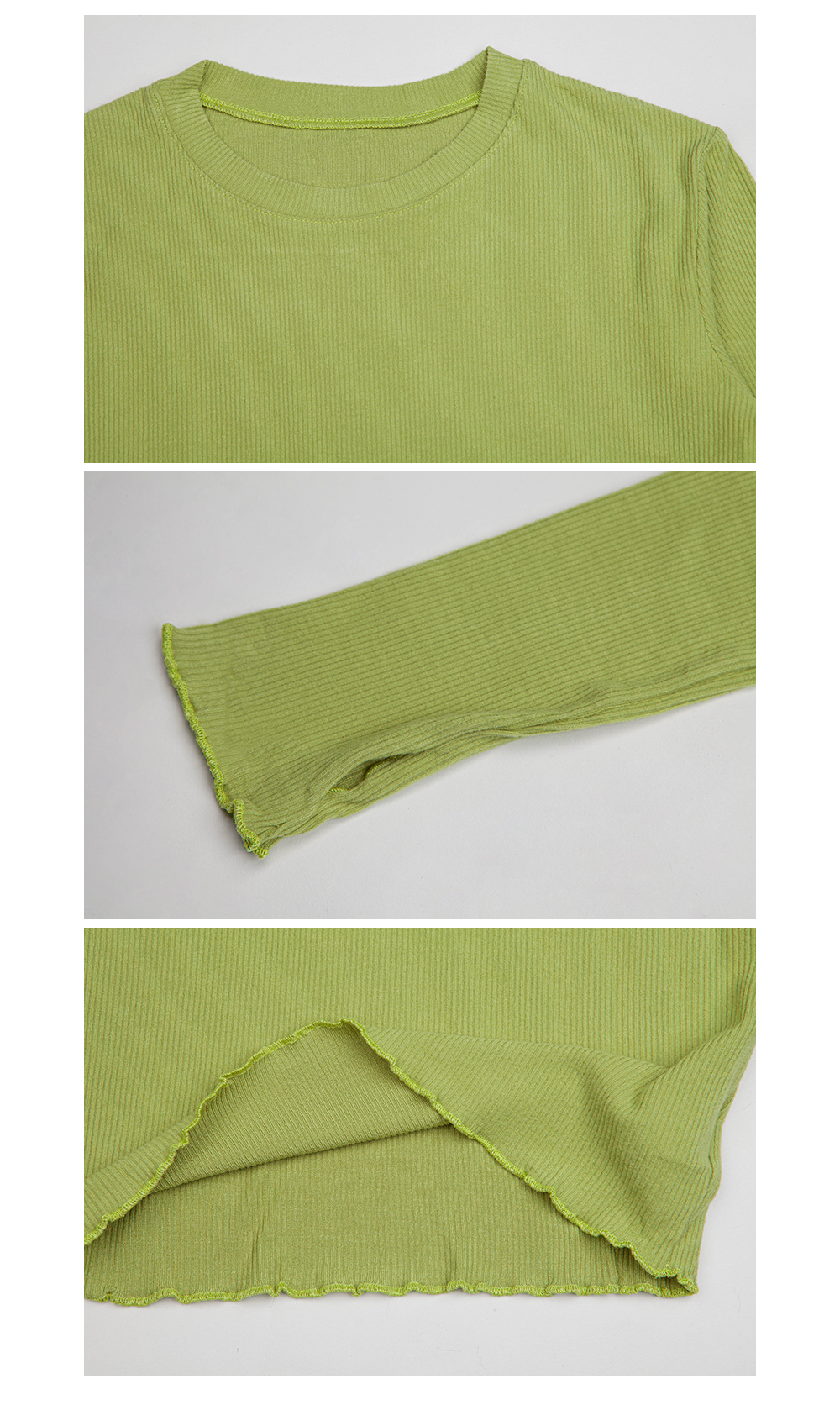小圓領,羅紋布料,長袖短版,拇指扣設計,手袖與下擺捲邊處理,基礎實穿多色選擇。