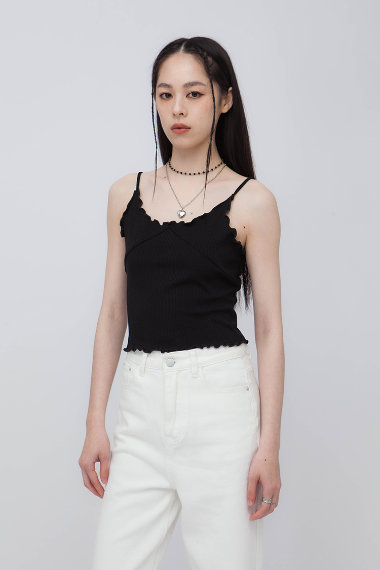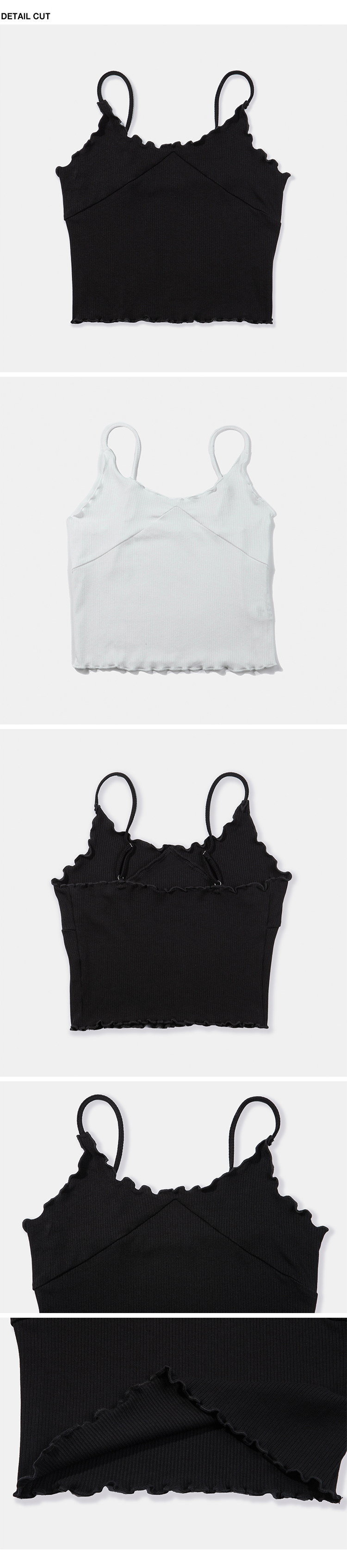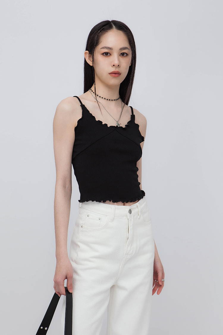 V領,無袖細肩背心,捲邊於外圍整體輪廓,可調肩帶,露背,短版,羅紋布料,良好彈性,可愛軟萌。