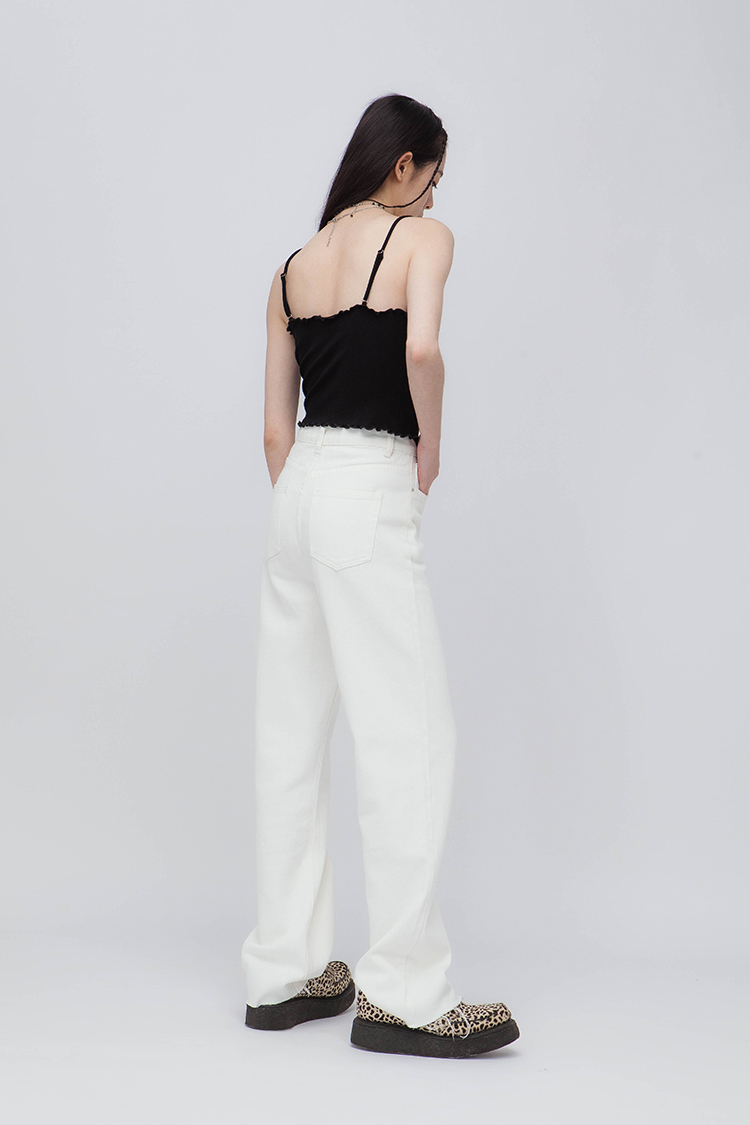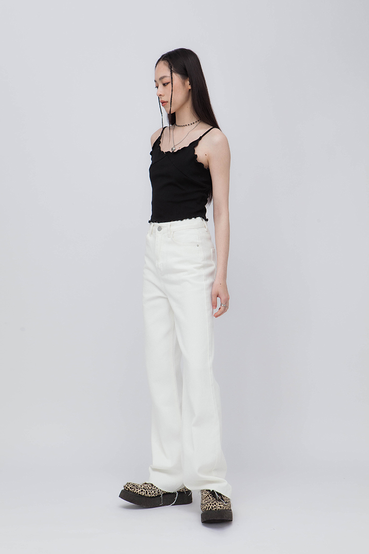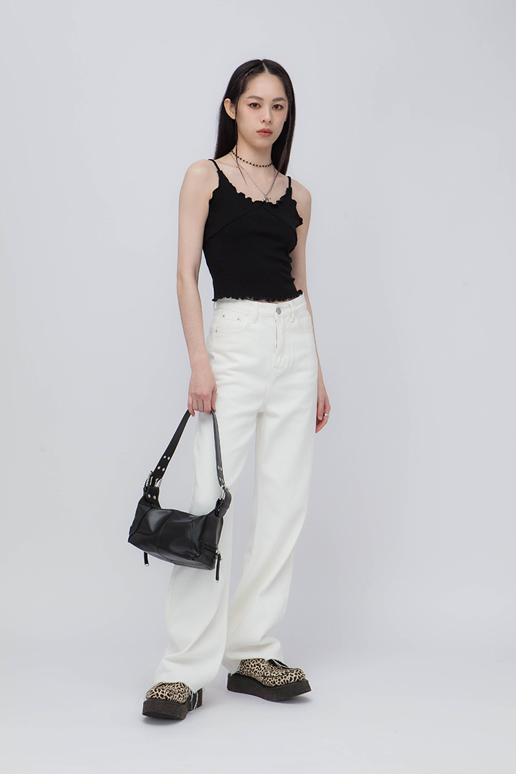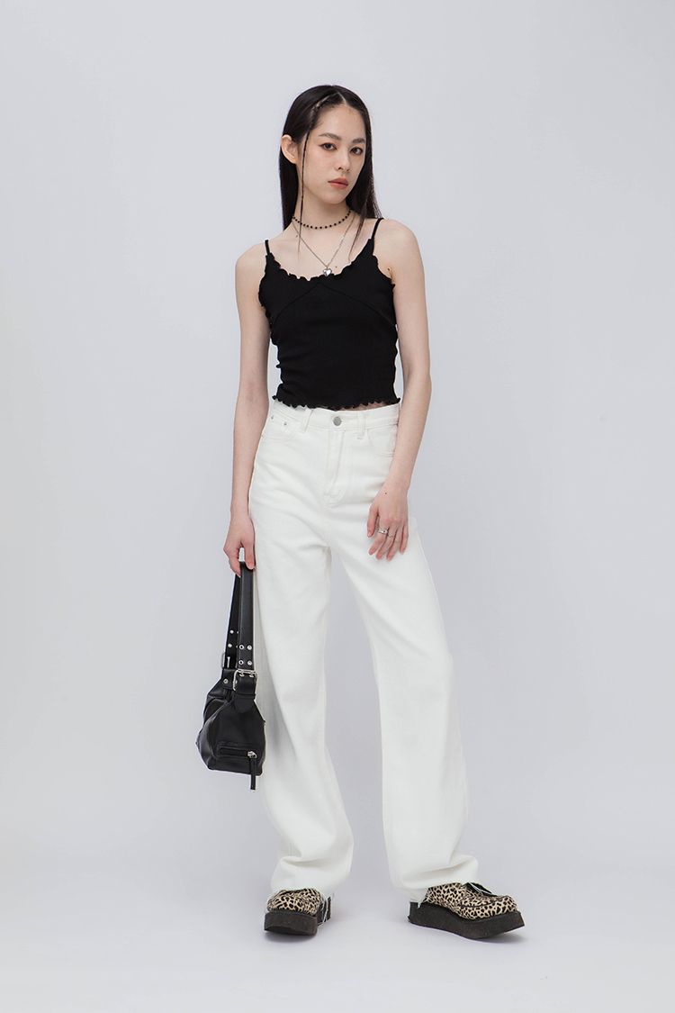 V領,無袖細肩背心,捲邊於外圍整體輪廓,可調肩帶,露背,短版,羅紋布料,良好彈性,可愛軟萌。