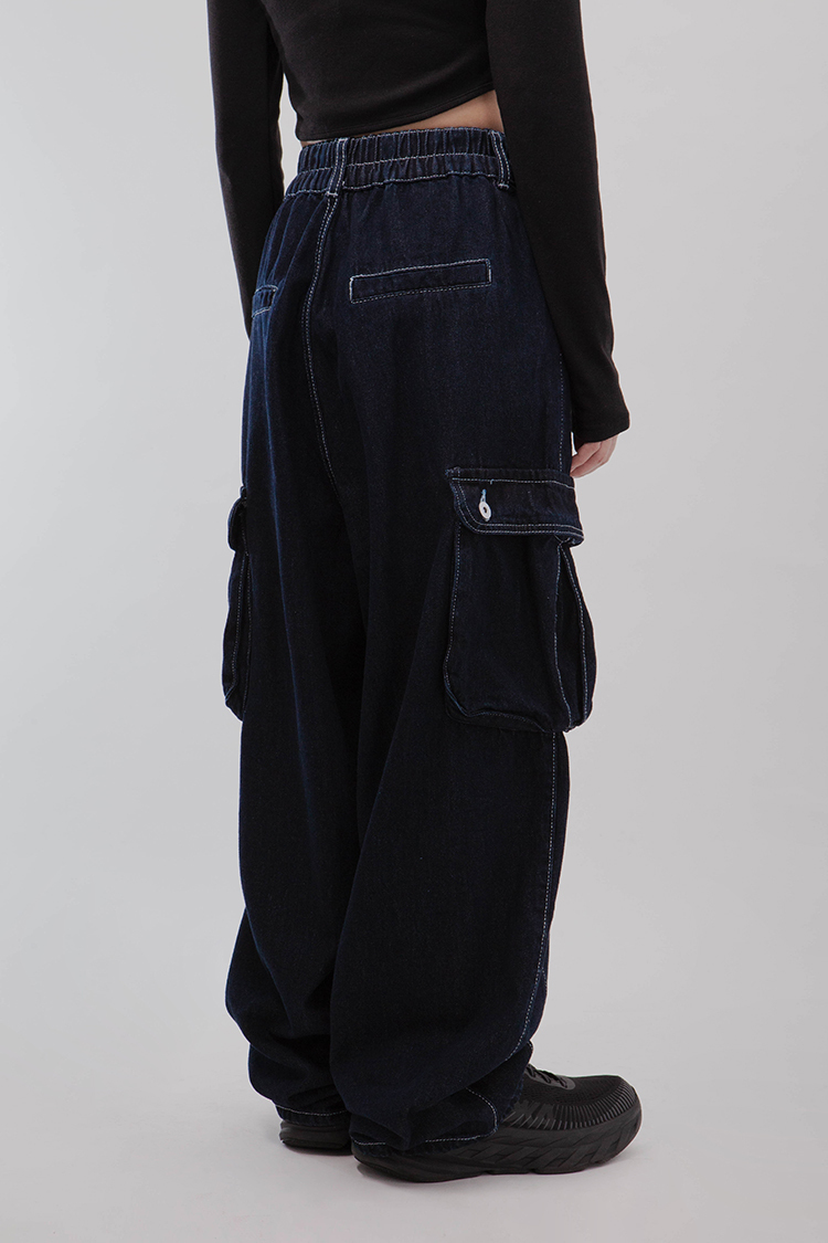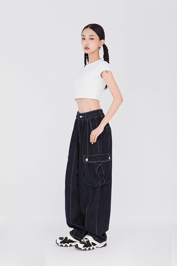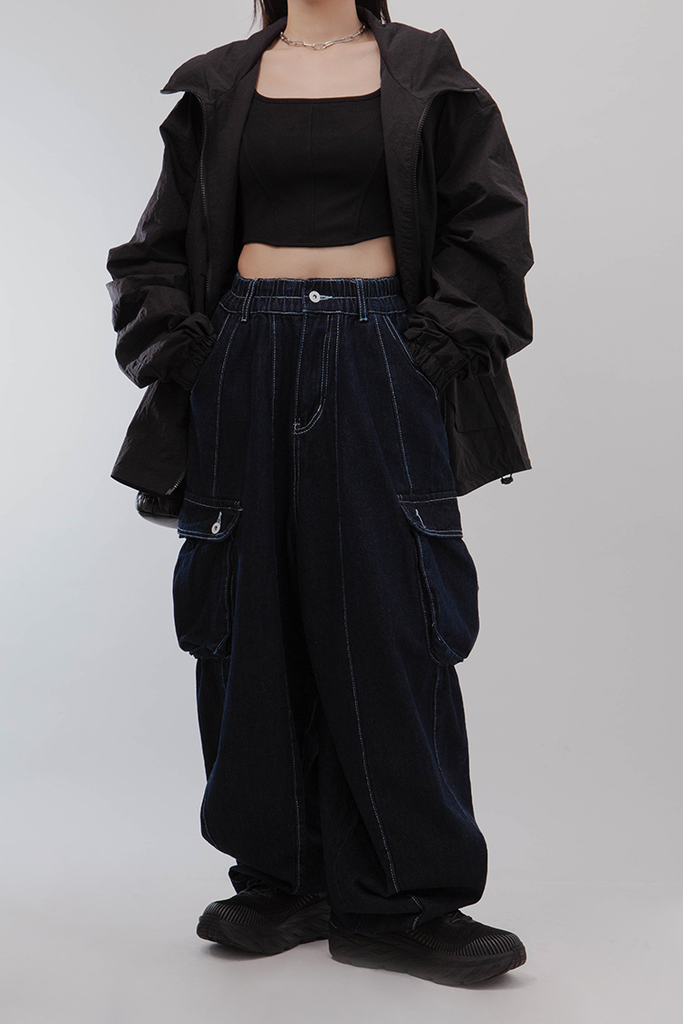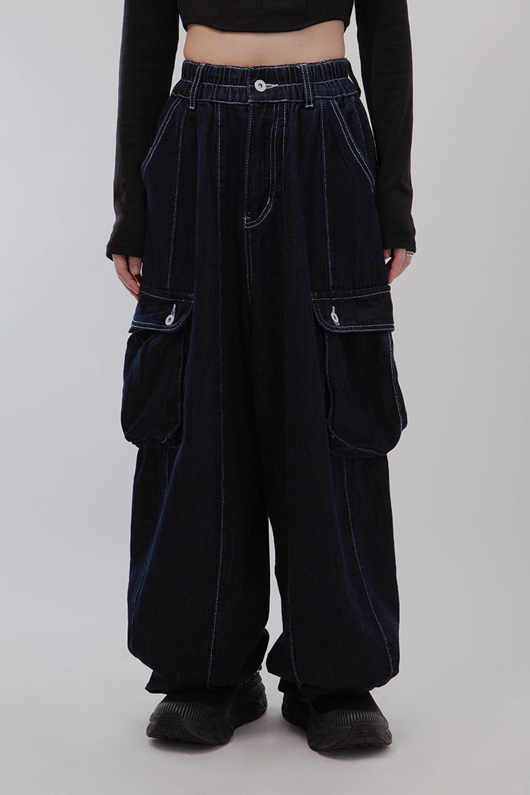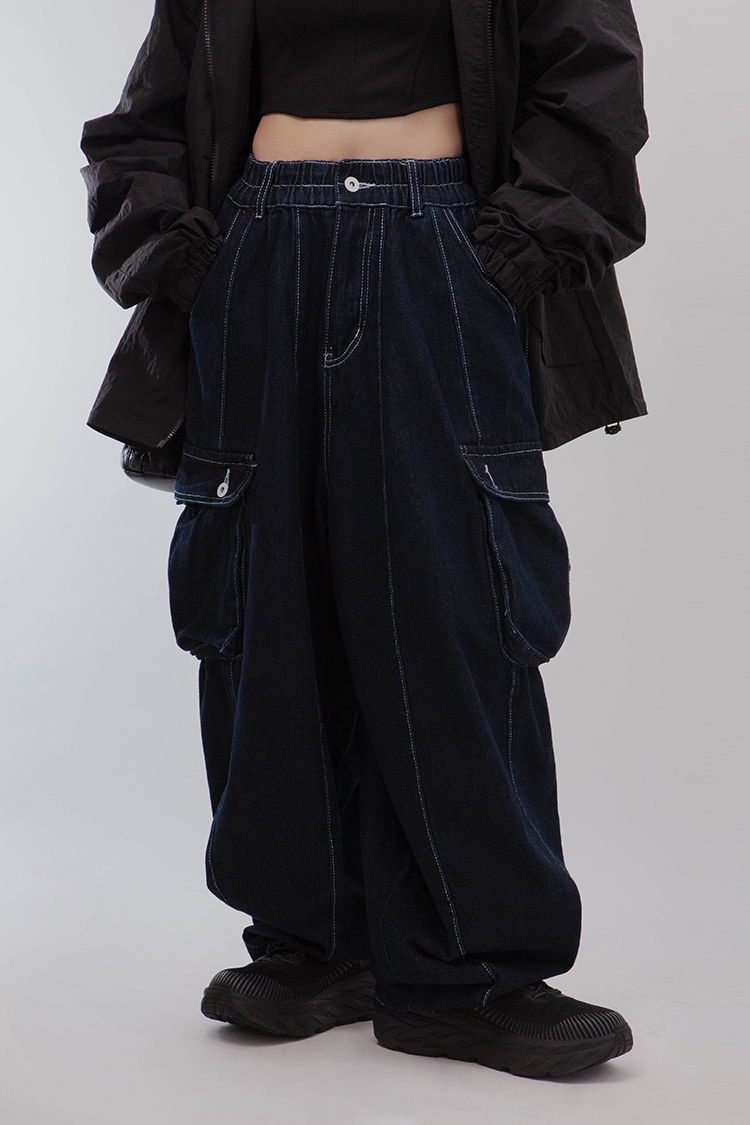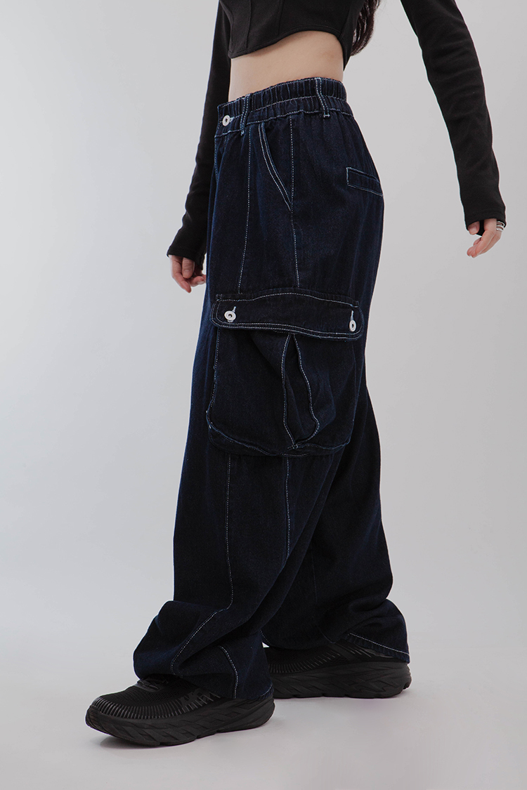 鬆緊褲頭,鈕釦拉鍊閉合,深藍色與白色立體明線設計,寬鬆弧形輪廓,兩側插袋與兩個翻蓋式口袋,背面裝飾口袋,讓我走出舒適的穿搭風格。(無性別)