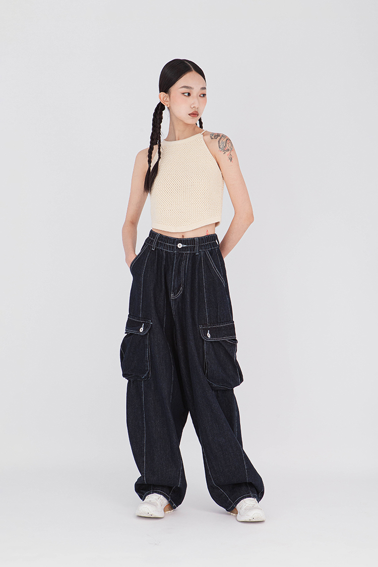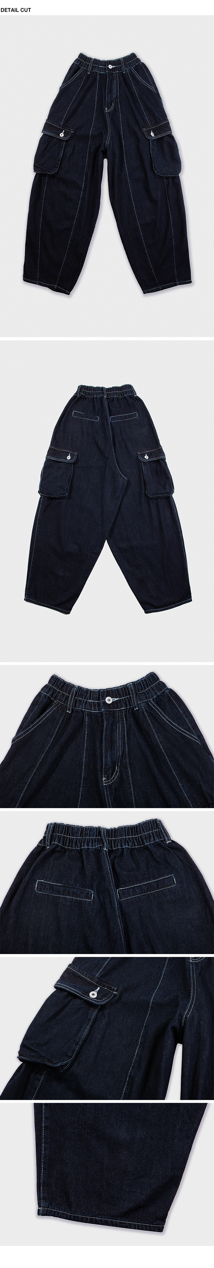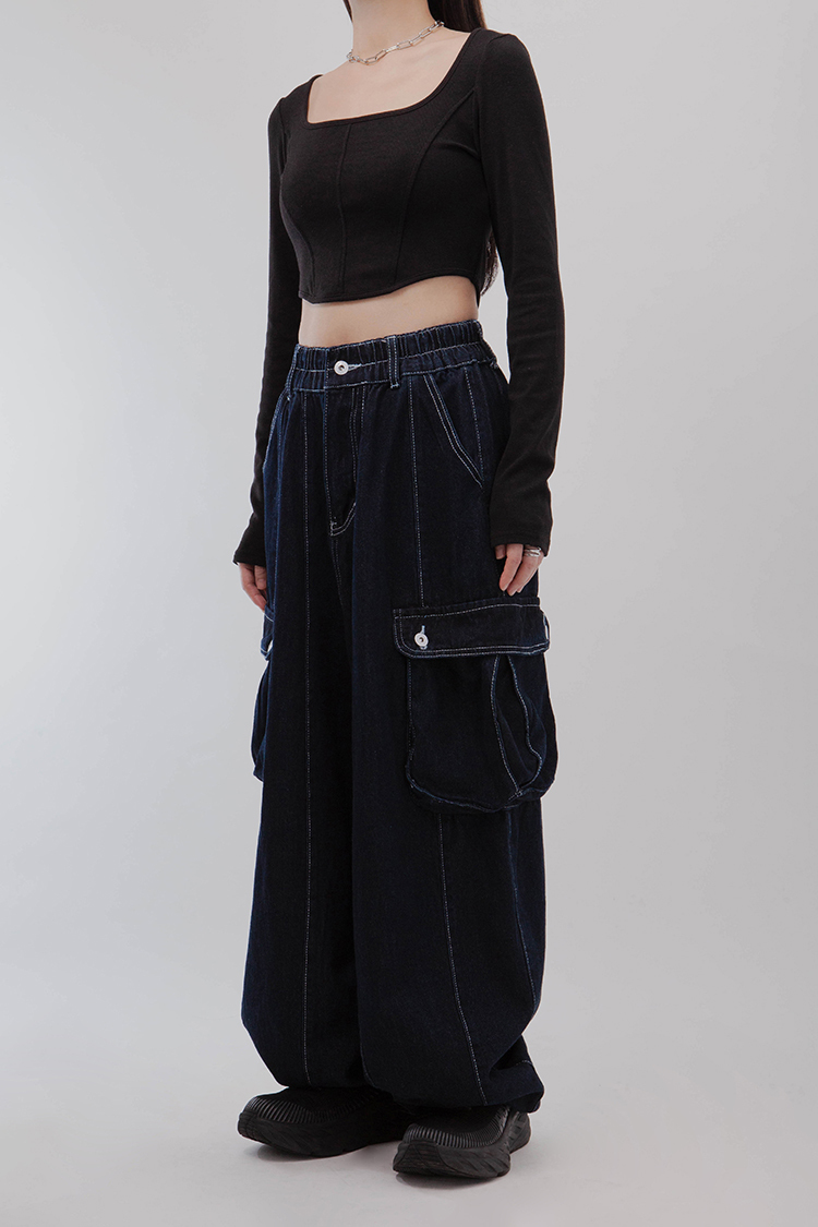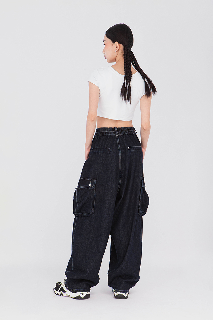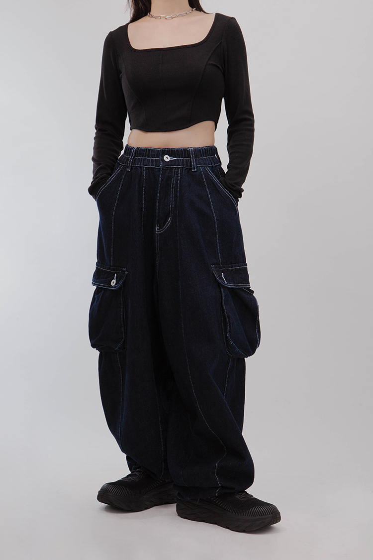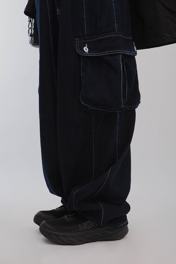 鬆緊褲頭,鈕釦拉鍊閉合,深藍色與白色立體明線設計,寬鬆弧形輪廓,兩側插袋與兩個翻蓋式口袋,背面裝飾口袋,讓我走出舒適的穿搭風格。(無性別)