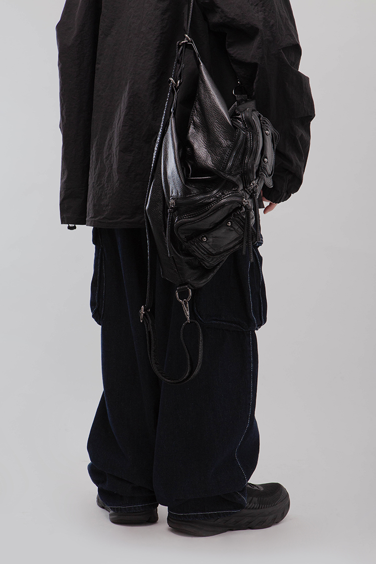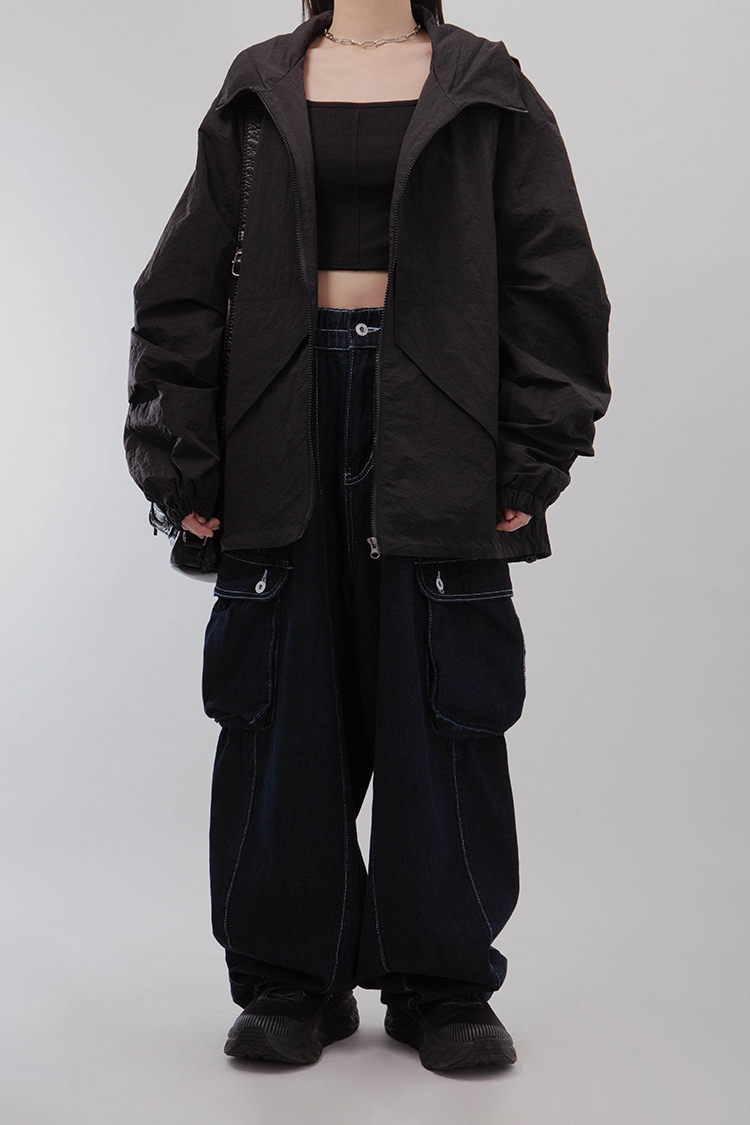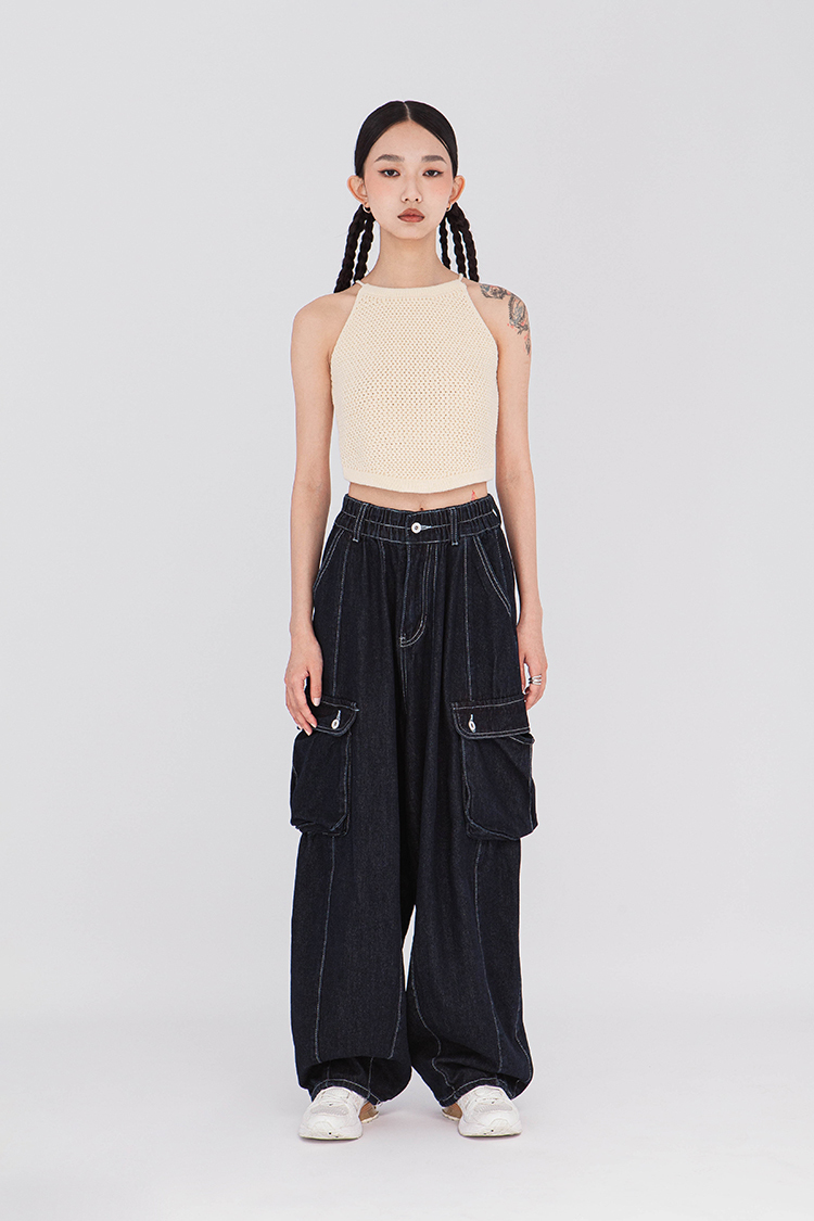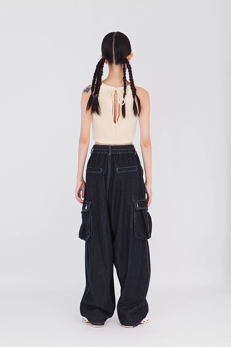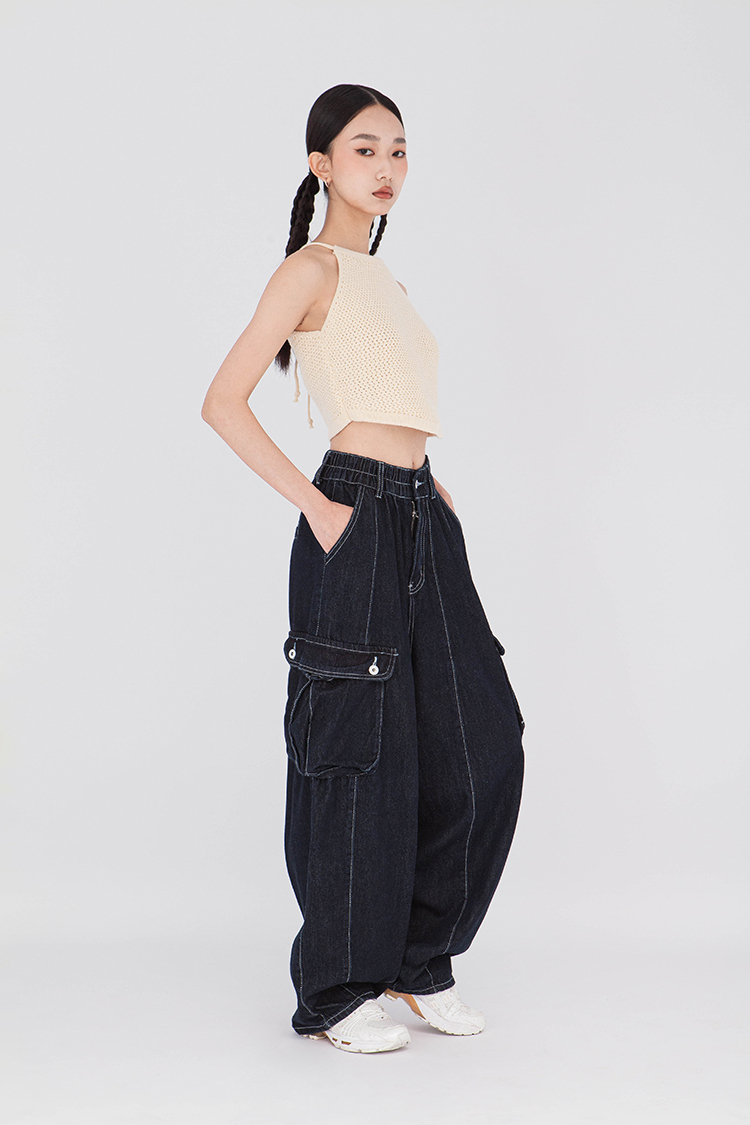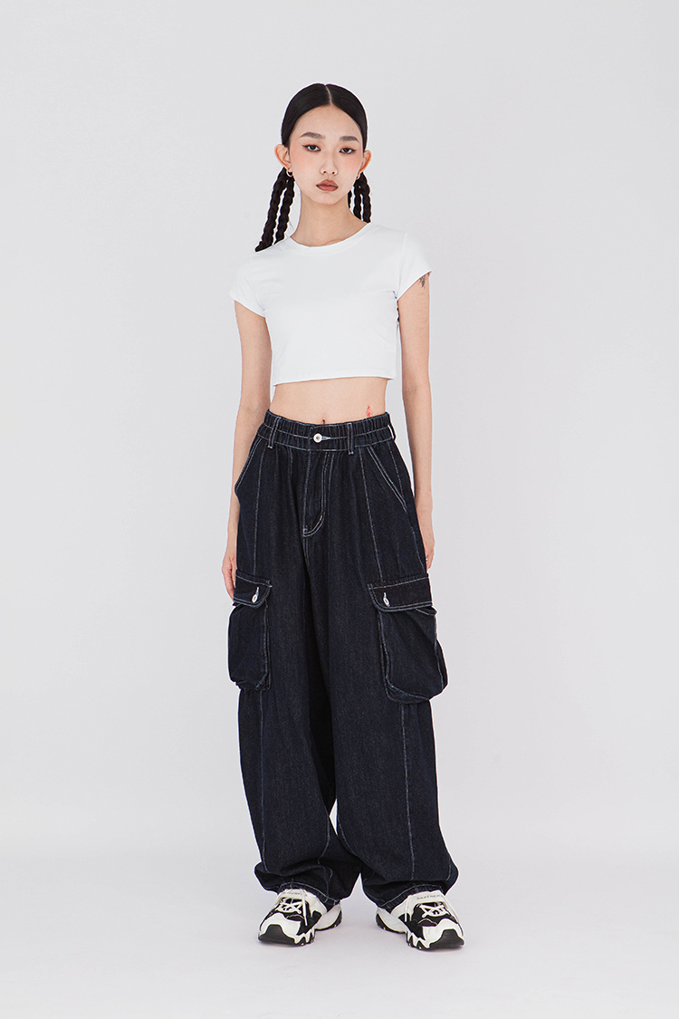 鬆緊褲頭,鈕釦拉鍊閉合,深藍色與白色立體明線設計,寬鬆弧形輪廓,兩側插袋與兩個翻蓋式口袋,背面裝飾口袋,讓我走出舒適的穿搭風格。(無性別)
