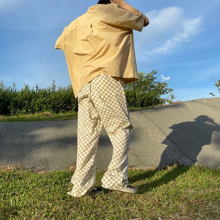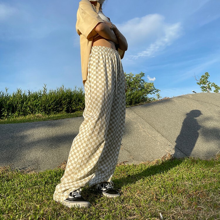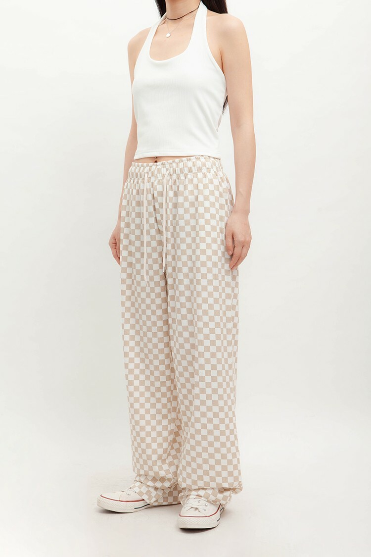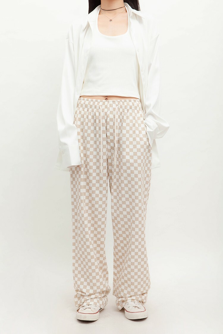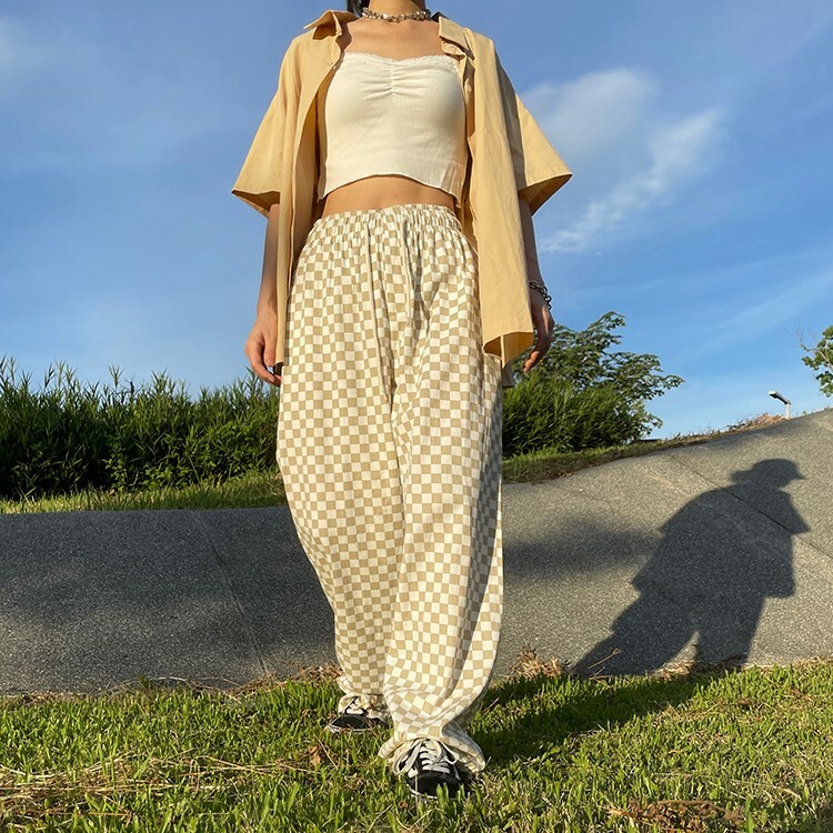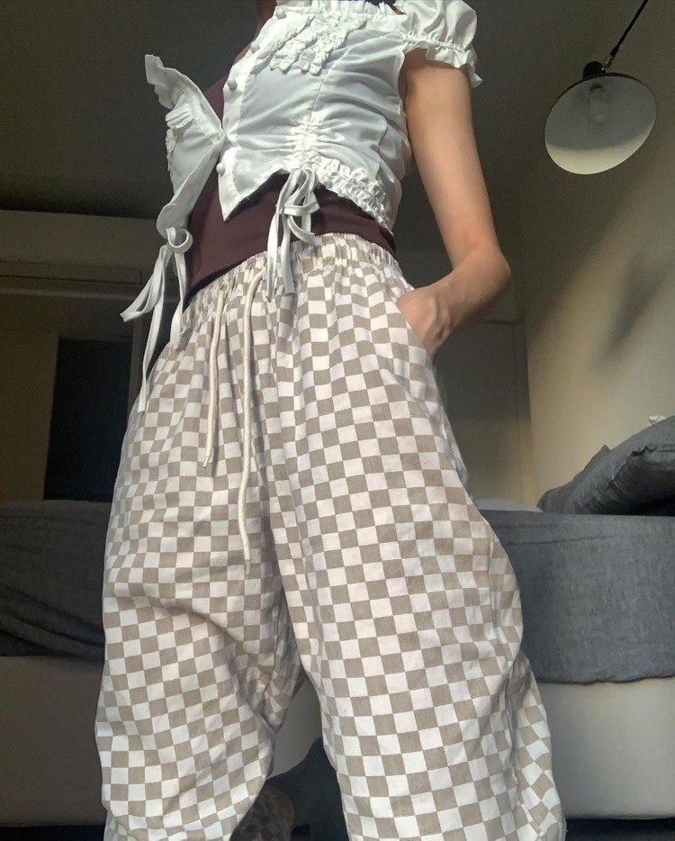 鬆緊褲頭,抽繩設計,白駝格紋相間,兩側斜插袋,背面右側口袋,寬鬆版型。