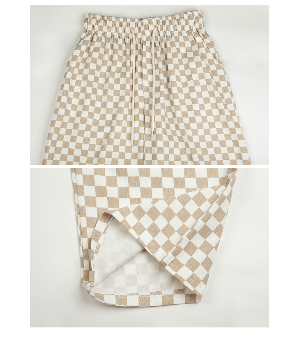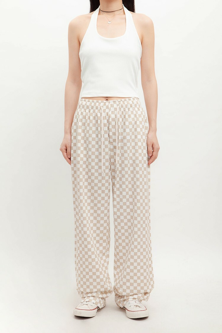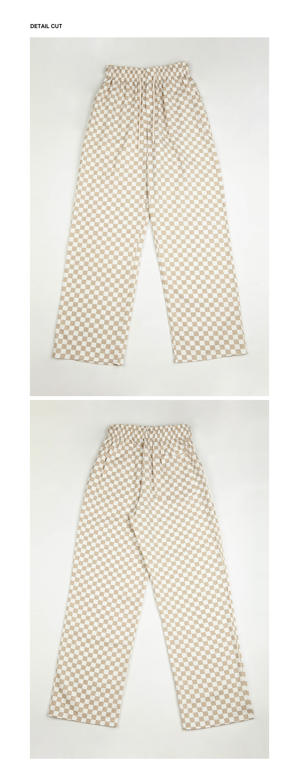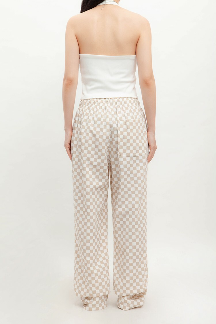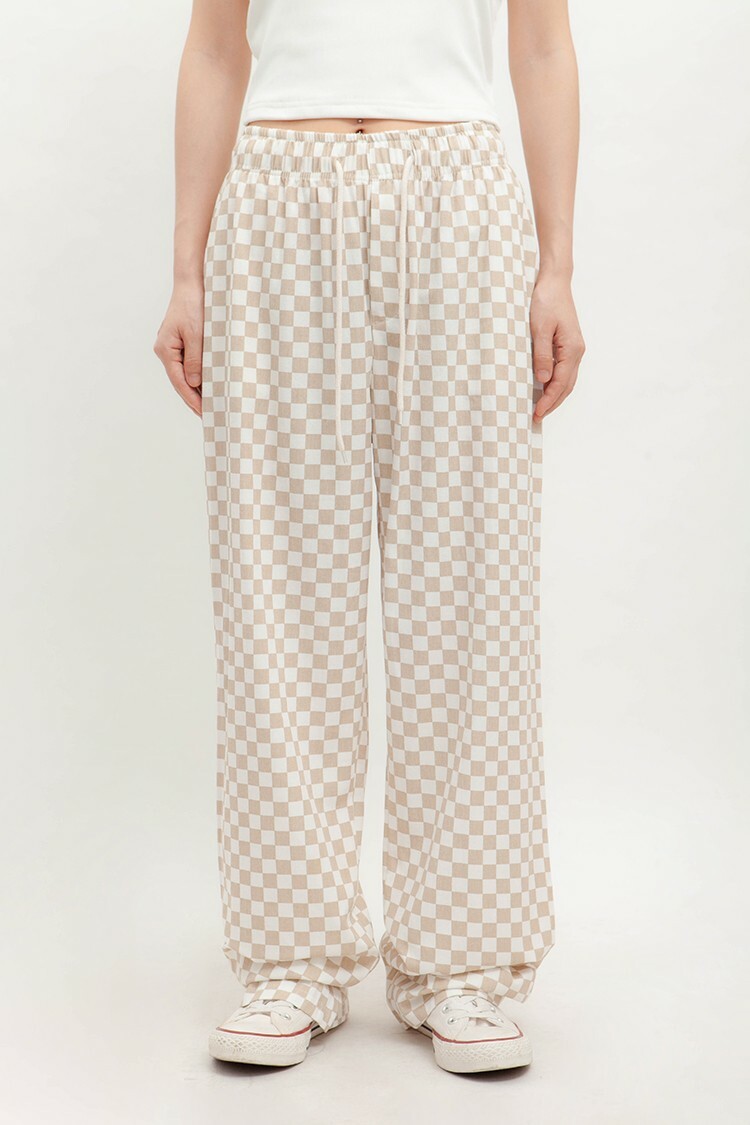 鬆緊褲頭,抽繩設計,白駝格紋相間,兩側斜插袋,背面右側口袋,寬鬆版型。