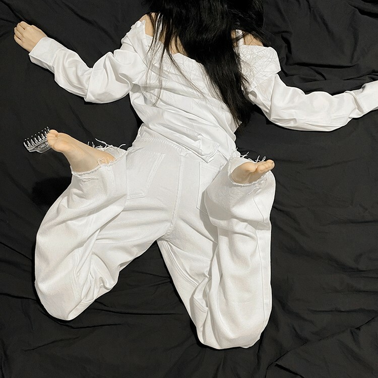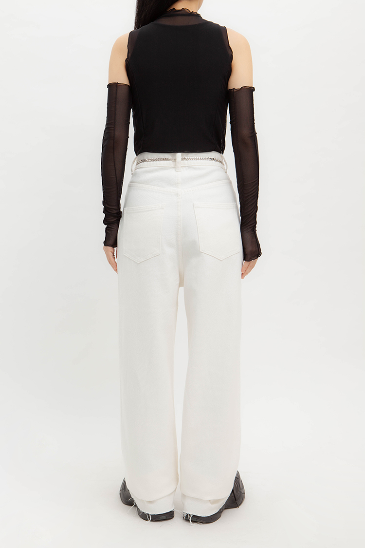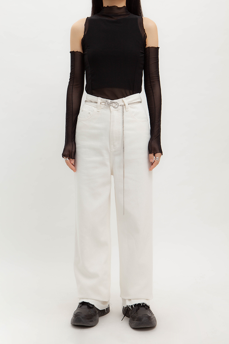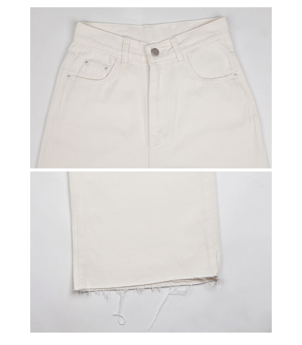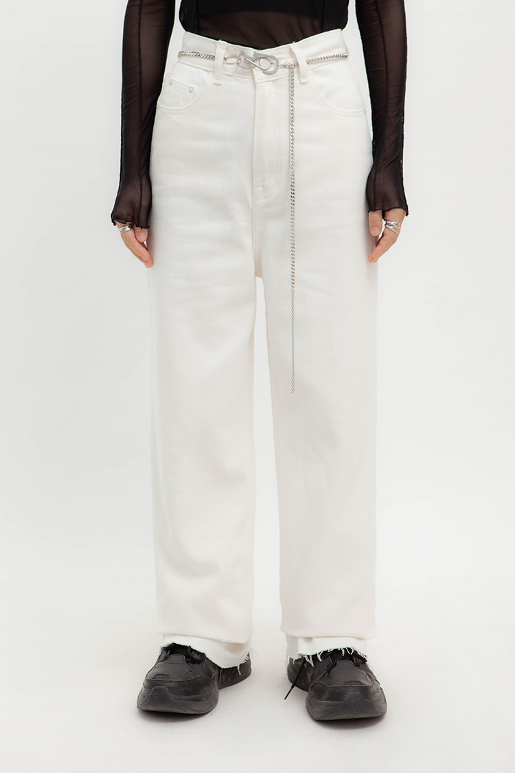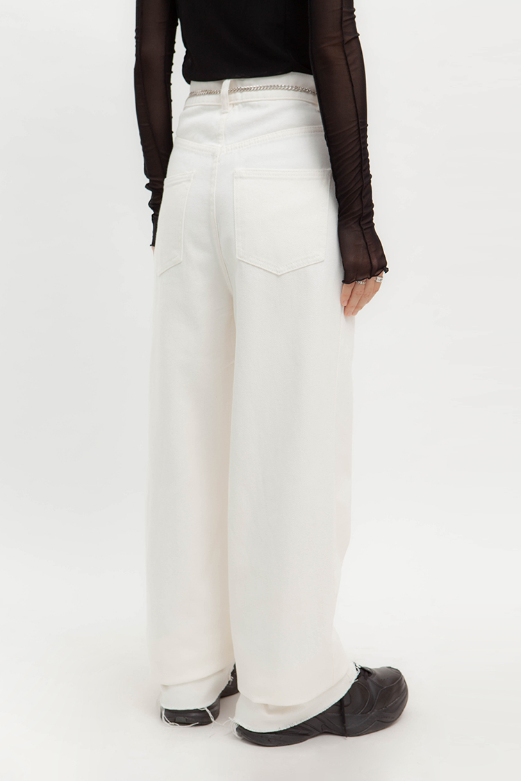 高腰,超長直筒寬褲,前鈕釦拉鍊閉合,五口袋,可向上反折或是裁剪自己喜歡的長度,下擺鬚邊處理,牛仔布料觸感舒適柔軟。