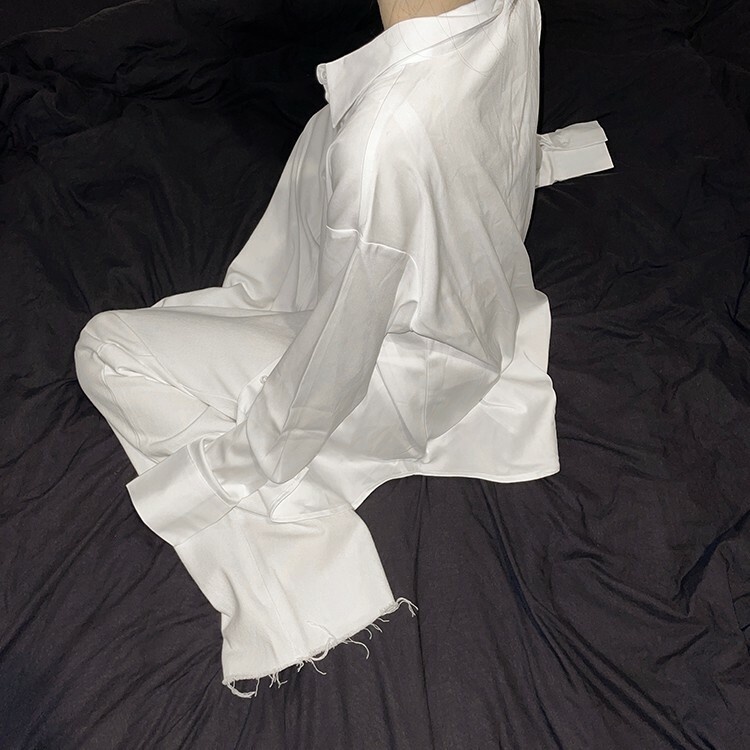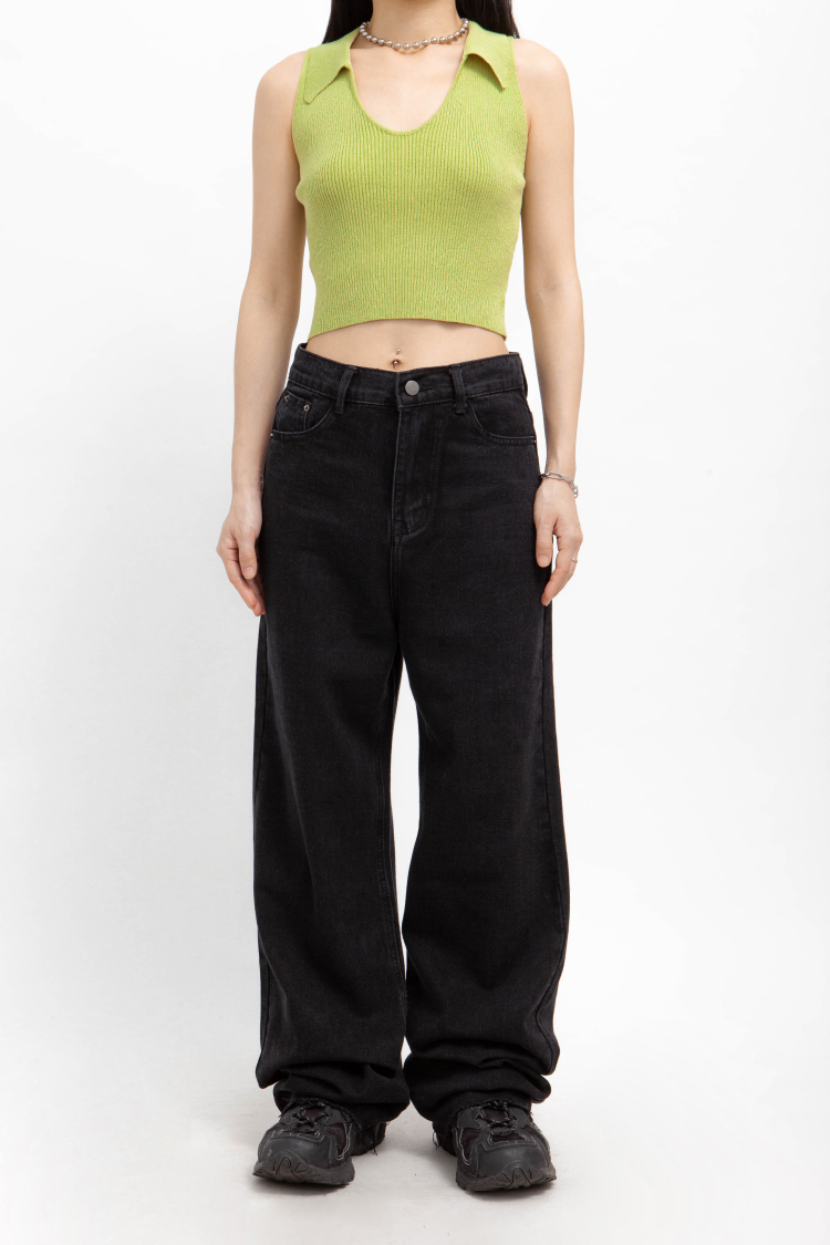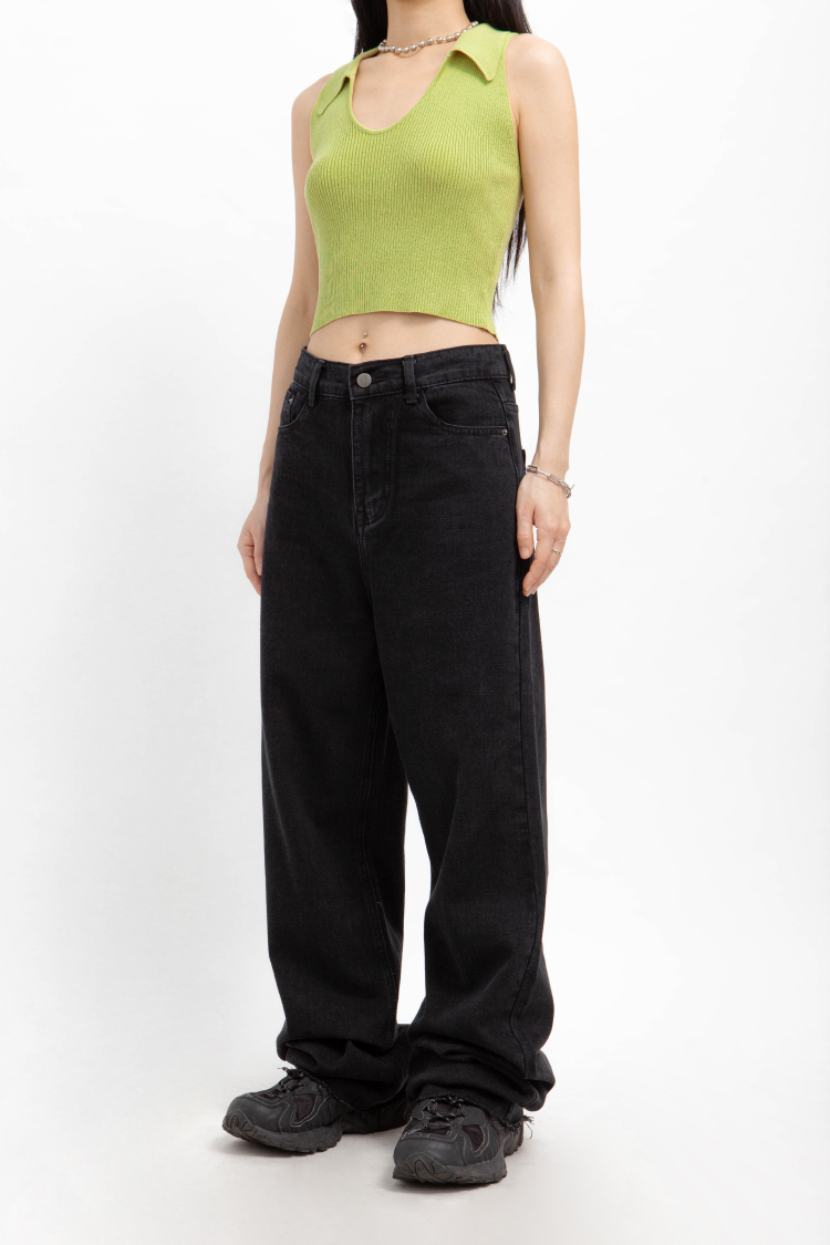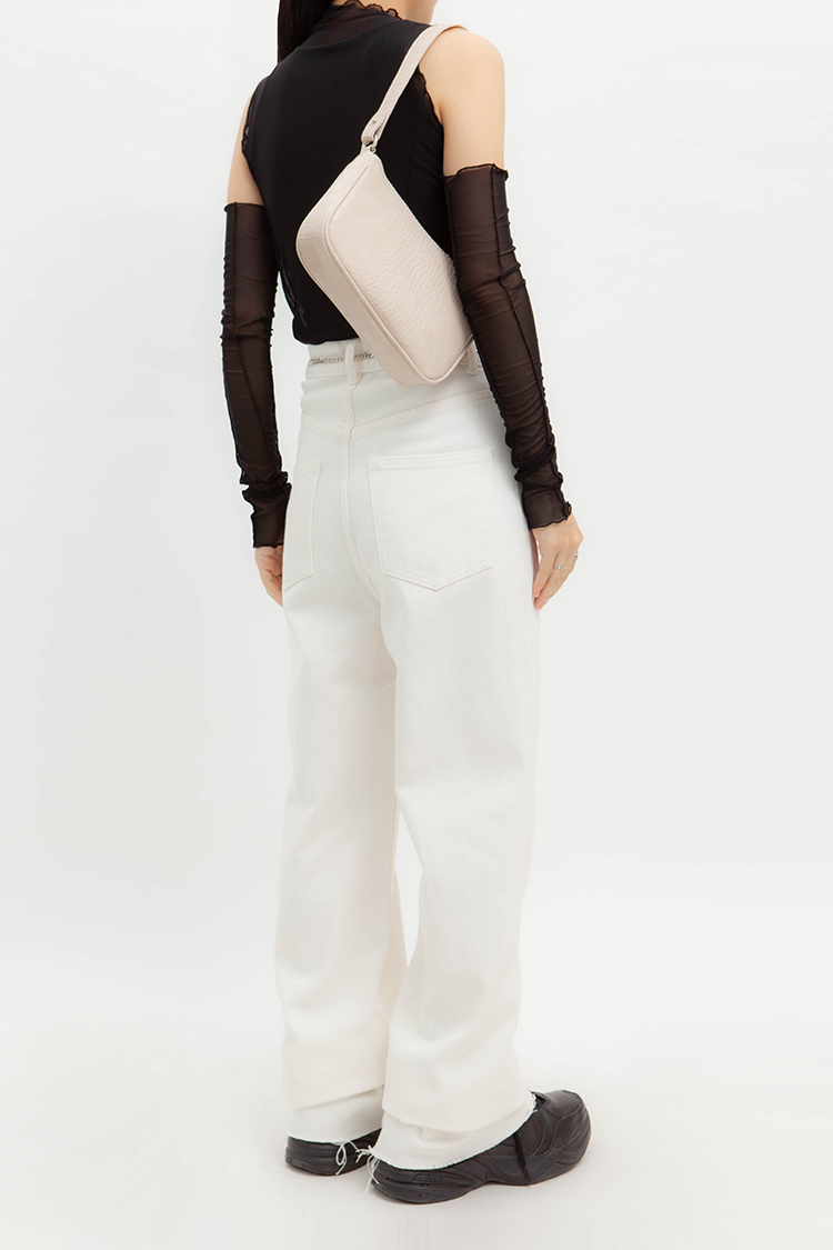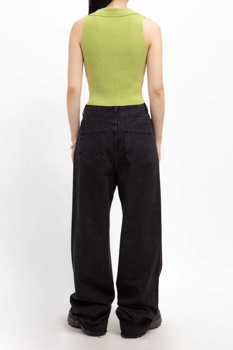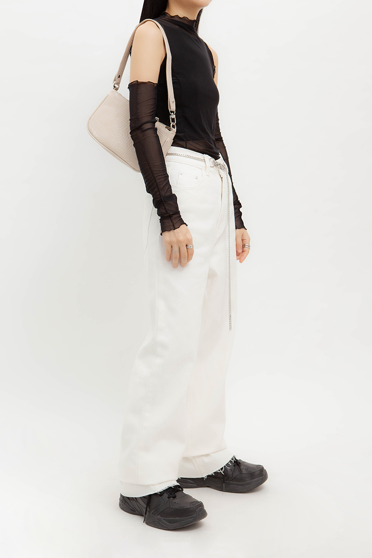 高腰,超長直筒寬褲,前鈕釦拉鍊閉合,五口袋,可向上反折或是裁剪自己喜歡的長度,下擺鬚邊處理,牛仔布料觸感舒適柔軟。