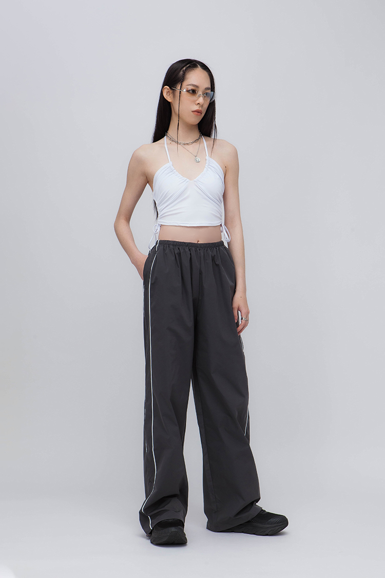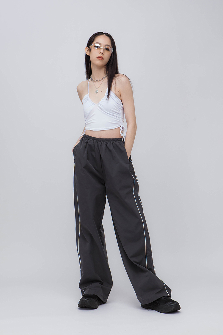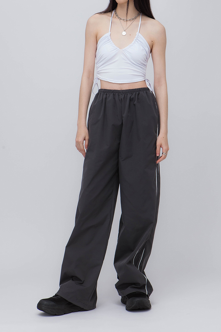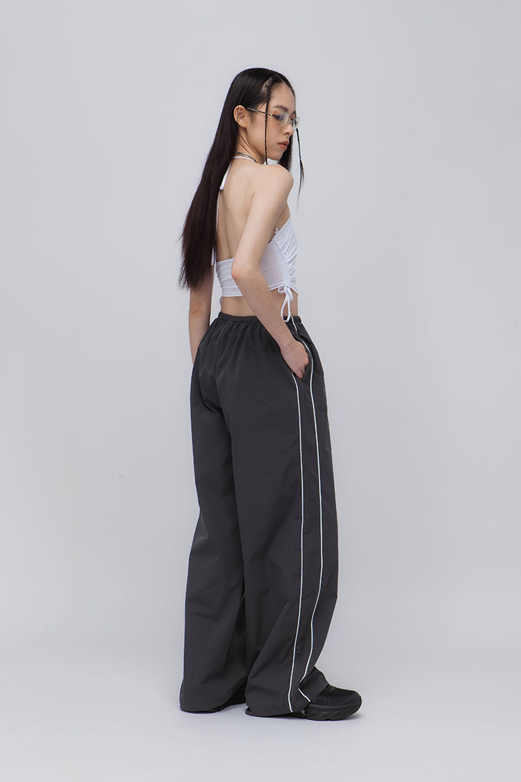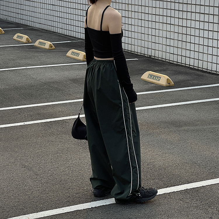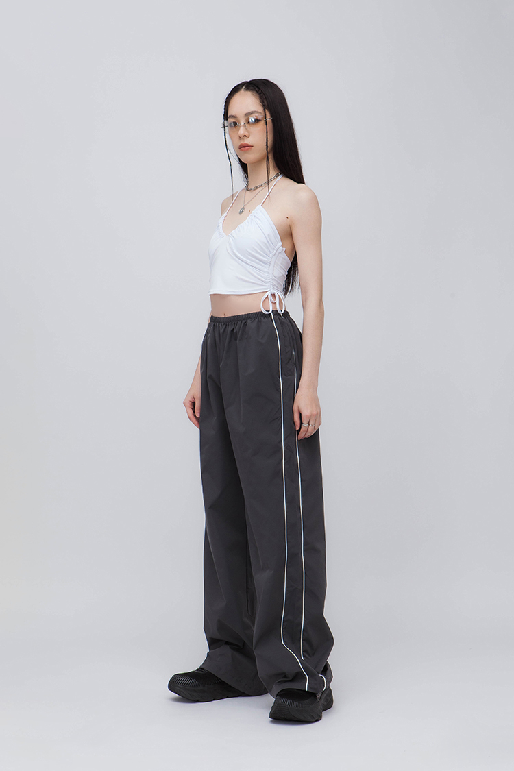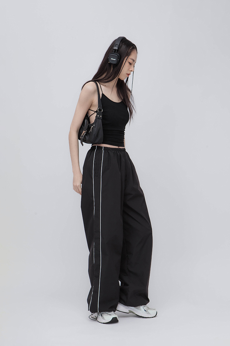 鬆緊褲頭,中腰,側口袋與條紋設計, 寬鬆輕薄,直筒剪裁,不會感到悶熱,下擺抽繩束口,可調整褲子長度,風衣材質,在日常生活和運動中輕鬆穿搭。