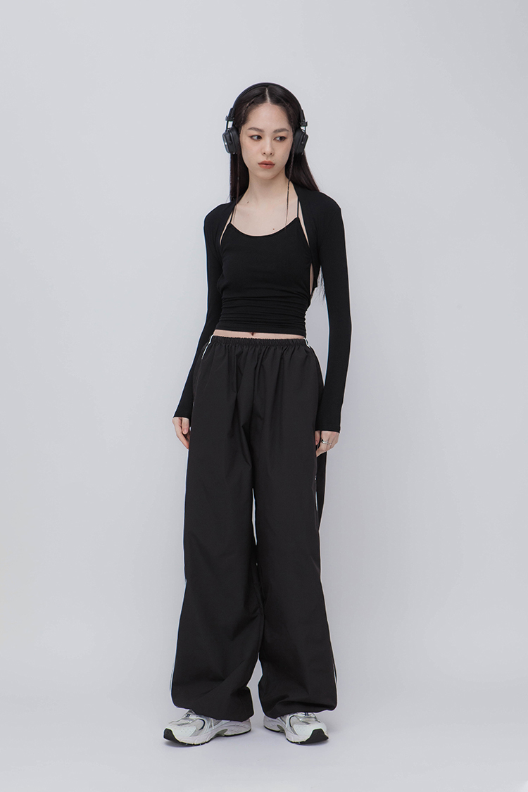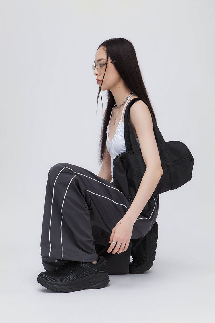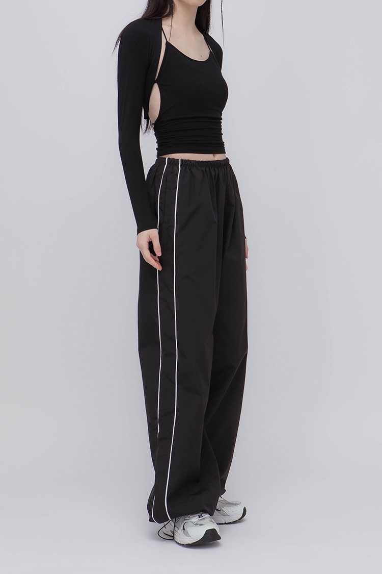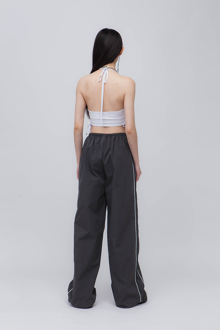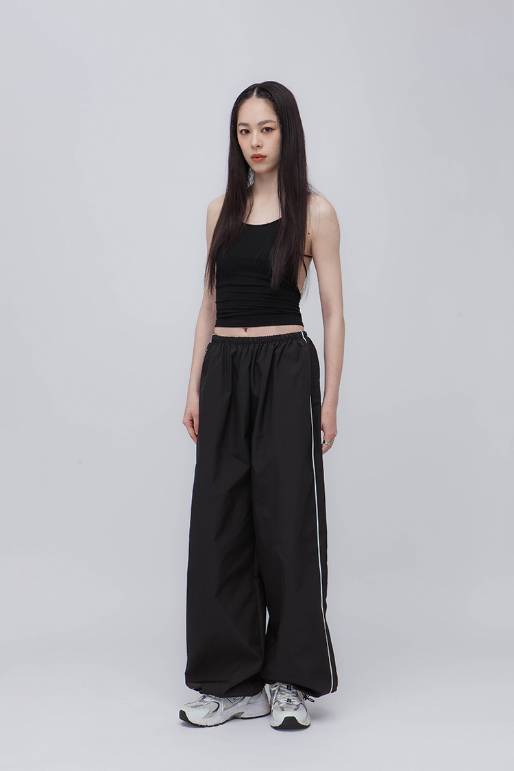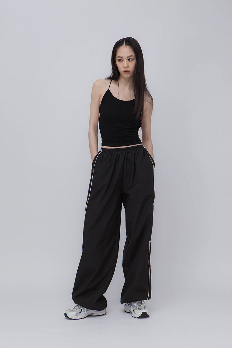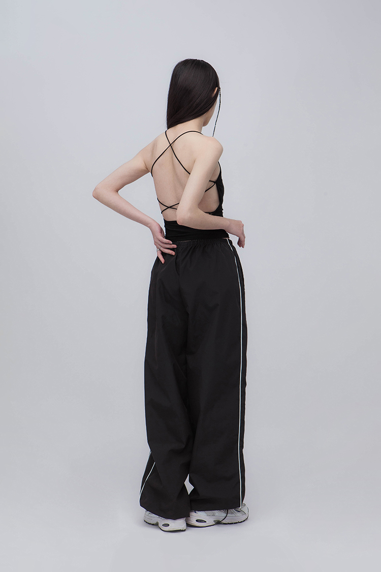 鬆緊褲頭,中腰,側口袋與條紋設計, 寬鬆輕薄,直筒剪裁,不會感到悶熱,下擺抽繩束口,可調整褲子長度,風衣材質,在日常生活和運動中輕鬆穿搭。
