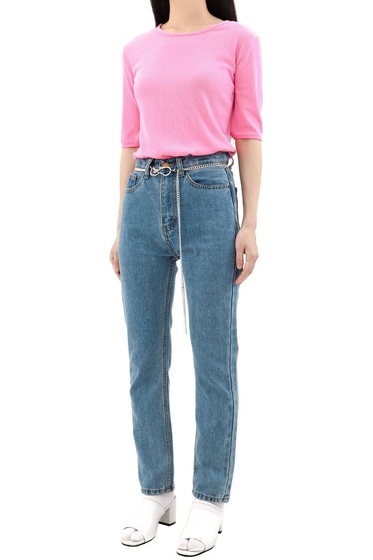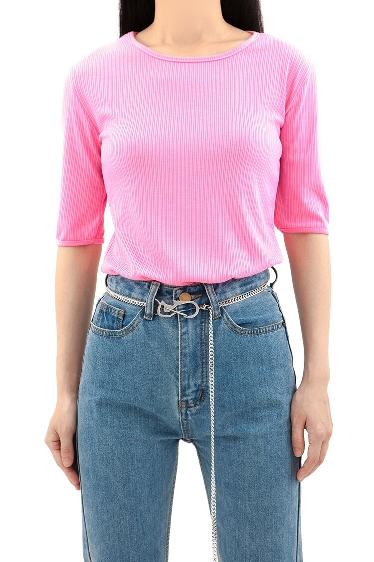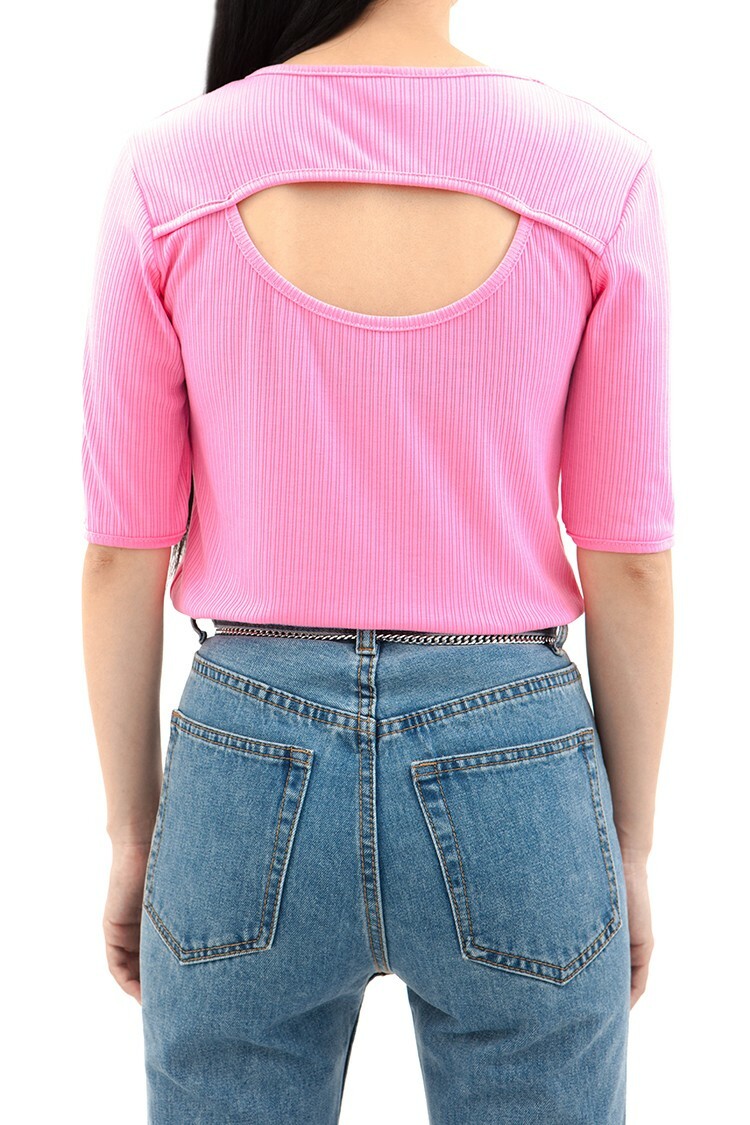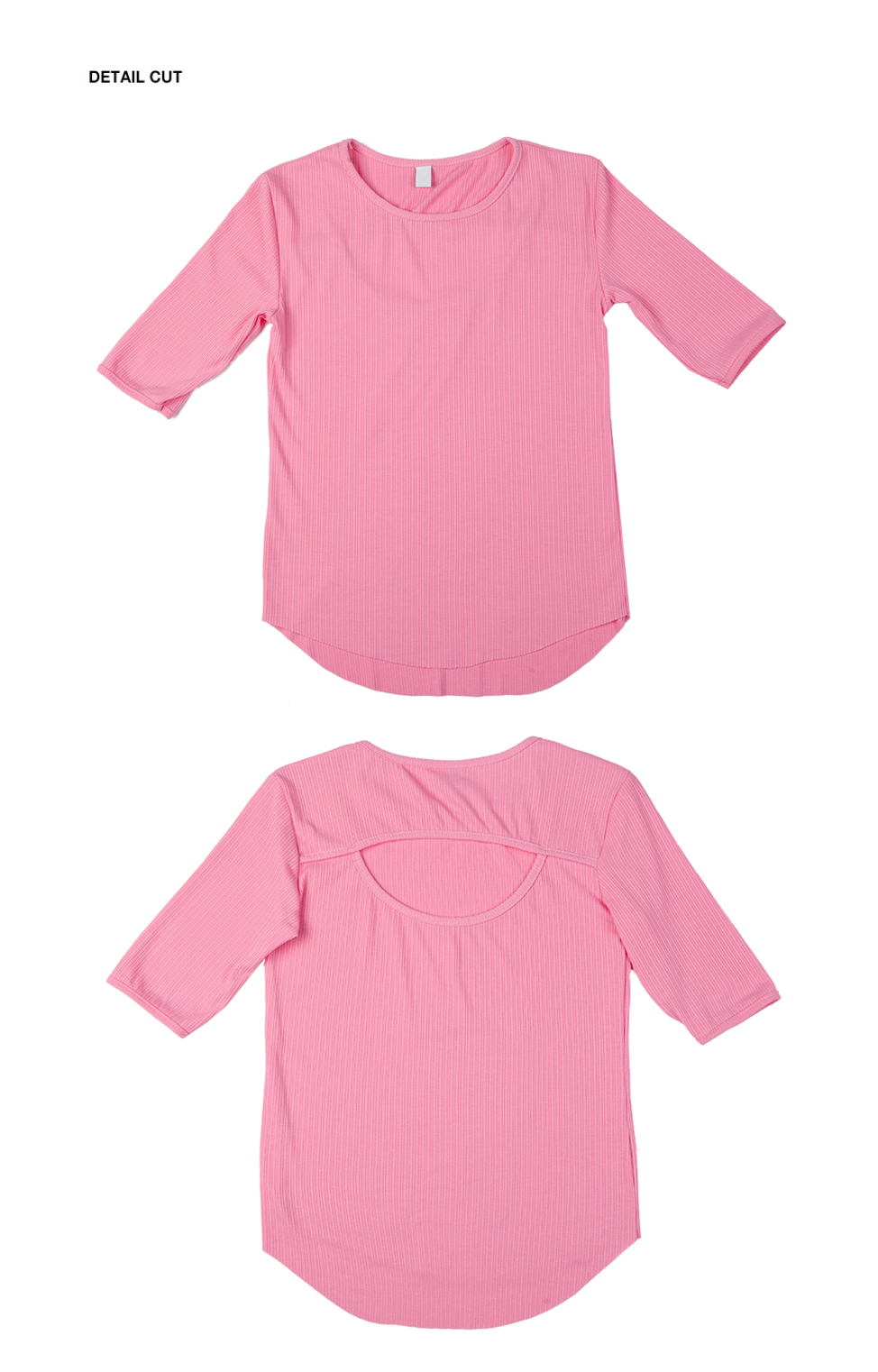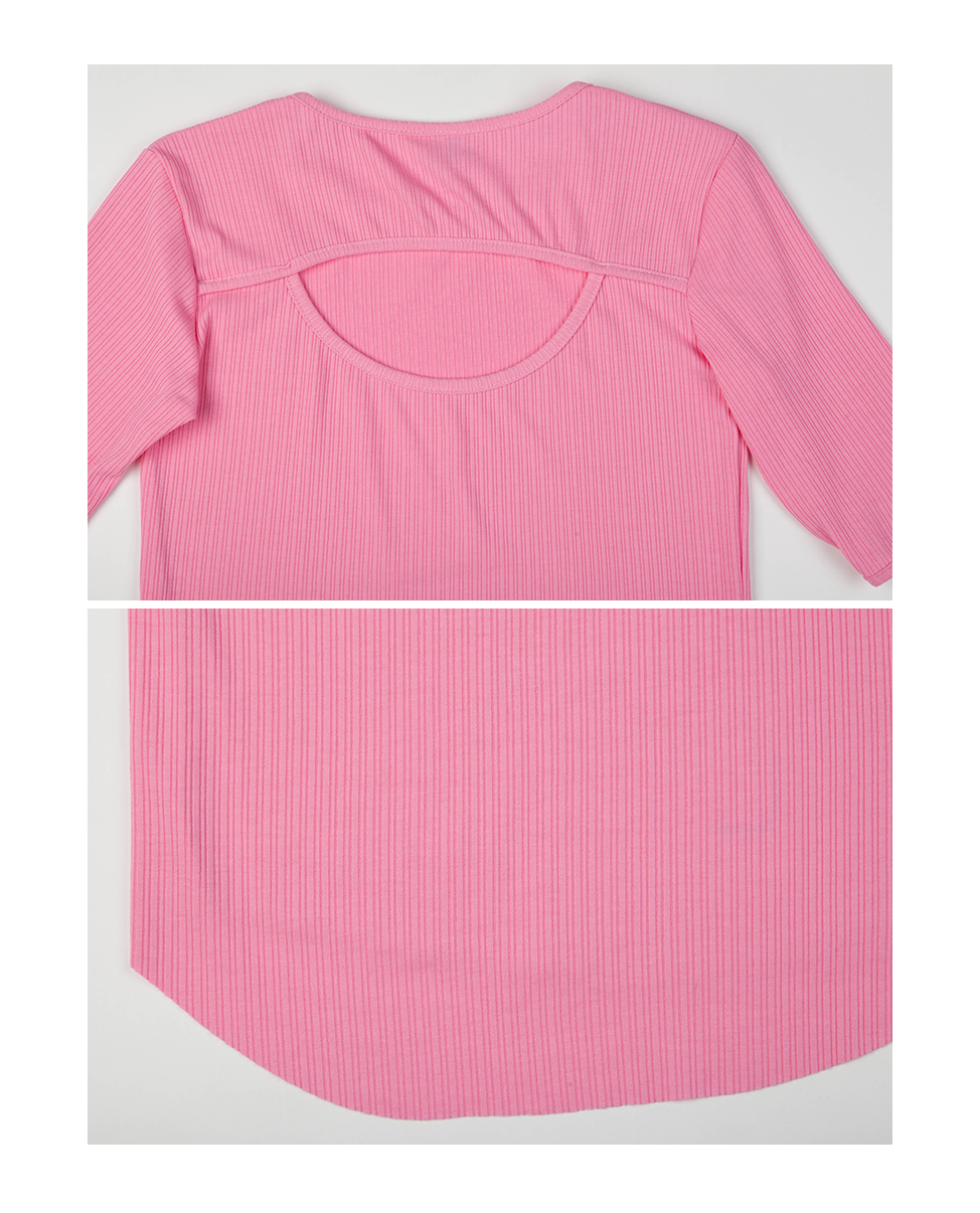 鏤空螺紋T恤,圓領,背面鏤空設計,彈性極佳,粉色特別吸引眼球。