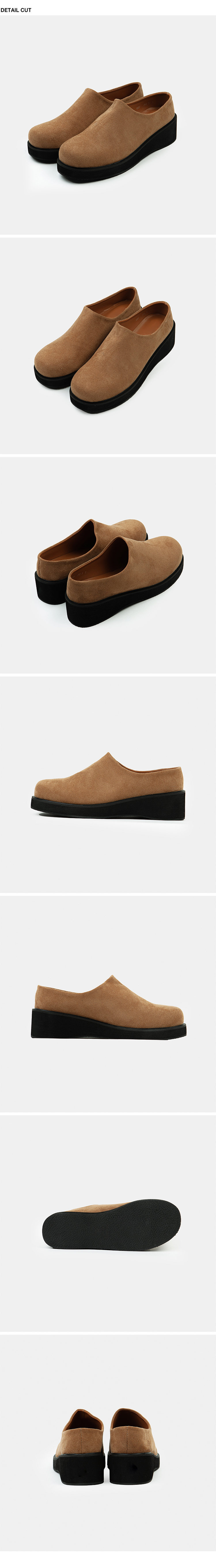 麂皮厚底穆勒鞋,圓頭,質樸麂皮材質,前低後高底部設計,視覺延伸,穿脫方便的特性,適合與秋冬服裝顏色互相碰撞,產生低調復古慵懶氛圍。