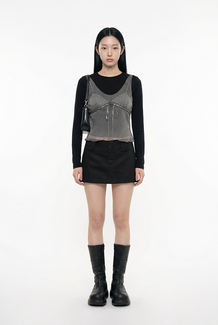 胸前可調節的精緻綁繩設計,搭配貼心的胸前雙層防護。輕盈微透的圓點紗網布料,隱約透出肌膚層次,輕鬆疊搭內衣、背心、T恤,便能展現率性與微辣並存的現代風格。